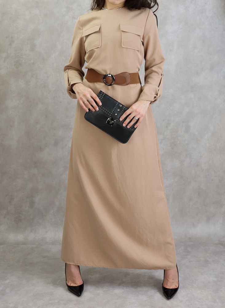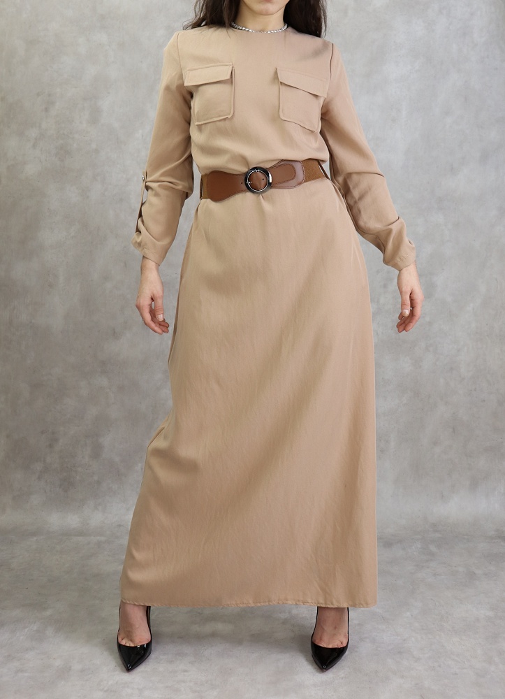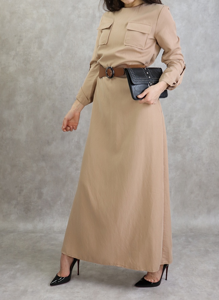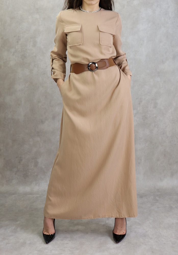 Robe longue, col rond, manches longues ajustables, deux poches plaquée au niveau de buste et poche latérale, fermeture éclair au dos, ceinture à passants, tissu léger non transparent, aussi douce que fluide.