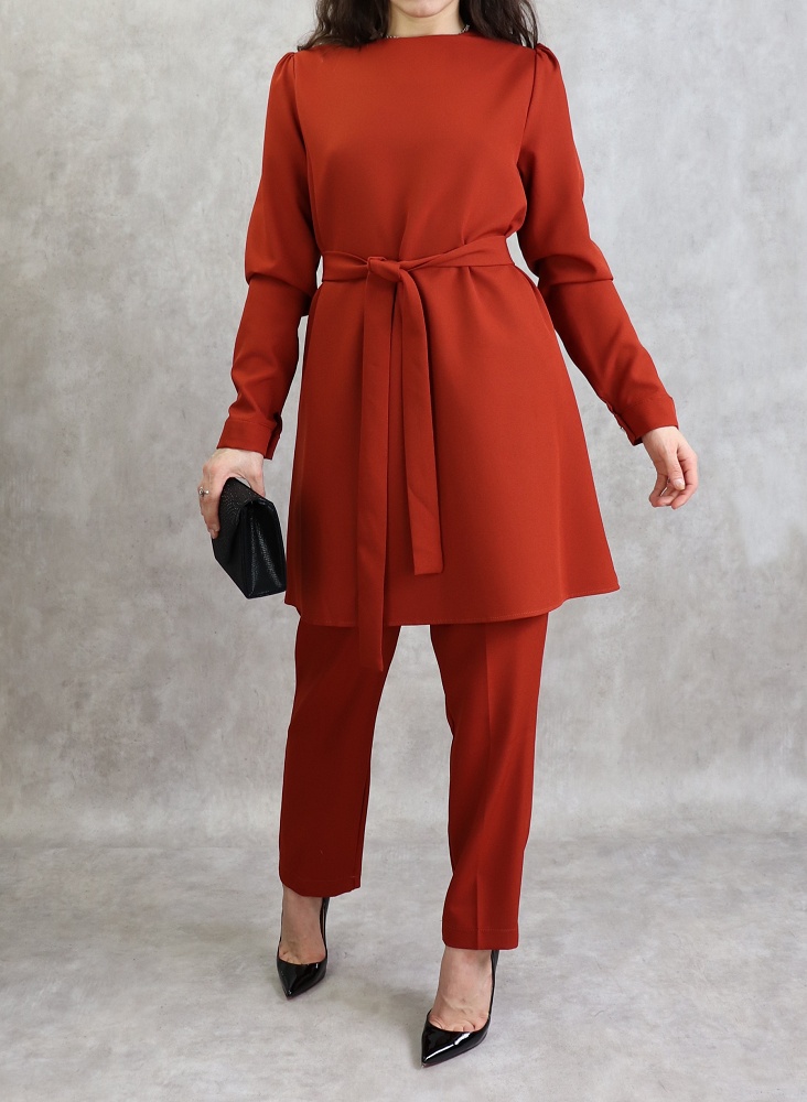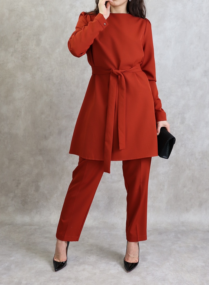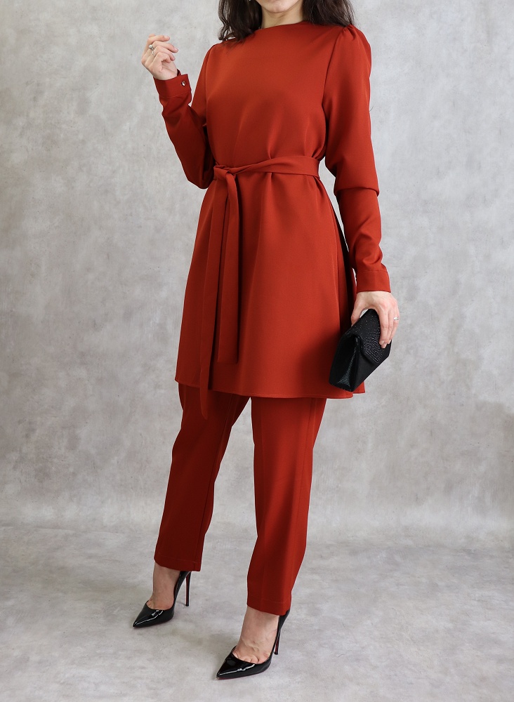 Ensemble 2 pièces. Tunique mi longue, col rond, fermeture bouton, manches finition bouton aux poignets, ceinture assortie, coupe évasée. Pantalon, taille élastique, 2 poches italiennes, coupe classique. Tissu doux, fluide et non transparent.