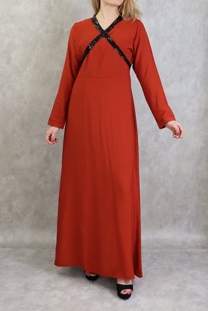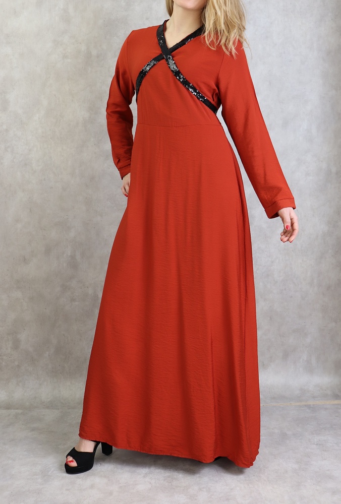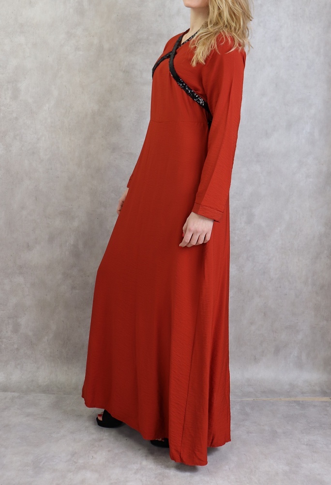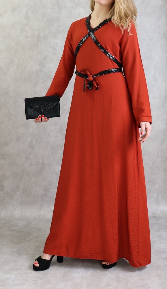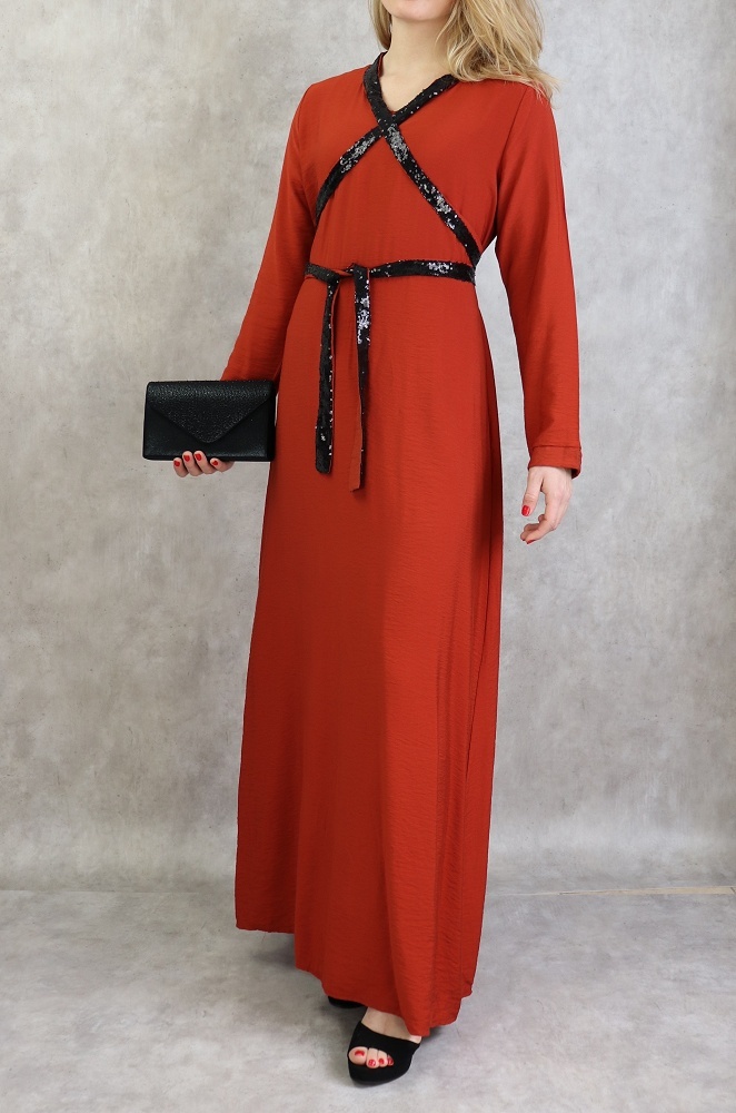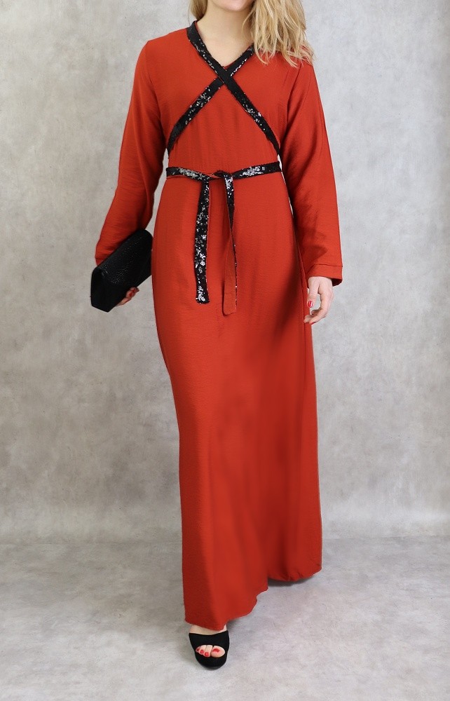 Robe longue croisée à strass de couleur brique Vetement & Accessoire