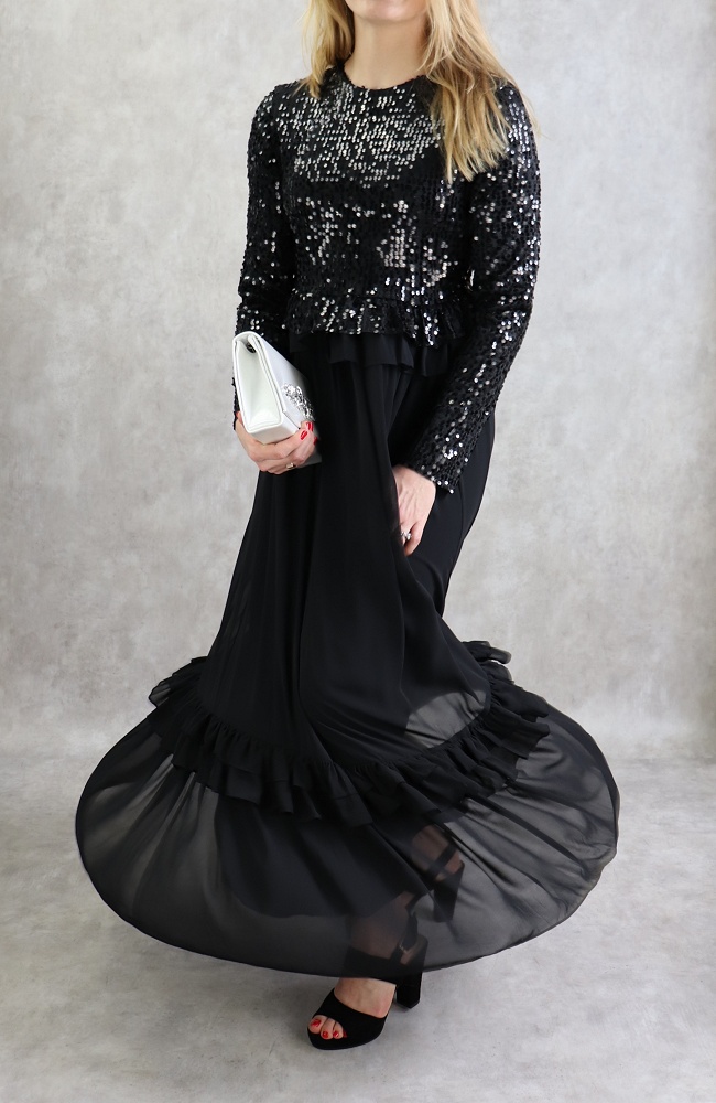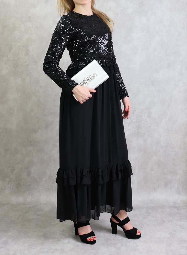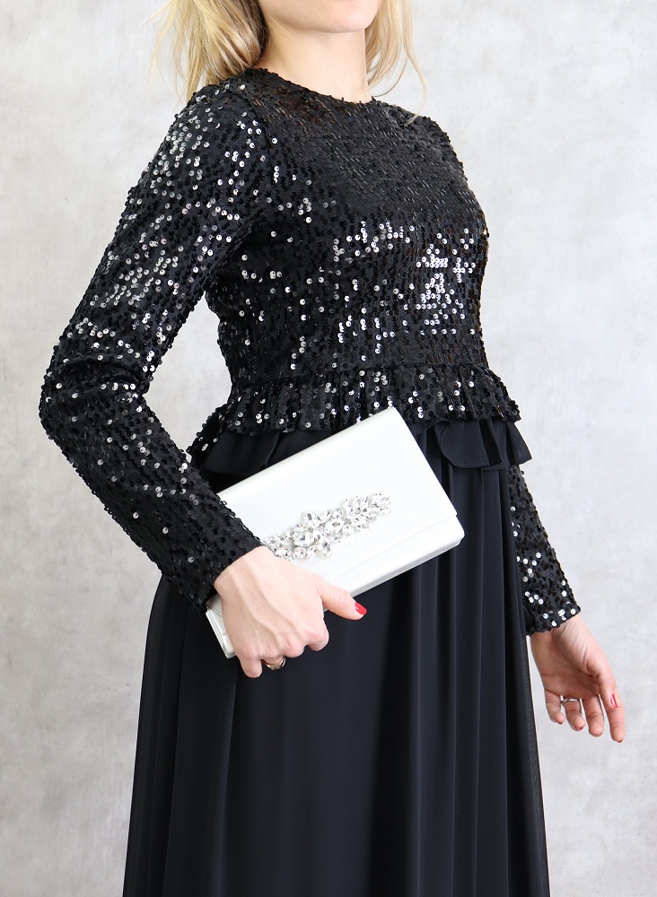 Robe longue, col rond, strass sur tout le buste et les manches, fermeture éclair au dos, taille cintrée, tulle doublée sur la moitié basse de la robe.