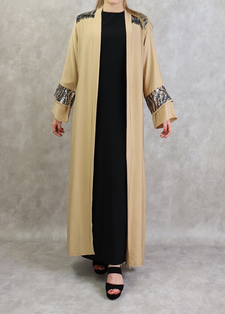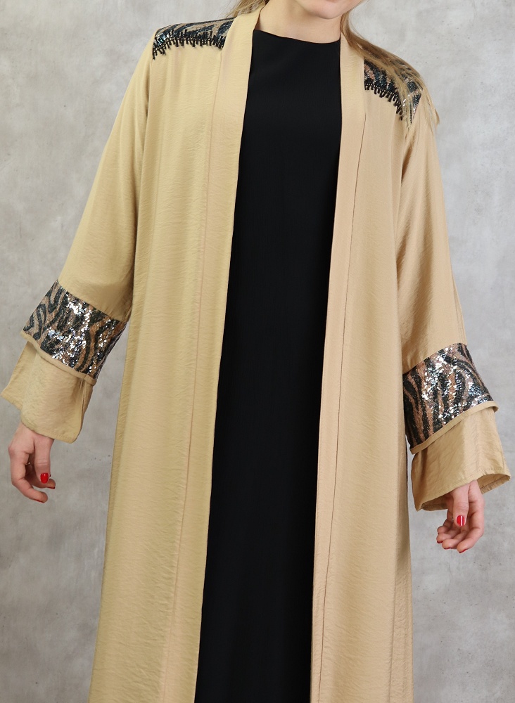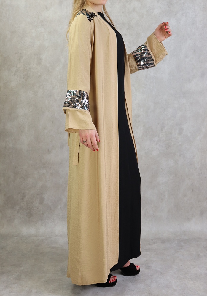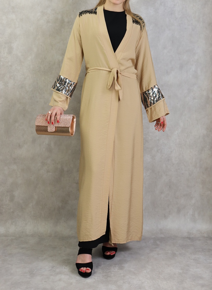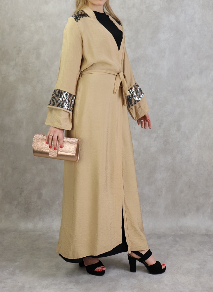 Kimono long, manches larges, ceinture assortie à passant, décorations strass sur les épaules et les poignets, tissu fluide et non transparent.