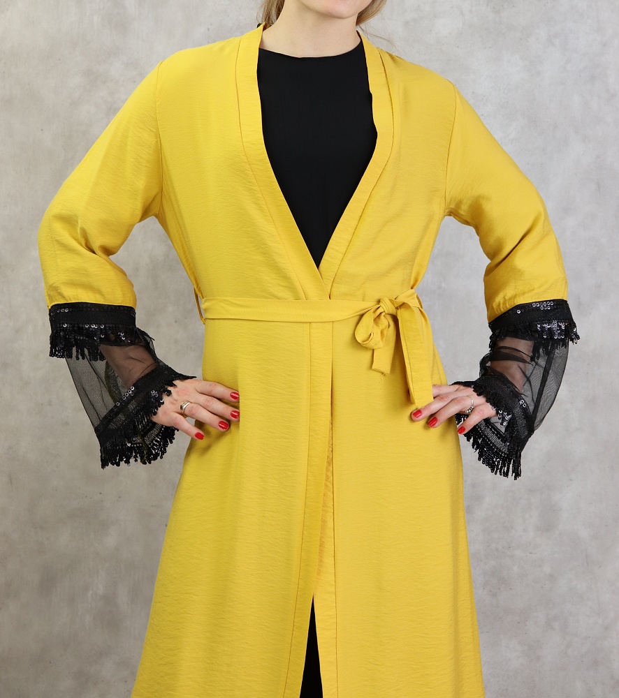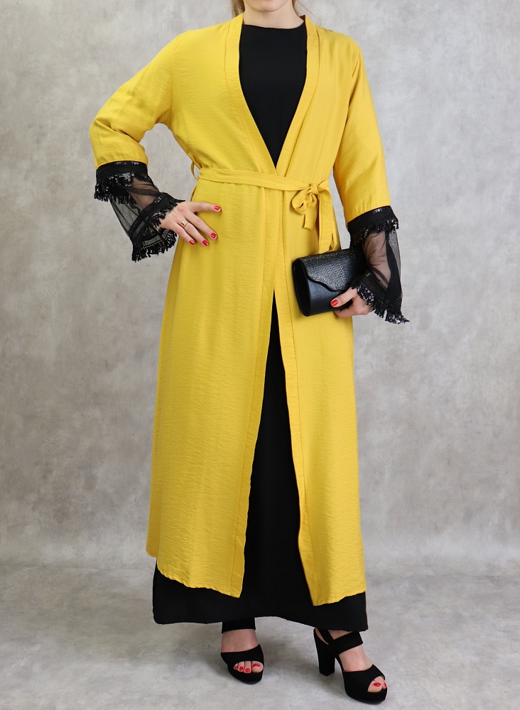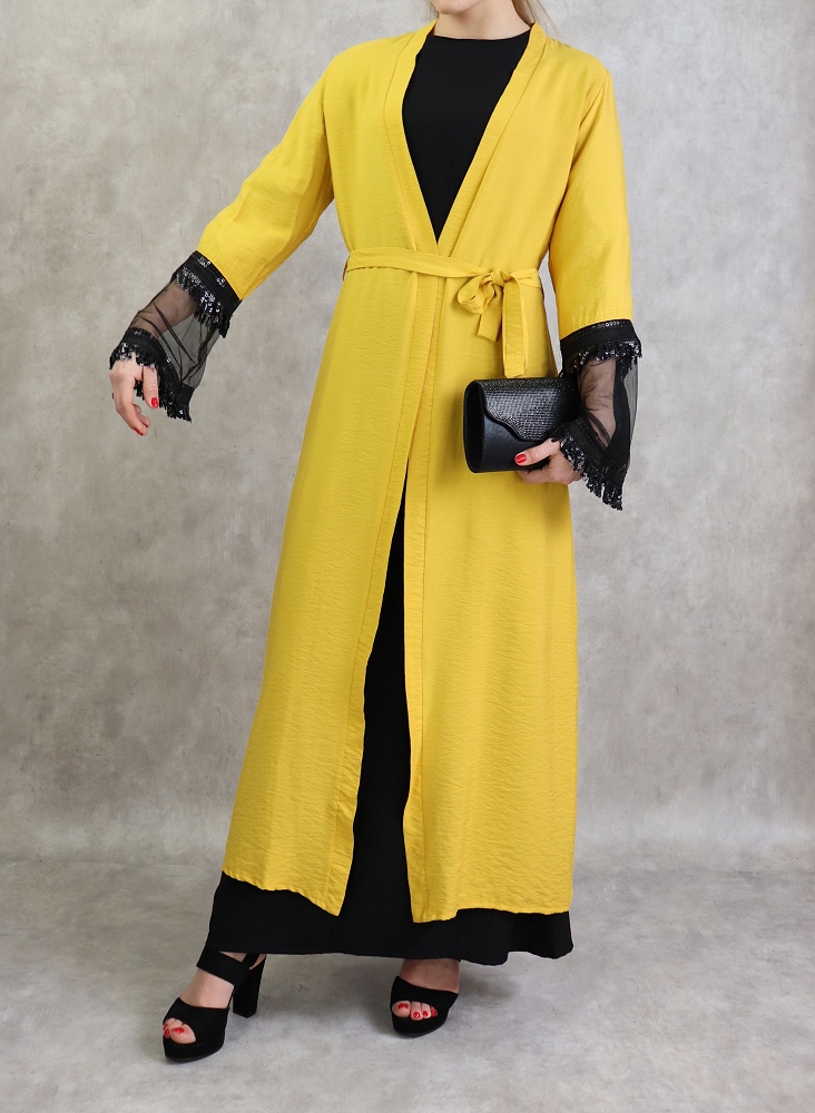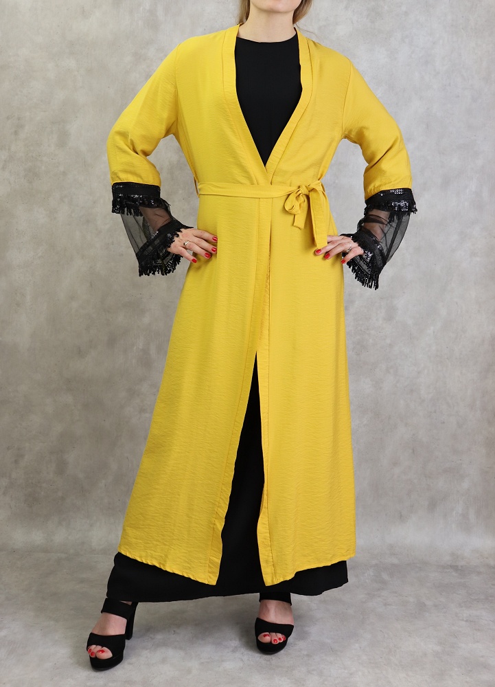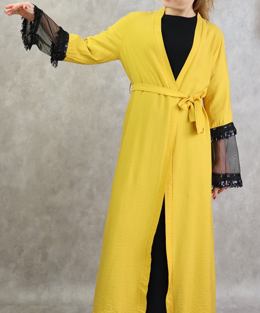 Kimono long, manches décorées de tulles et de strass noirs aux extrémités, ceinture à passants assortie, matière douce et opaque.