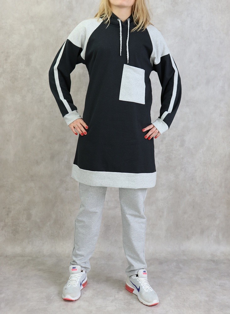 Ensemble survêtement 2 pièces. Sweat : mi long, capuche avec liens de serrage, coupe droite, poche plaquée. pantalon : coupe droite, taille élastique.