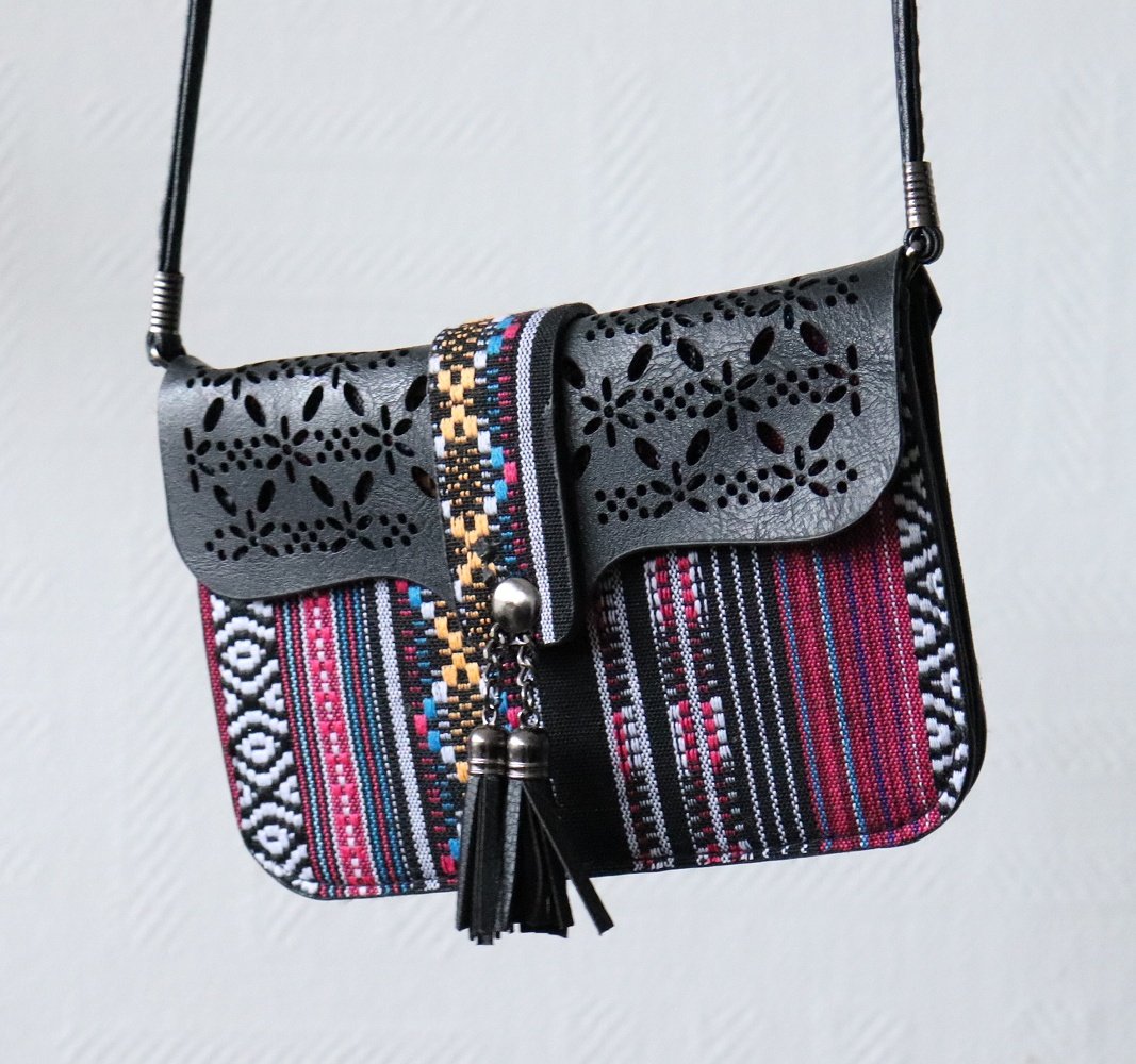 Un très joli sac à main pochette ethnique, plein de couleurs, confectionné avec d' anciennes broderies d' Inde de l' Ouest et du Pakistan. Fermeture à pression. Livré avec une bandoulière en semi cuir.