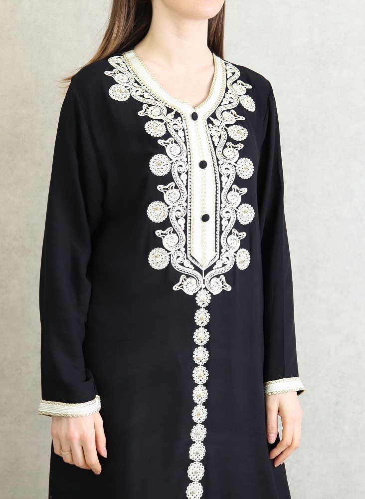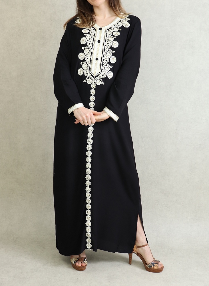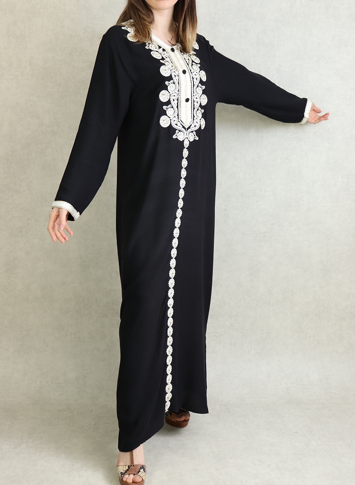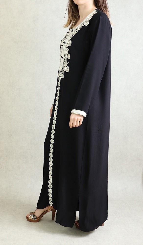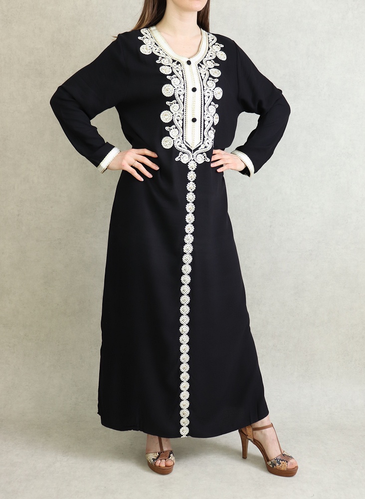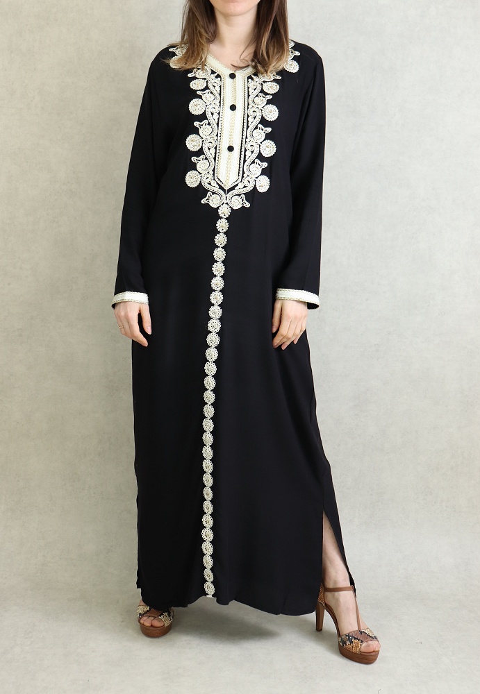 Robe Algérienne longue avec broderie et strass sur toute la longueur ; style caftan. Le double avantage de ce modèle est d'être confortable et élégant à la fois.