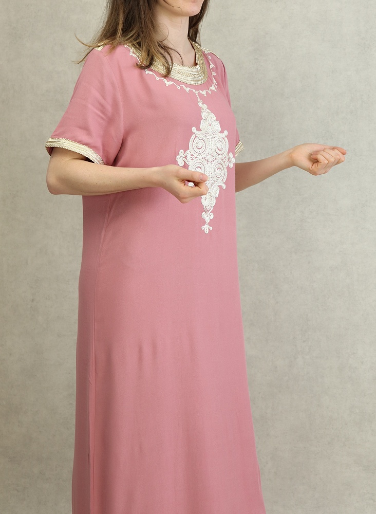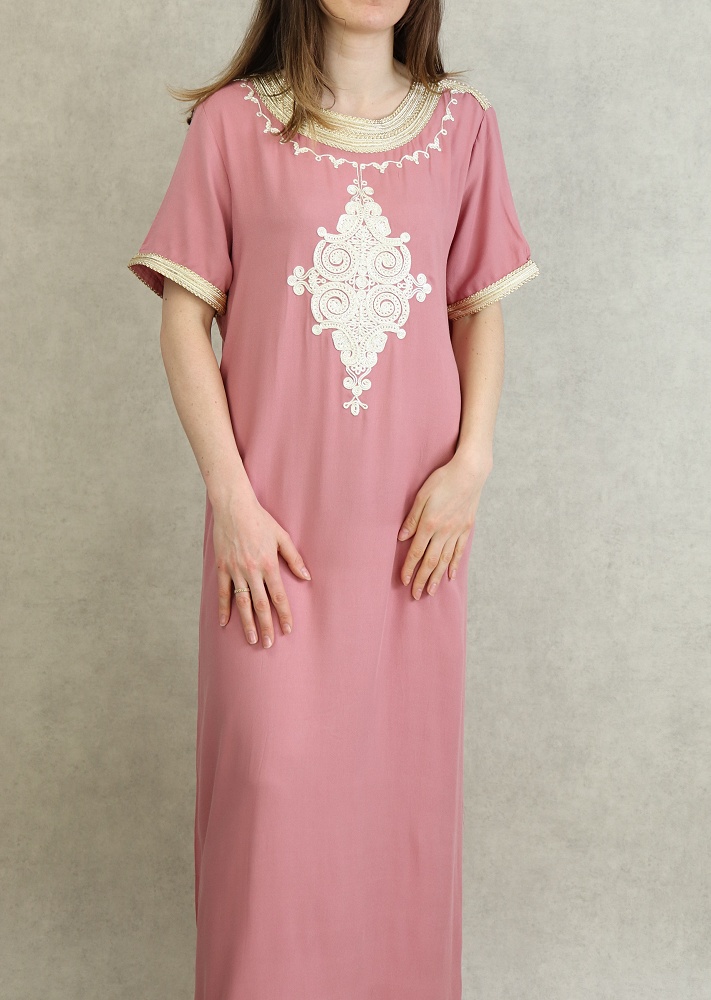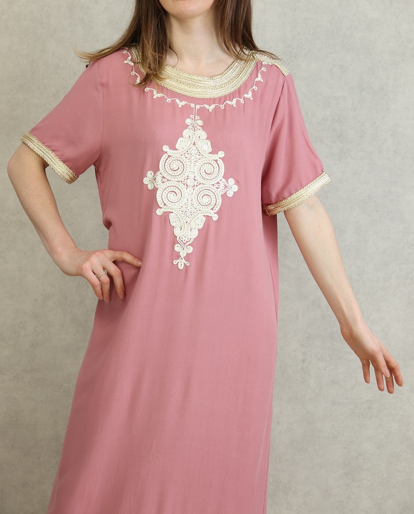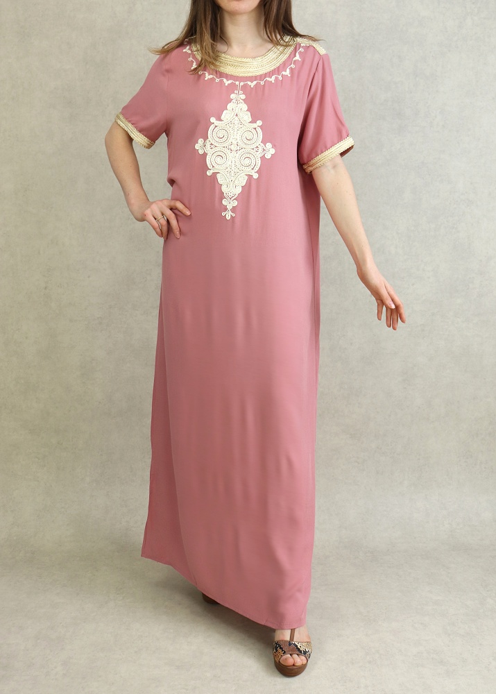 Une robe longue très confortable, manches courtes. Coupe droite avec nombreuses broderies. Matière fluide et agréable de type coton.
