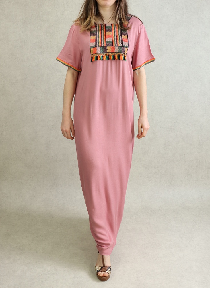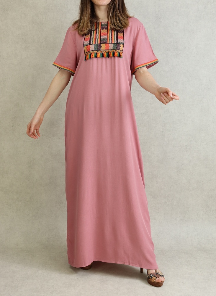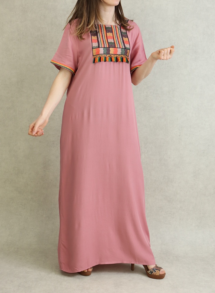 Robe longue manches courtes avec broderie originale - Couleur Vieux Rose Vetement & Accessoire