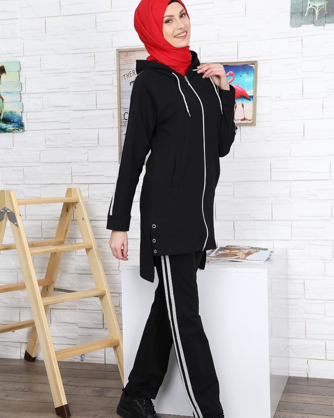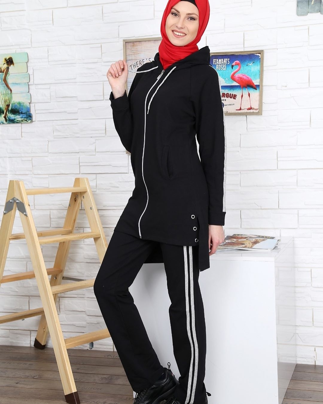 Survêtement 2 pièces. Veste : mi-longue, capuche avec liens de serrage, 2 poches à l'avant, fermeture zippée, coupe droite, matière sweat, rivets de décoration sur les cotés. Pantalon : coupe droite, taille élastique.