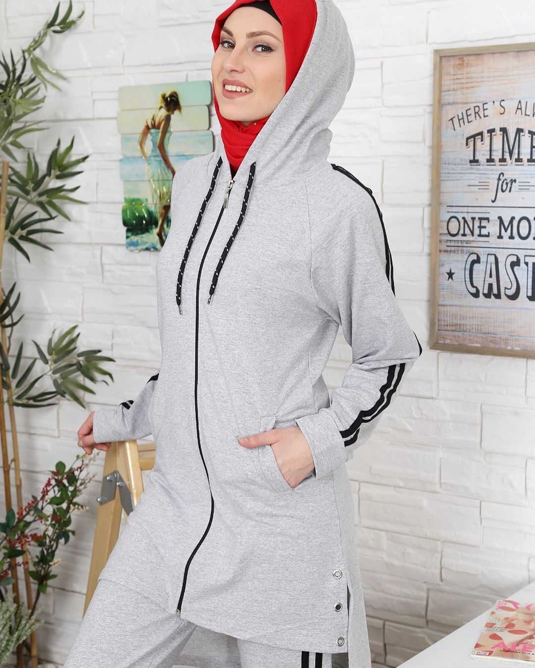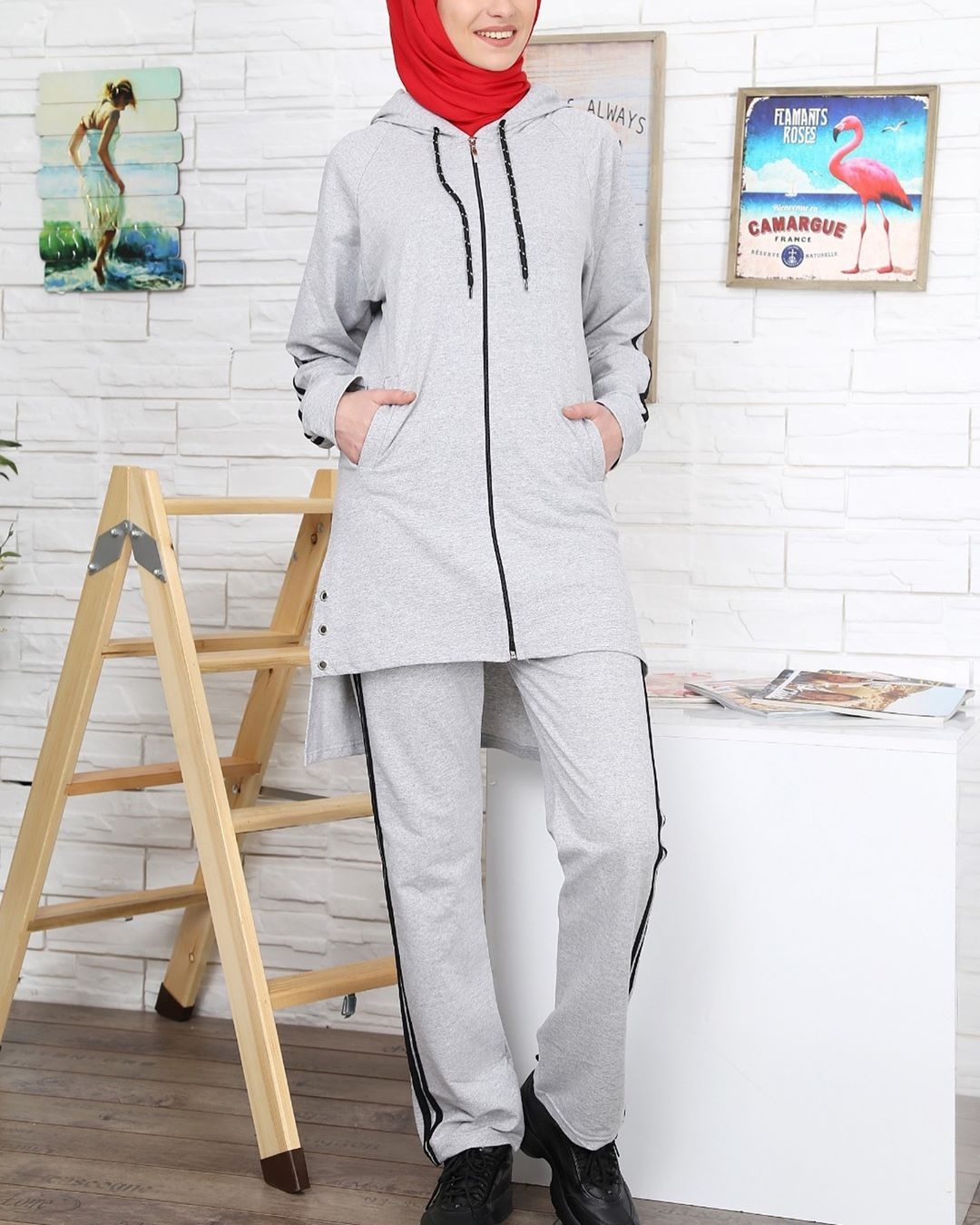 Survêtement 2 pièces. Veste : mi-longue, capuche avec liens de serrage, 2 poches à l'avant, fermeture zippée, coupe droite, matière sweat, rivets de décoration sur les cotés. Pantalon : coupe droite, taille élastique.