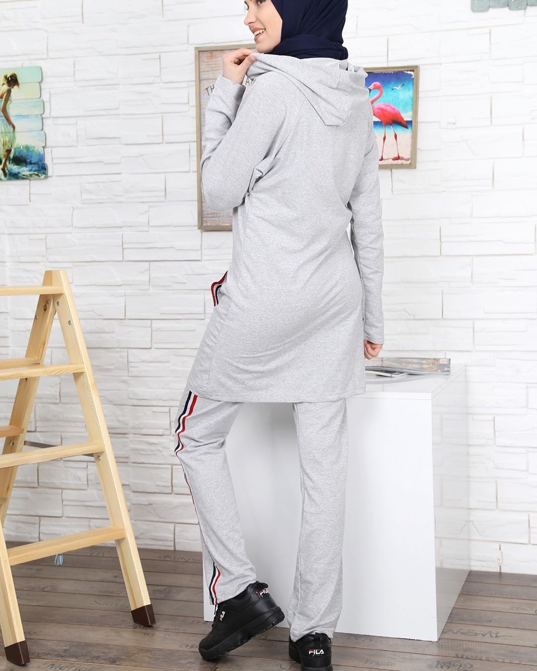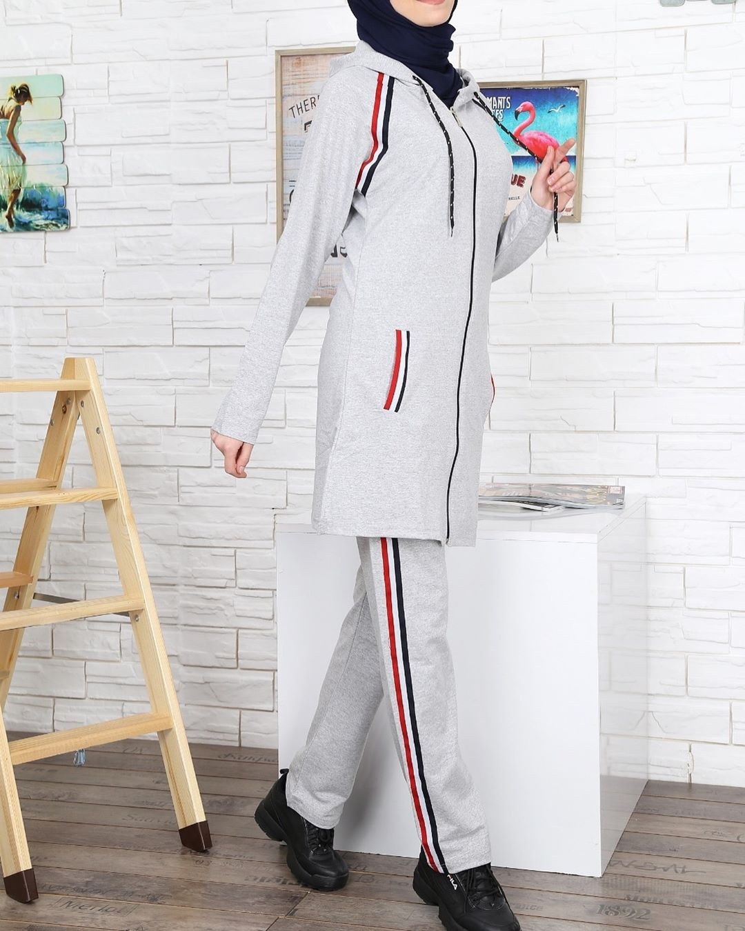 Survêtement 2 pièces. Veste : mi longue, capuche avec liens de serrage, fermeture zippée, 2 poches latérales, coupe droite, matière sweat. Pantalon : coupe droite, taille élastique.