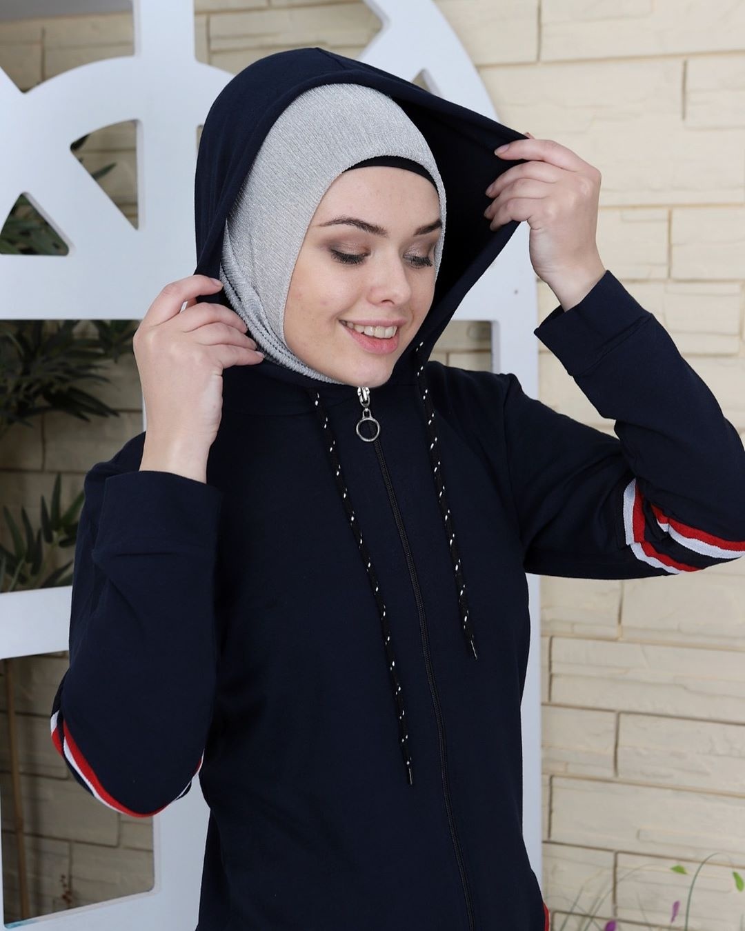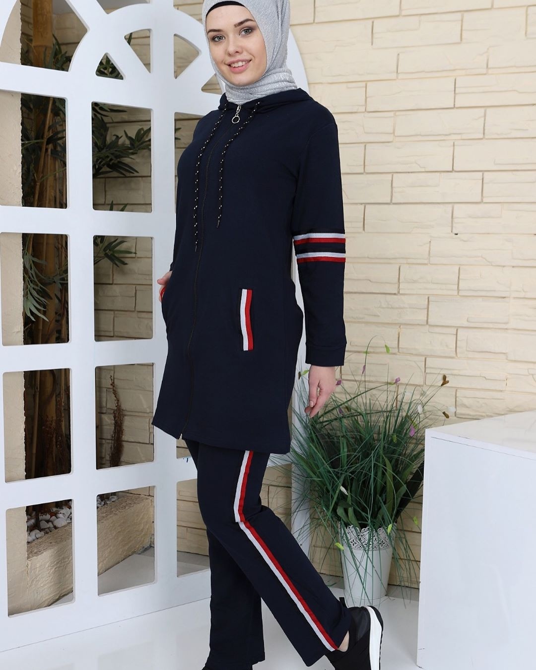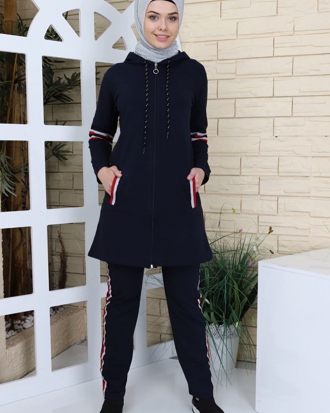 Survêtement femme deux pièces bicolore à capuche (Ensemble sport pas cher - Mode musulmane) - Couleur bleu marine avec bandes blanches - REF. 38277 (19.90 €)