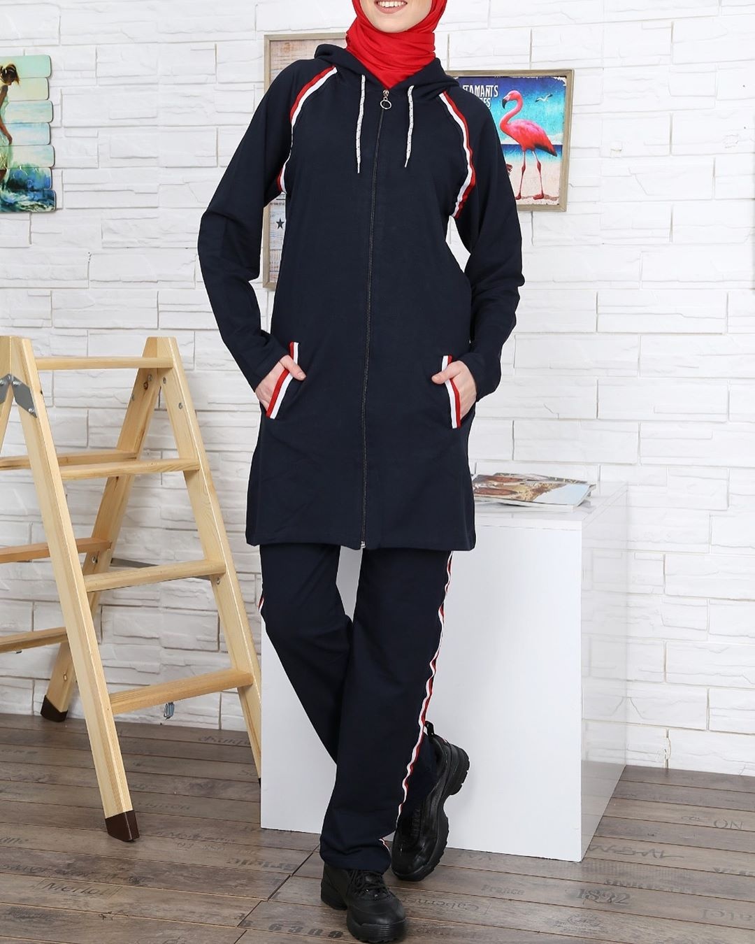 Survêtement 2 pièces. Veste : mi longue, capuche avec liens de serrage, fermeture zippée, 2 poches latérales, coupe droite, matière sweat. Pantalon : coupe droite, taille élastique.
