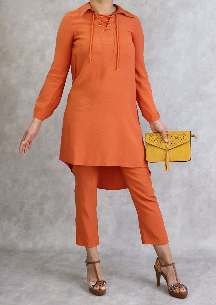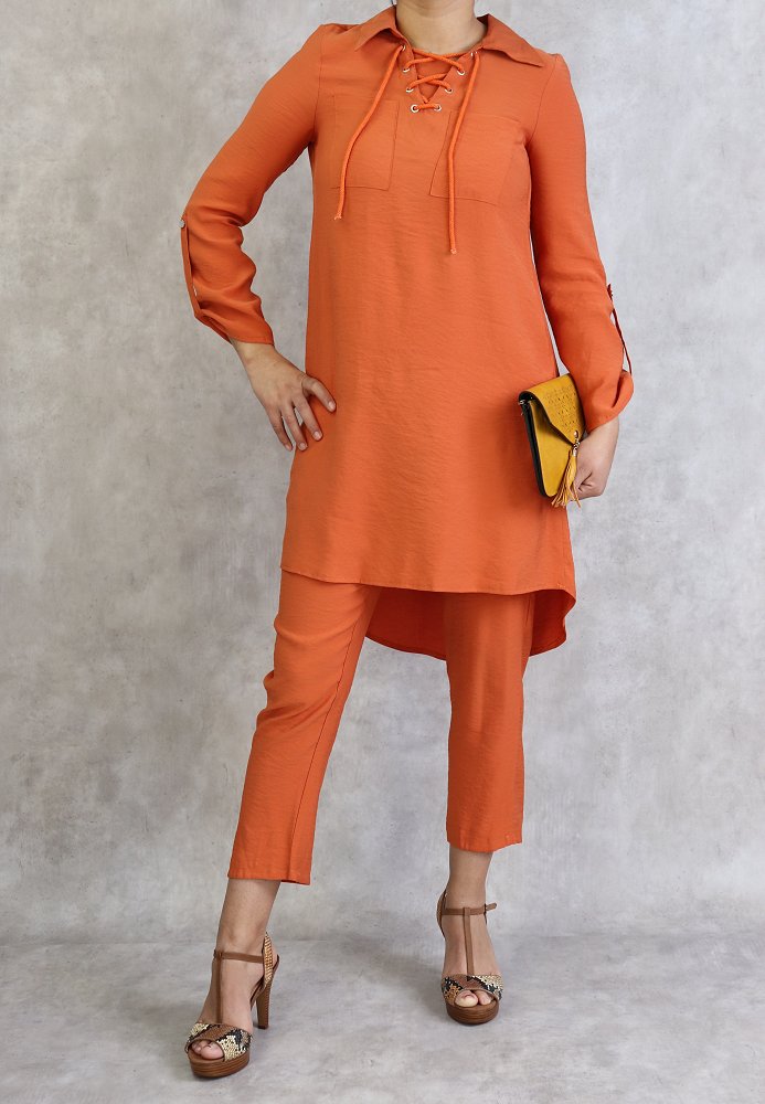 Tunique mi-longue, col avec lien de serrage, manches ajustables, 2 poches plaquées, tissu léger et fluide.