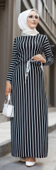 Robe maxi-longue à rayures ceinture intégrée (Vetement femme voilée) - Couleur noire - REF. 33885 (19.90 €)