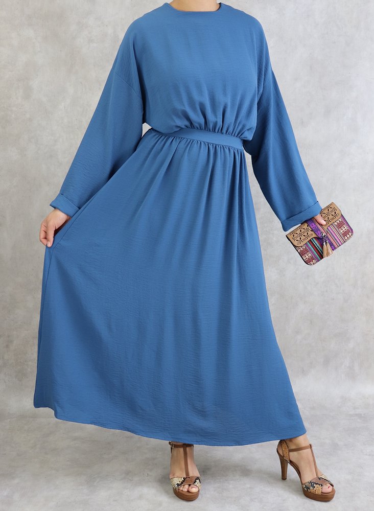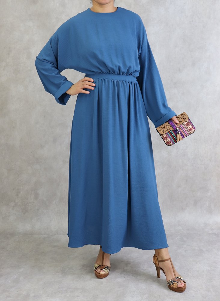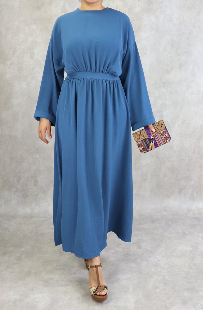 Robe de couleur unie, fluide est ornée de fronces. Deux liens qui peuvent aussi bien se nouer à l’avant comme à l'arrière afin d'obtenir un effet cintré. Coupe arrondie et taille resserrée pour cette robe longue à manches évasées et larges.