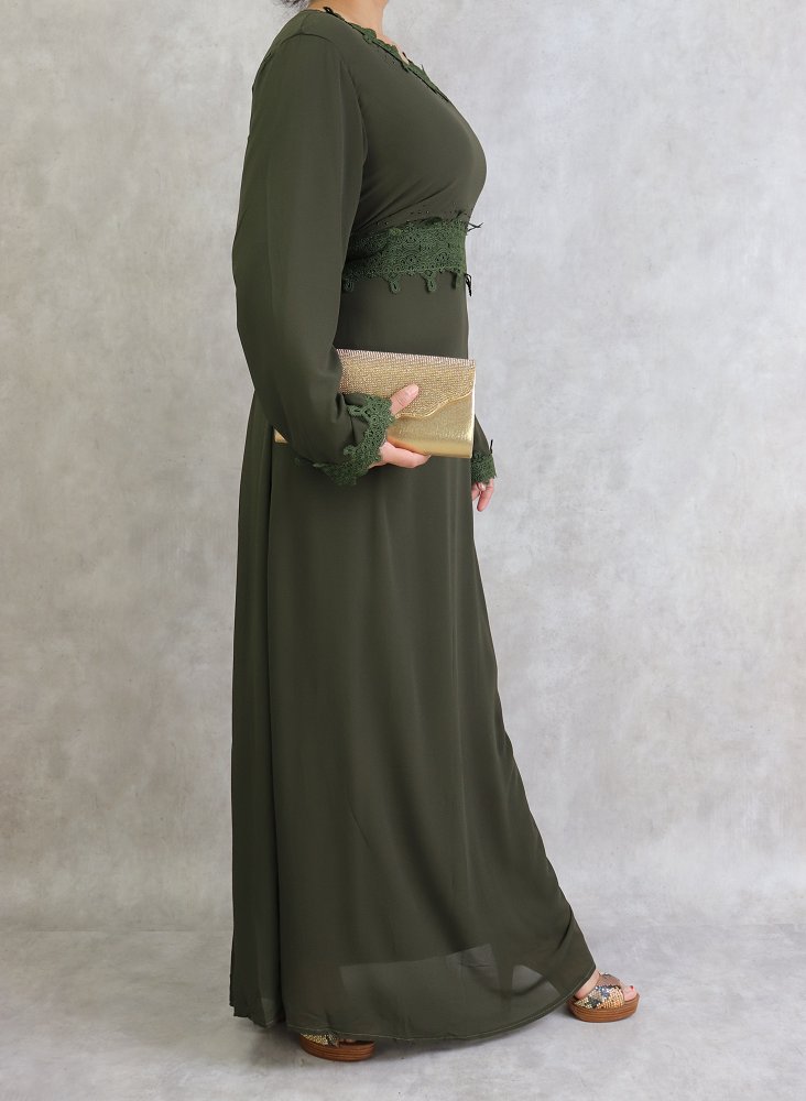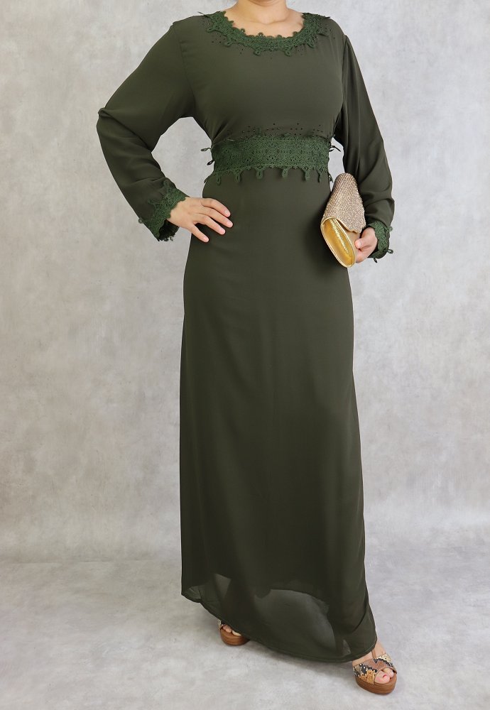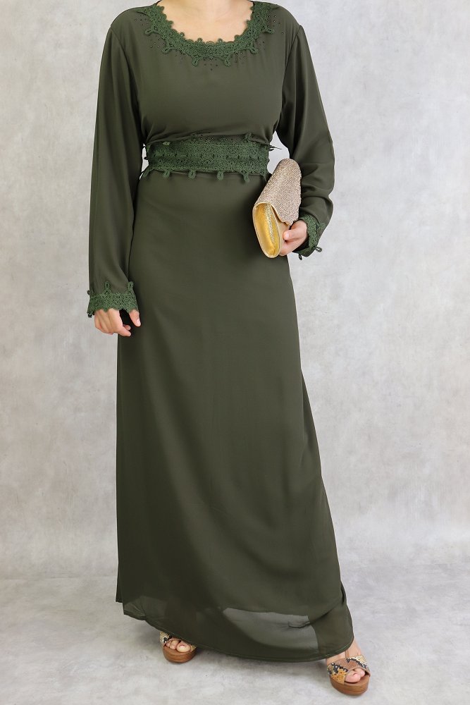 Robe à dentelles et strass sur un col dégagé ainsi que sur la taille et les poignets. Intégralement doublée. 2 liens qui peuvent aussi bien se nouer à l’avant comme à l'arrière afin de faire un effet cintré. Ce modèle sobre et distingué vous conviendra pour différents événements.