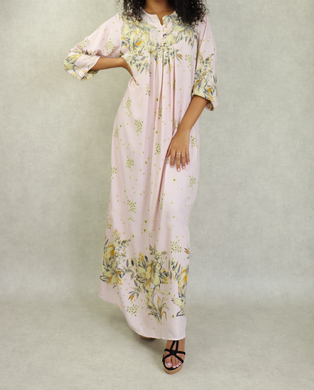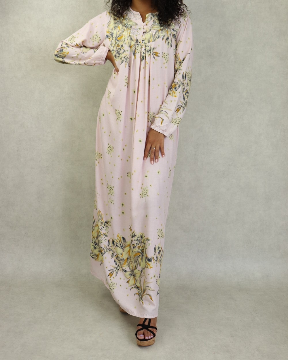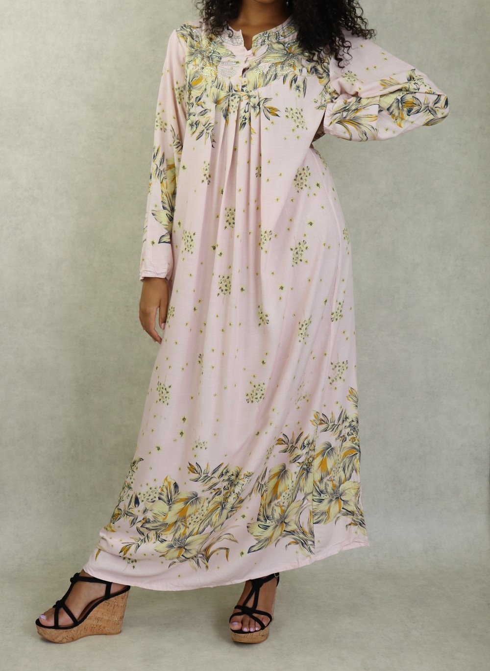 Robe d’intérieur avec motifs à fleurs sur fond rose poudrée. Col rond avec quelques strass et trois boutons décoratifs sur l'avant, manches longues finition élastiques aux poignets, matière douce et agréable.