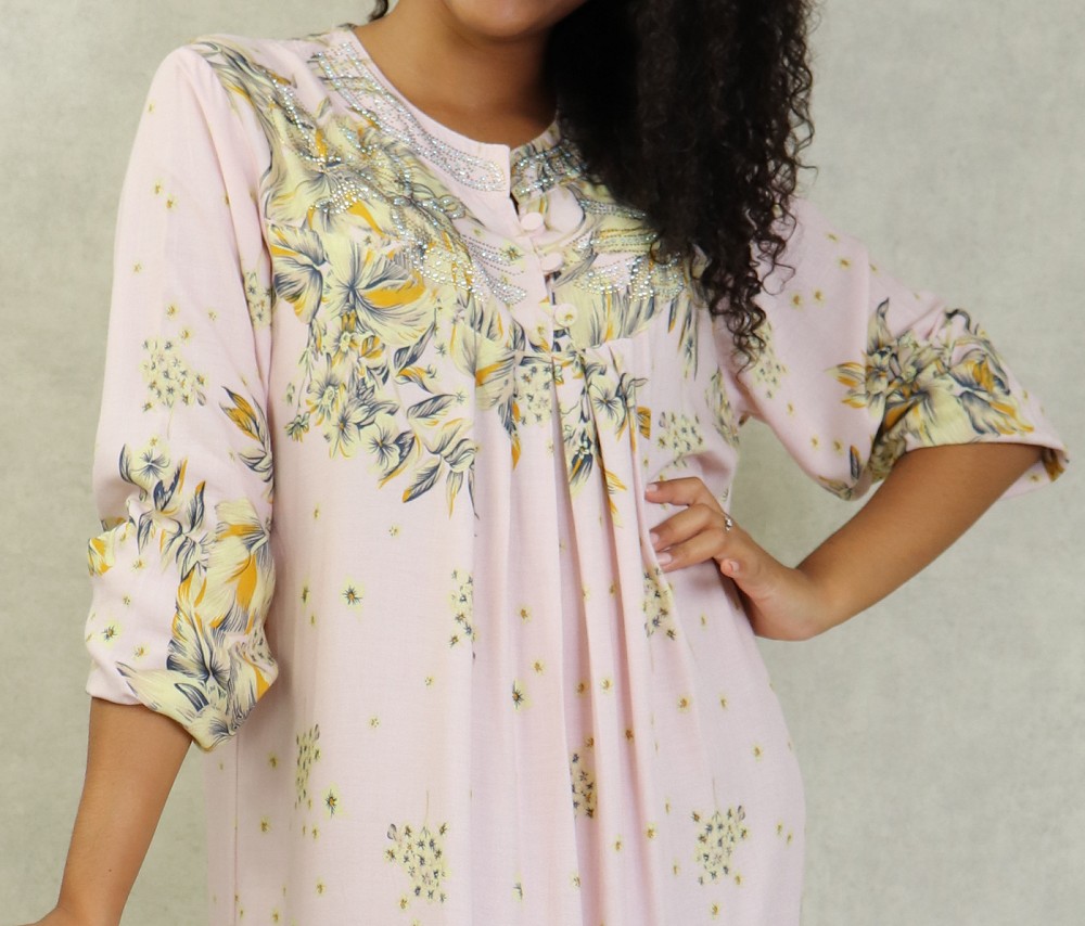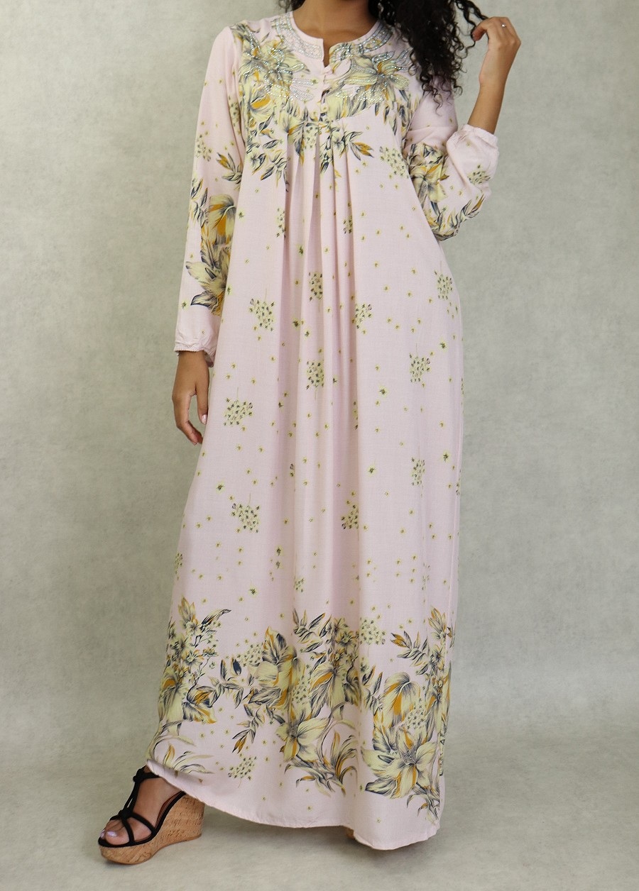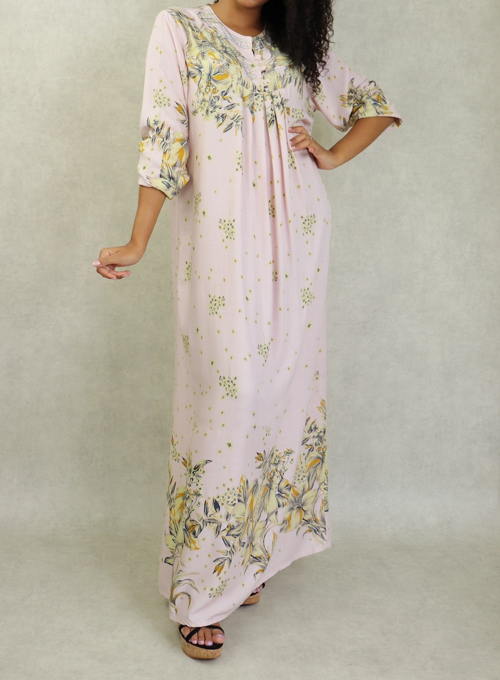 Robe d’intérieur avec motifs à fleurs sur fond rose poudrée. Col rond avec quelques strass et trois boutons décoratifs sur l'avant, manches longues finition élastiques aux poignets, matière douce et agréable.