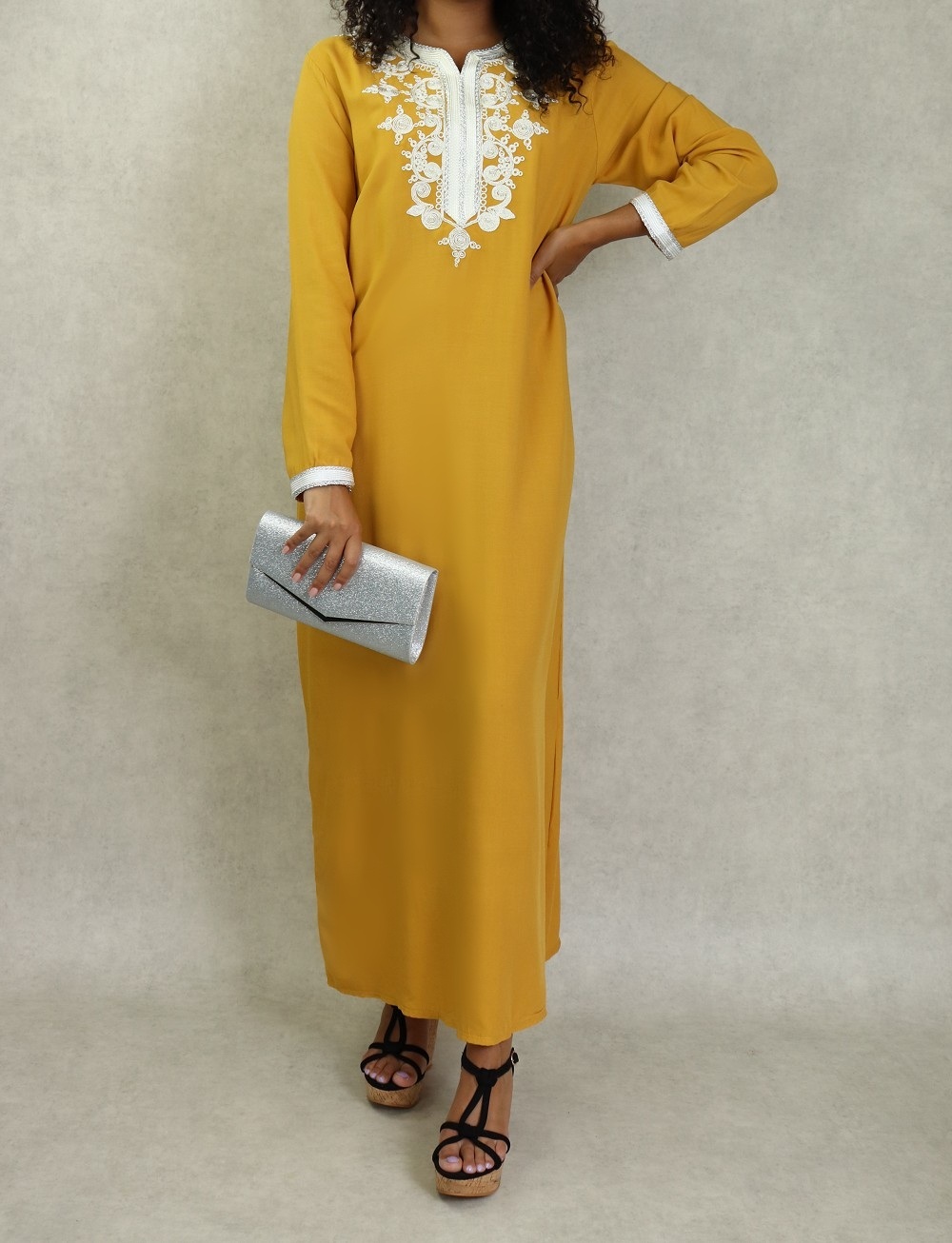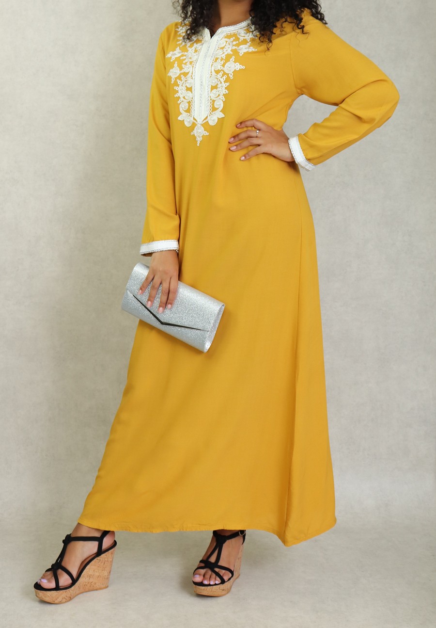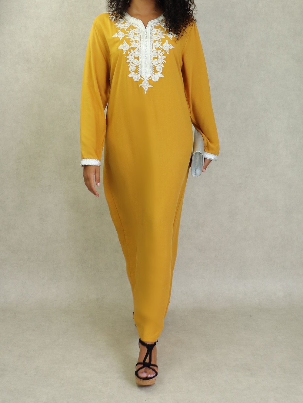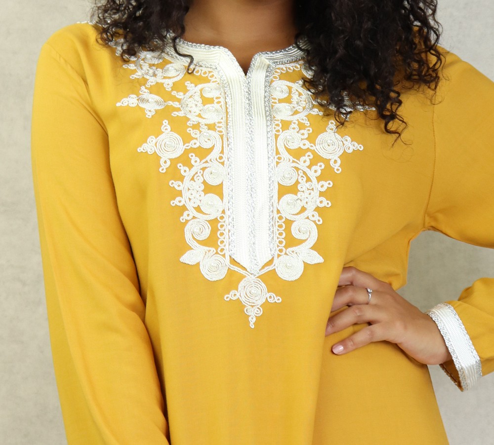 Robe longue, col en V, manches longues ornées de broderies sur les poignets ainsi que sur le buste. Coupe droite, tissu fluide et doux.