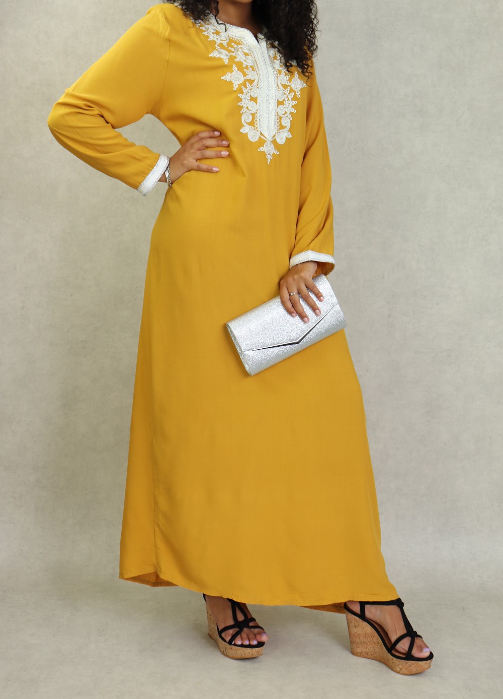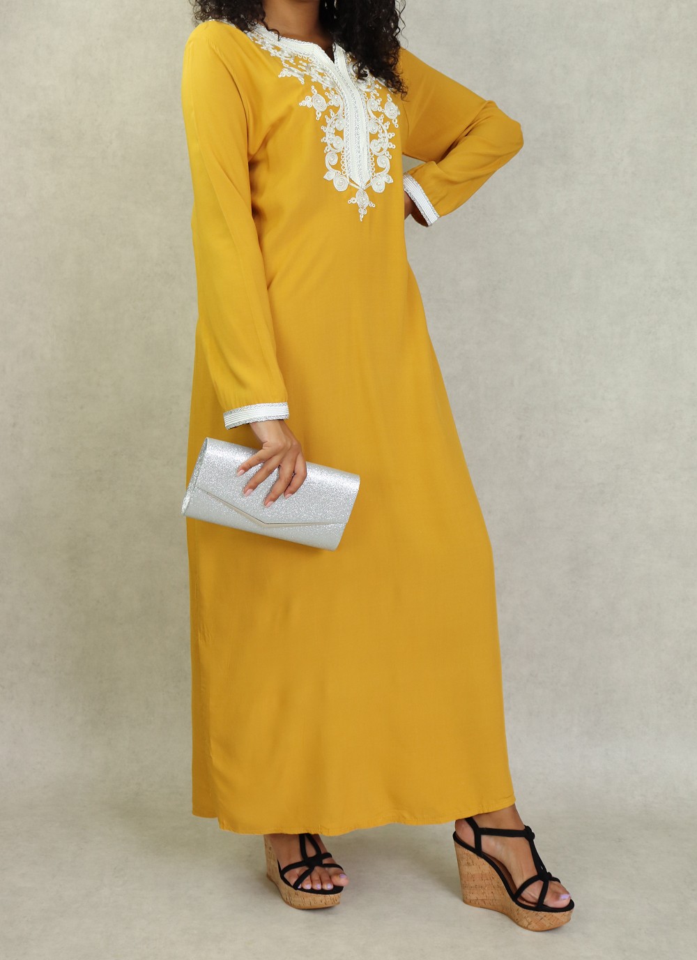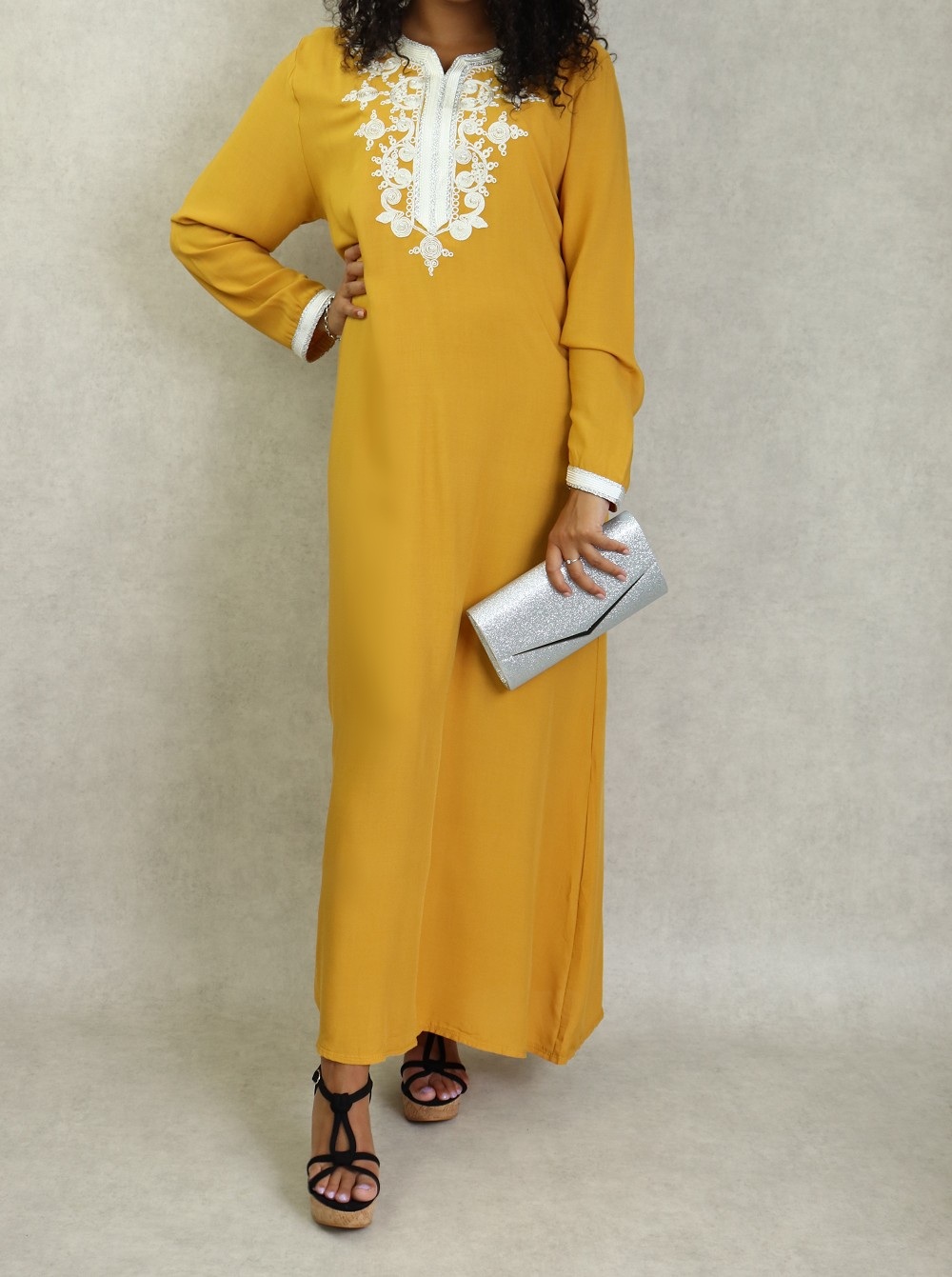 Robe longue, col en V, manches longues ornées de broderies sur les poignets ainsi que sur le buste. Coupe droite, tissu fluide et doux.