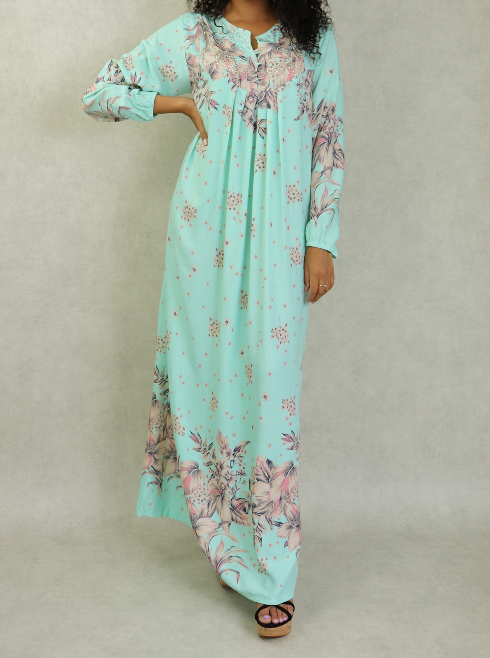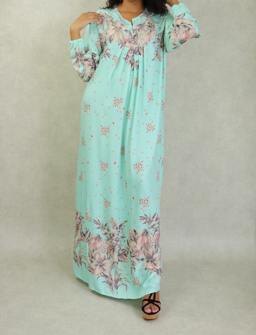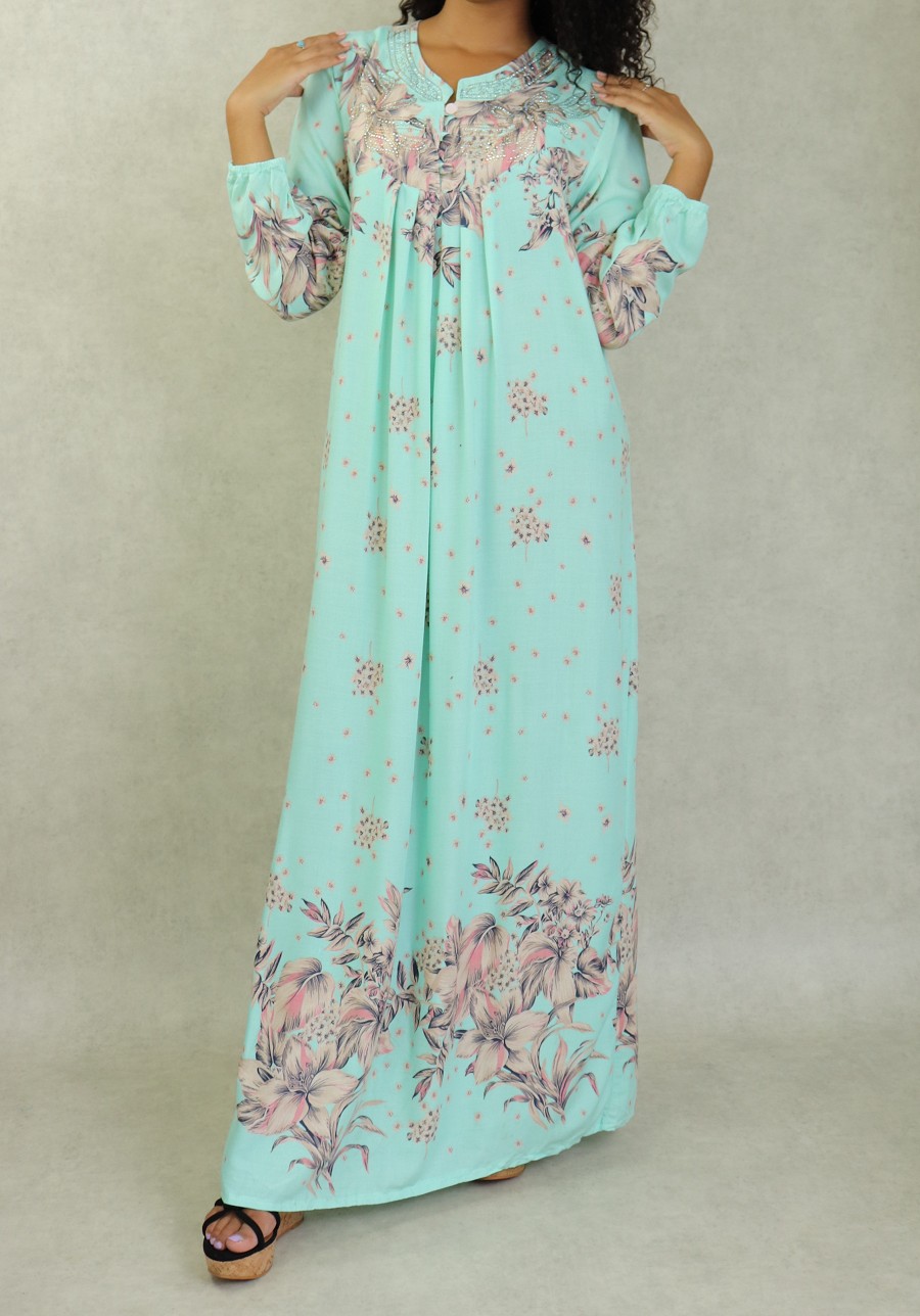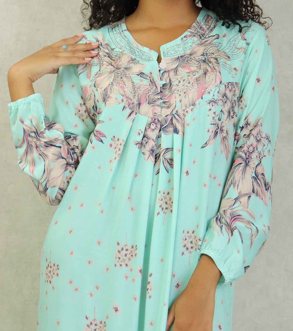 Robe d'intérieur 100% coton (gandoura) manches longues motifs fleurs pour femme sur fond Vert d'eau Vetement & Accessoire