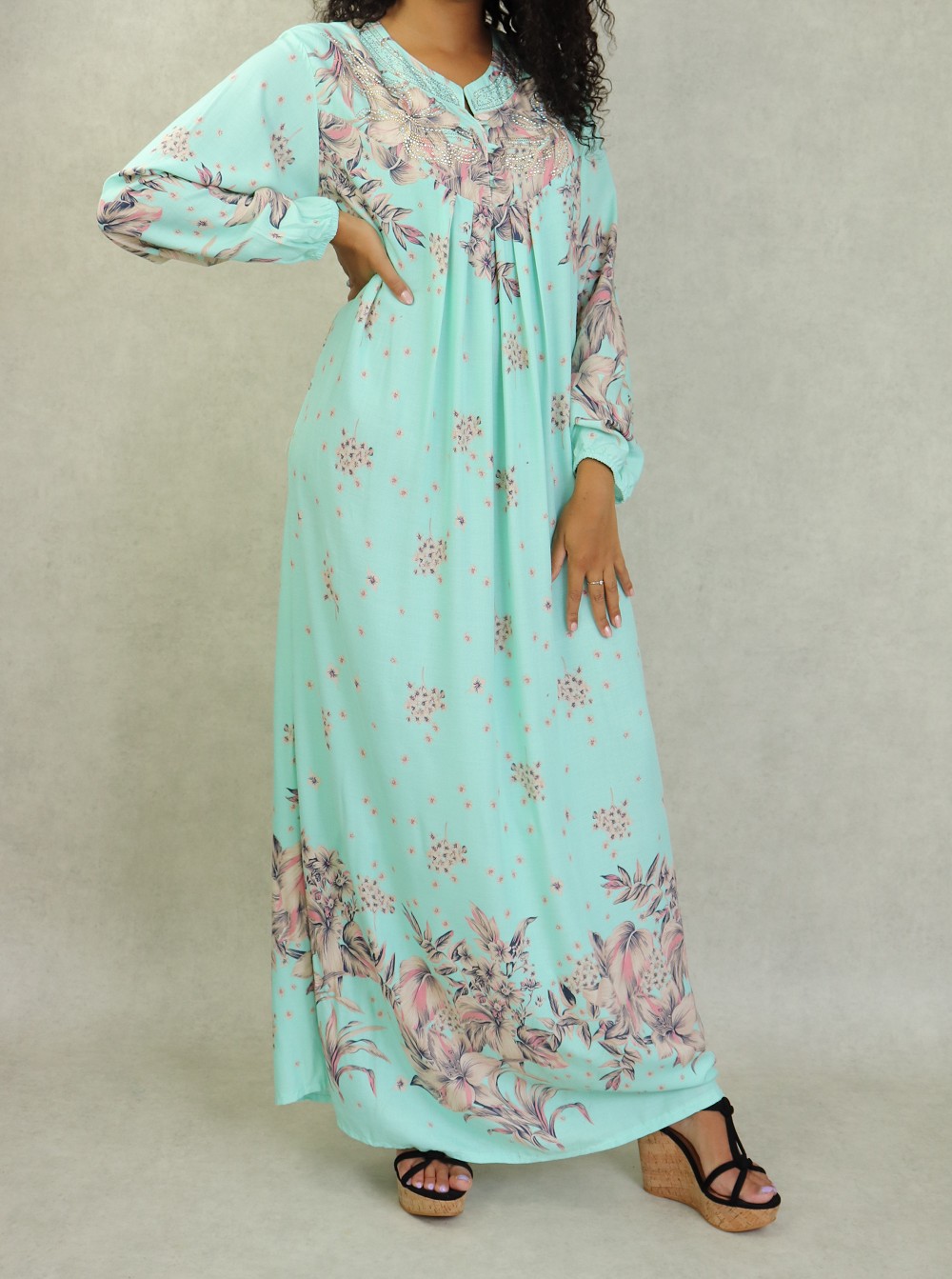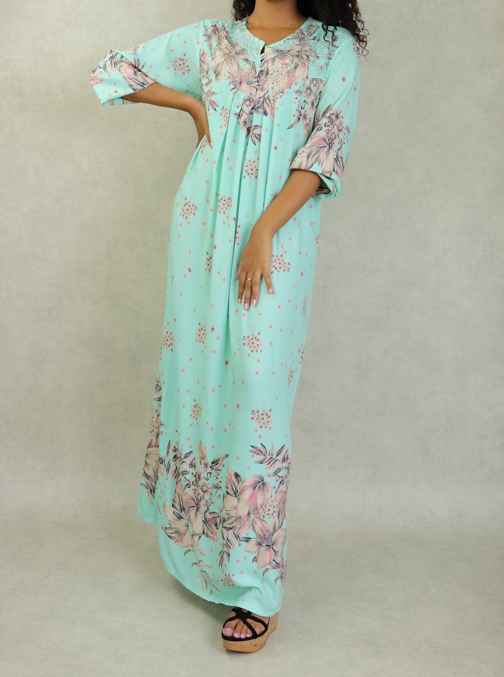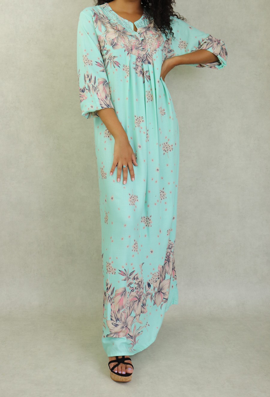 Robe d'intérieur 100% coton (gandoura) manches longues motifs fleurs pour femme sur fond Vert d'eau Vetement & Accessoire