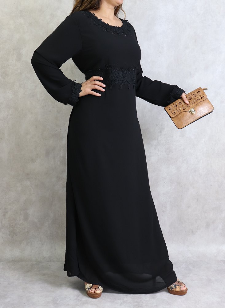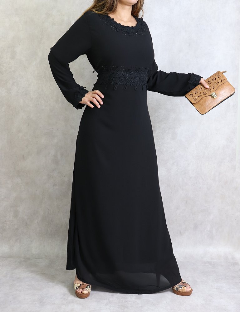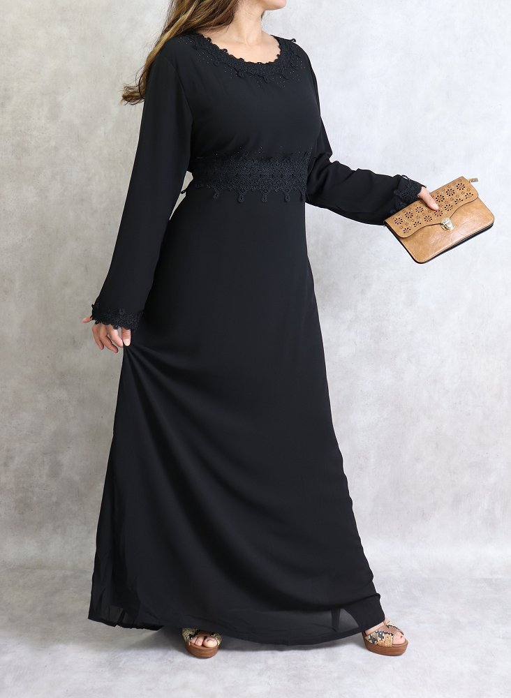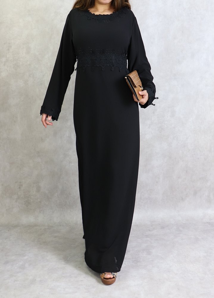 Robe à dentelles et strass sur un col dégagé ainsi que sur la taille et les poignets. Intégralement doublée. 2 liens qui peuvent aussi bien se nouer à l’avant comme à l'arrière afin de faire un effet cintré. Ce modèle sobre et distingué vous conviendra pour différents événements.