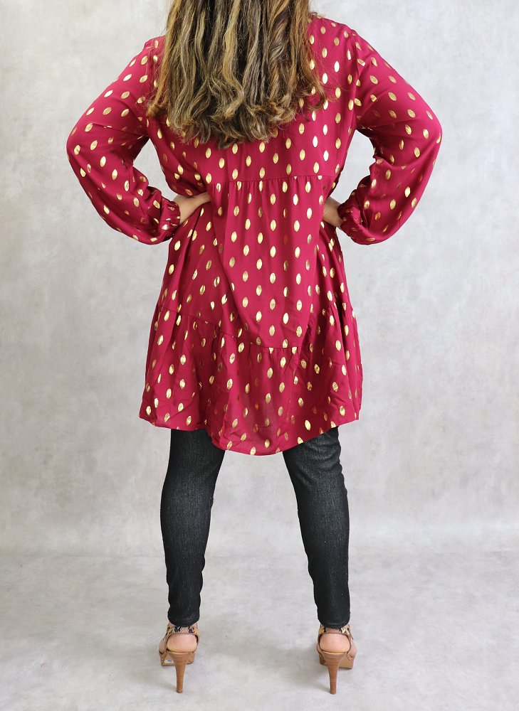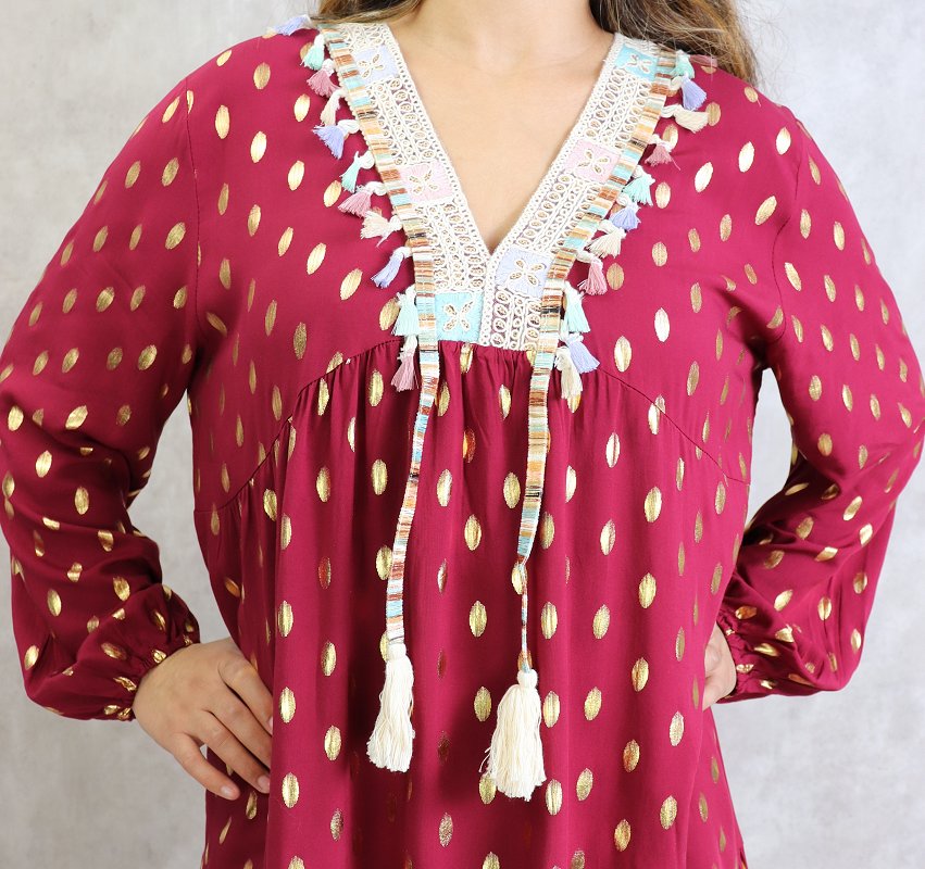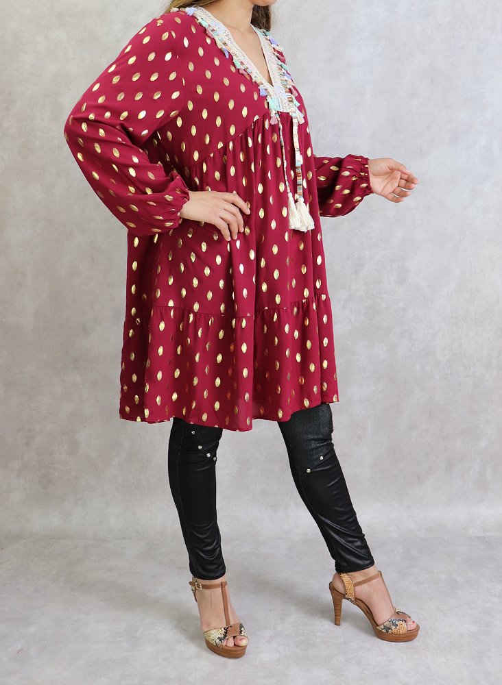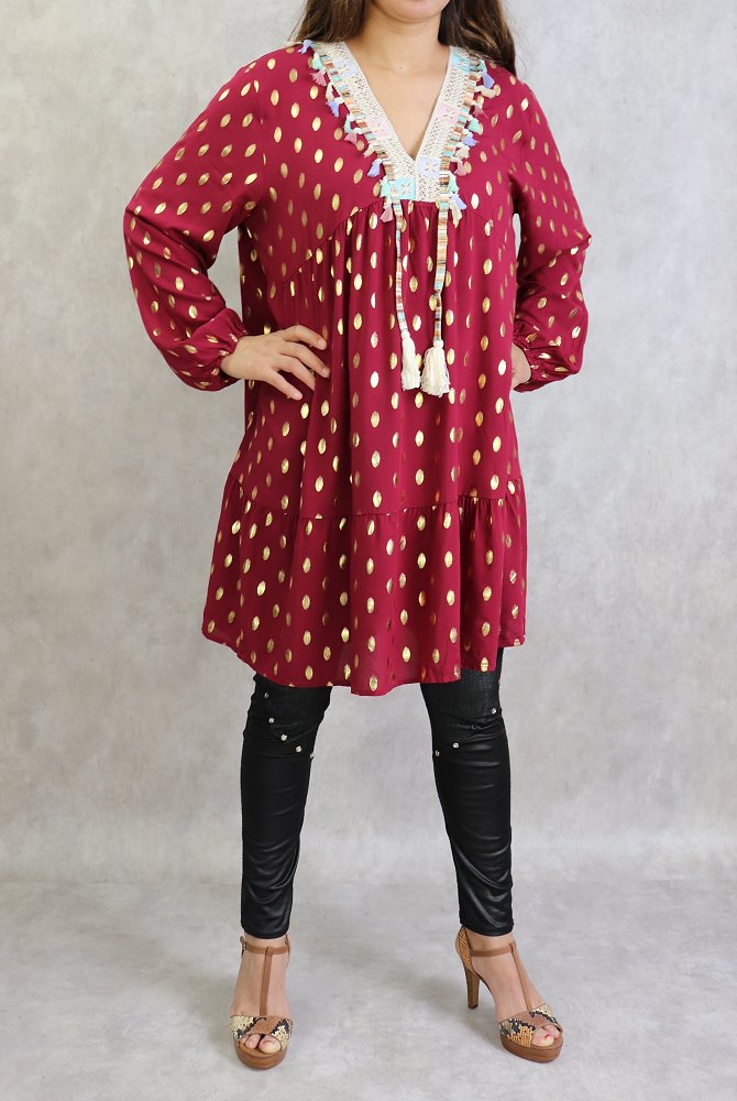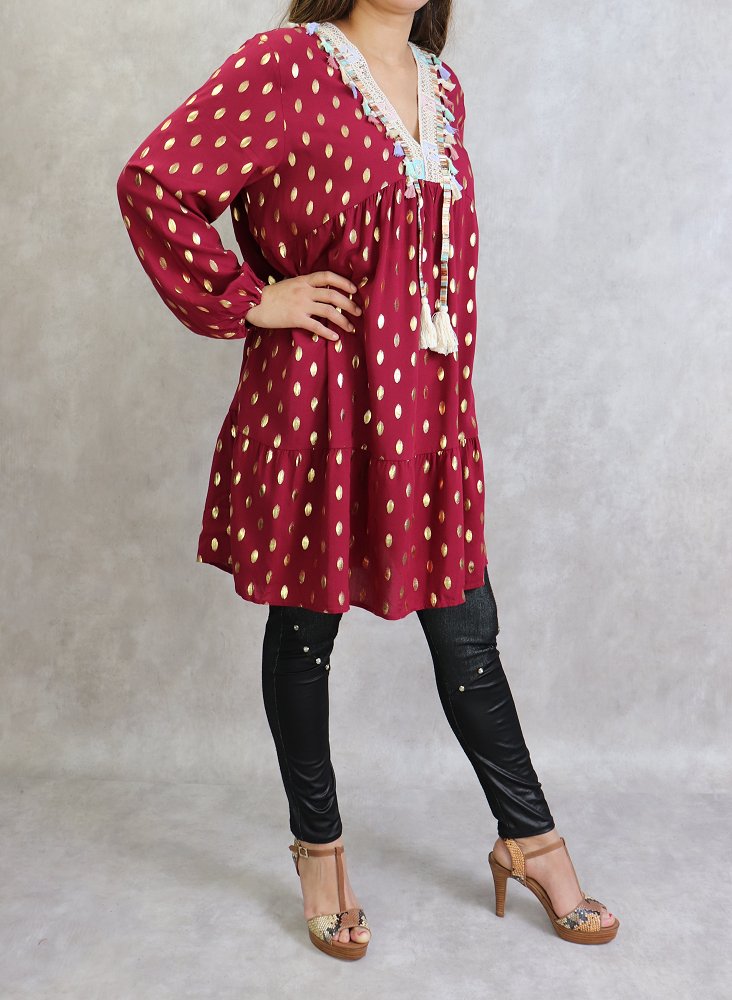 Tunique longue, col en V avec broderies, manches longues, poignets élastiques. Motifs dorés. Coupe évasée, matière légère et fluide.