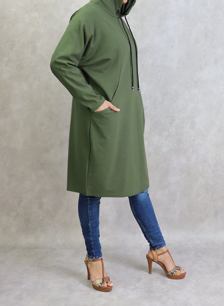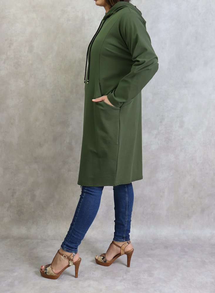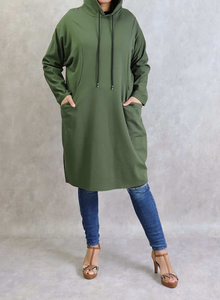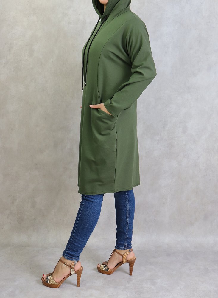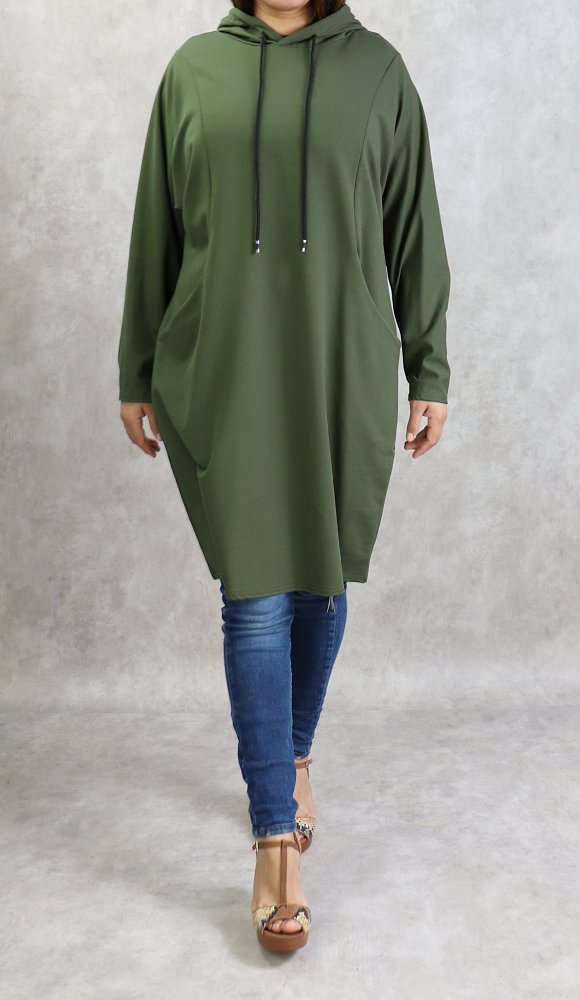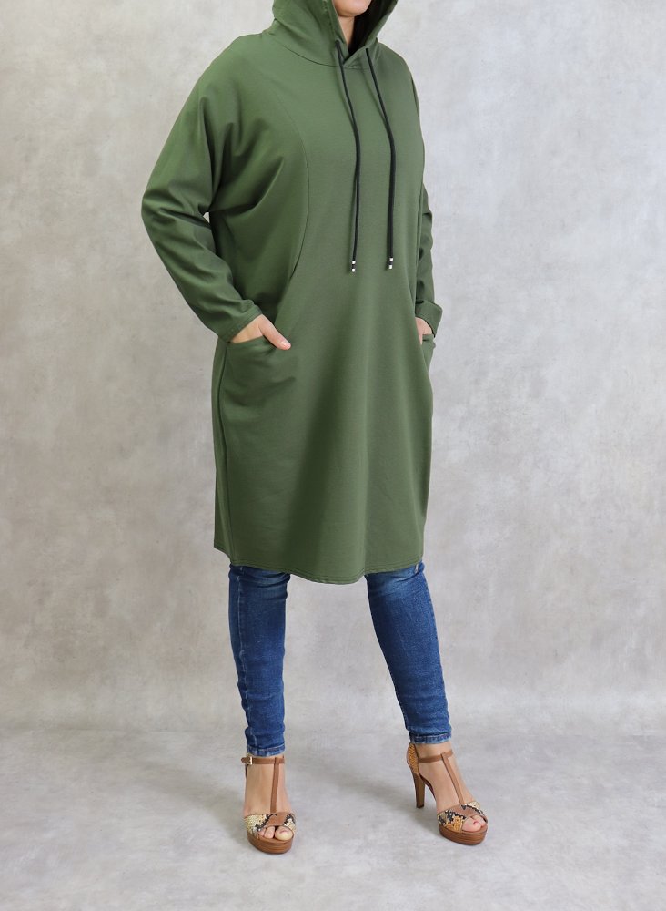 Sweat long de couleur uni avec deux poche plaquée. Coupe classique, manches longues. Capuche munie d'un cordon de serrage sur le col.