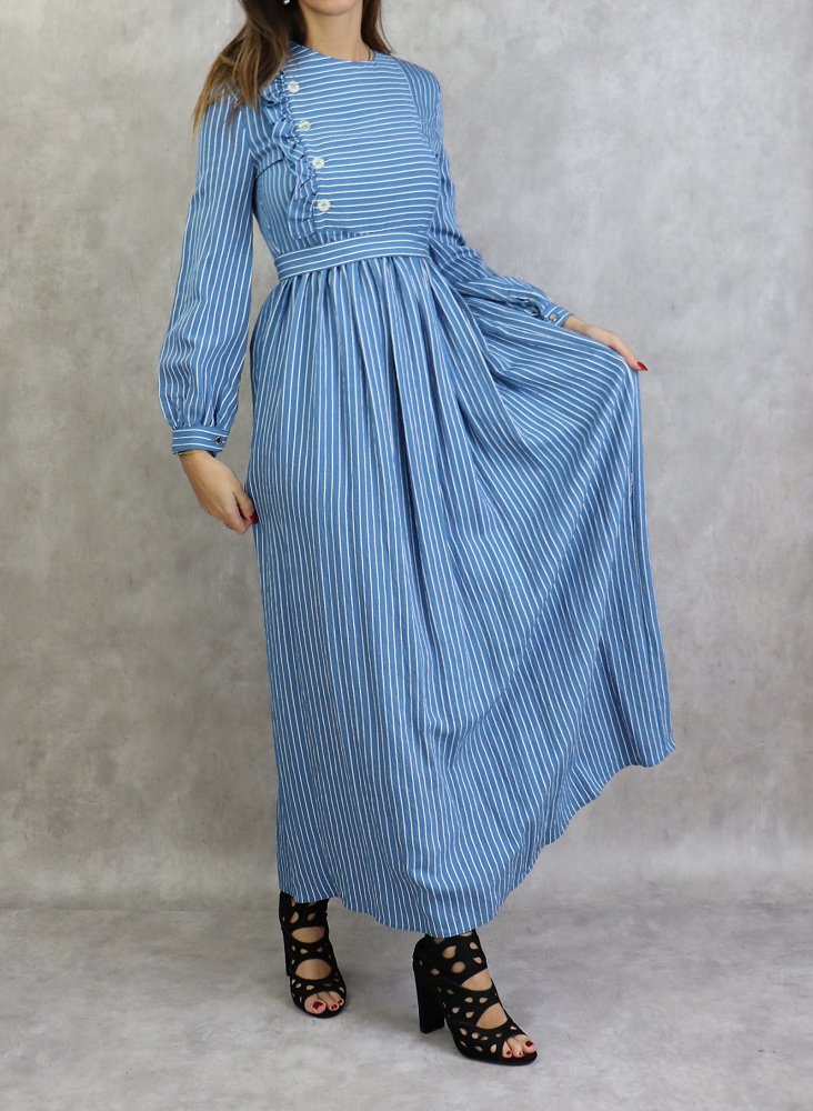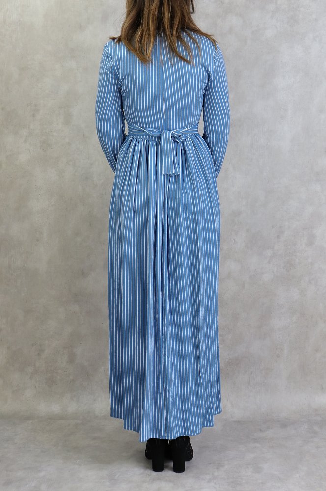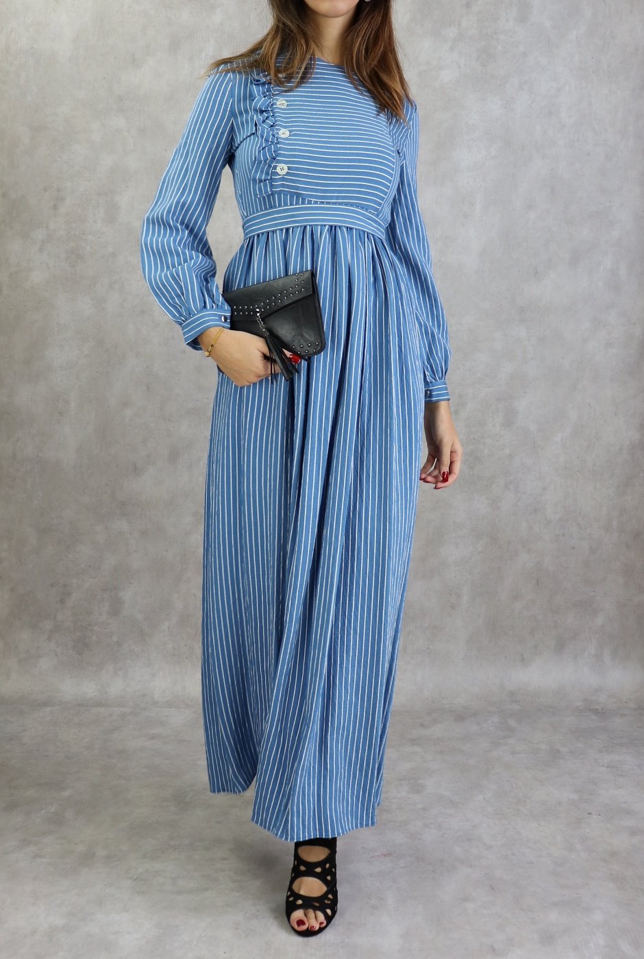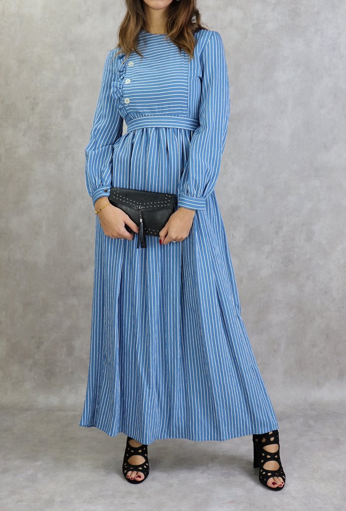 Robe casual longue evasee a rayures blanches pour femme - Couleur bleu