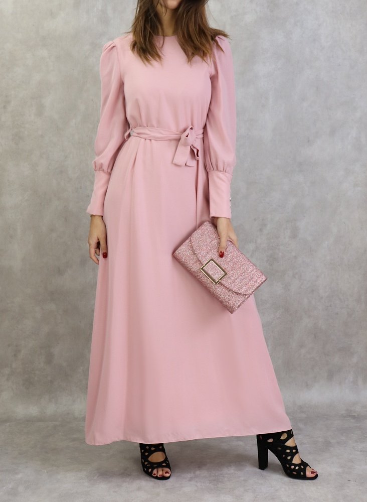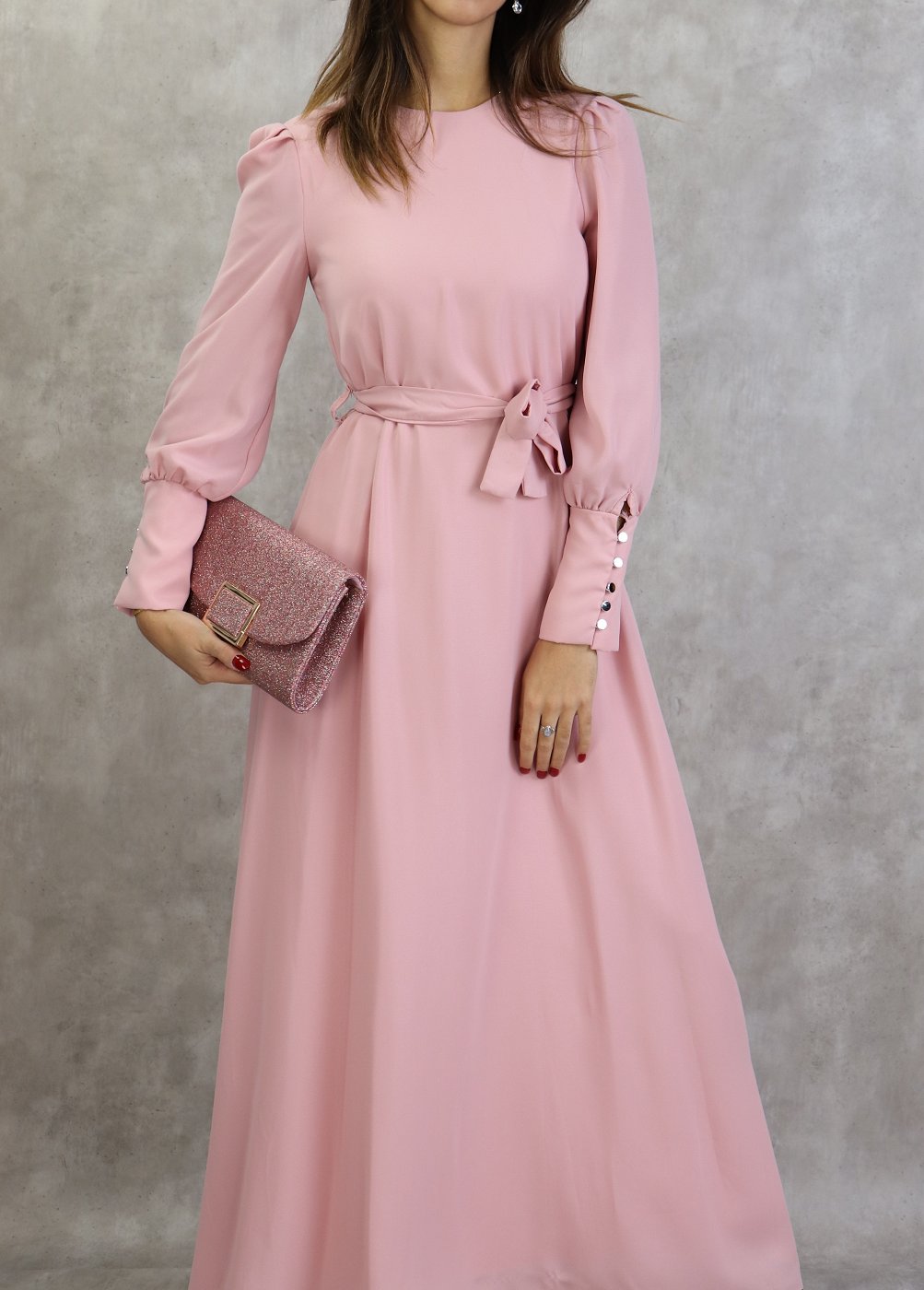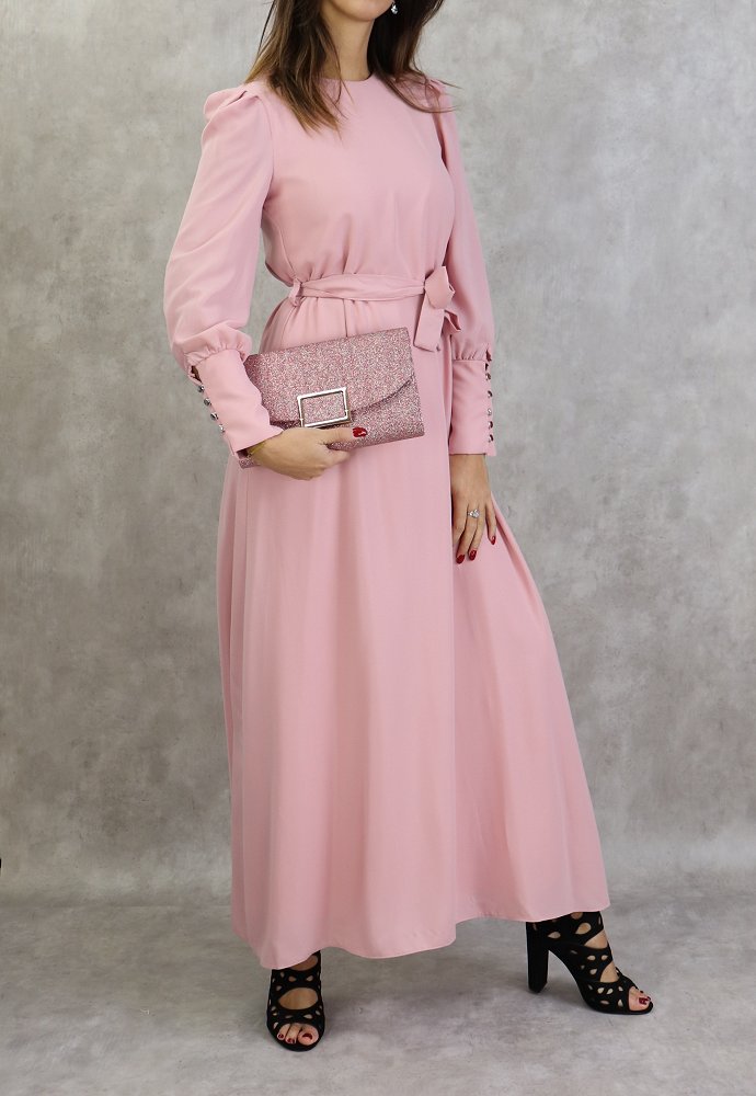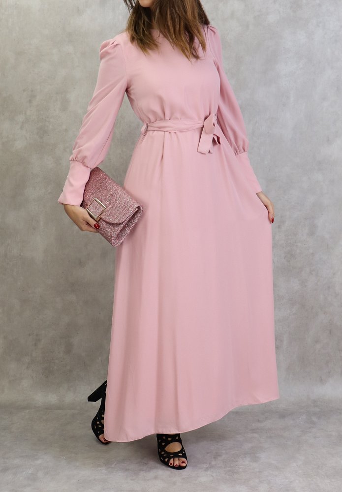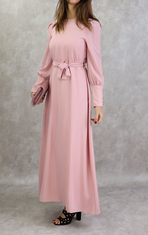 Robe longue, col rond, fermeture à glissière au dos, manches longues froncées finition 5 boutons aux poignets, ceinture assortie à passants. Coupe droite, tissu de qualité supérieur, légèrement satiné, doux, et fluide. Robe entièrement doublé.