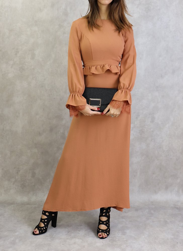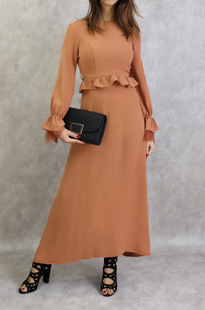 Robe longue évasée, col rond, fermeture glissière au dos, manches finition élastique froufrous et dentelles aux poignets, taille cintrée ornée d'un volant, ceinture assortie à passants, tissu doux, fluide et opaque.