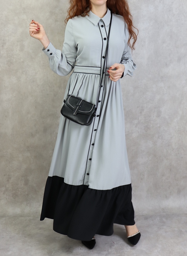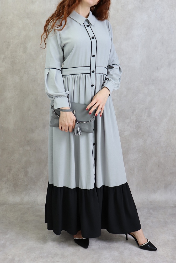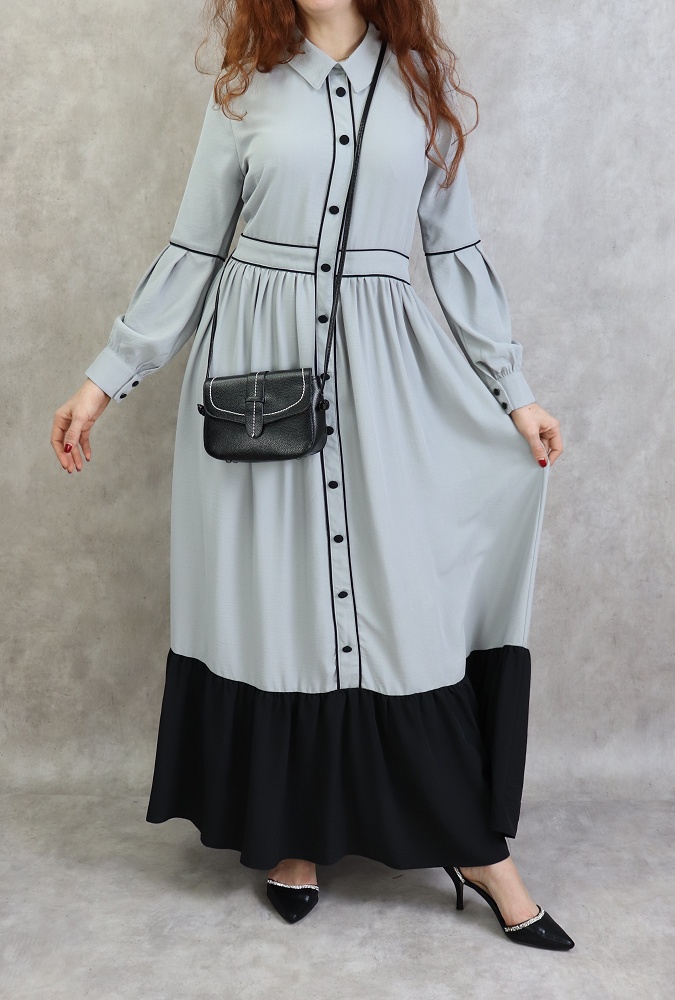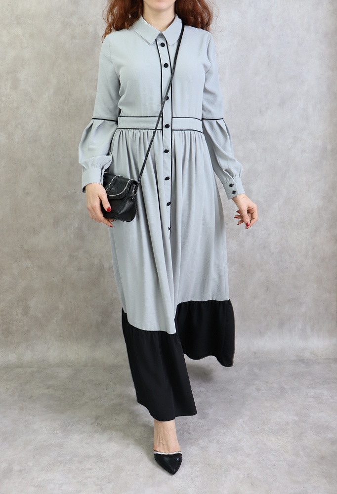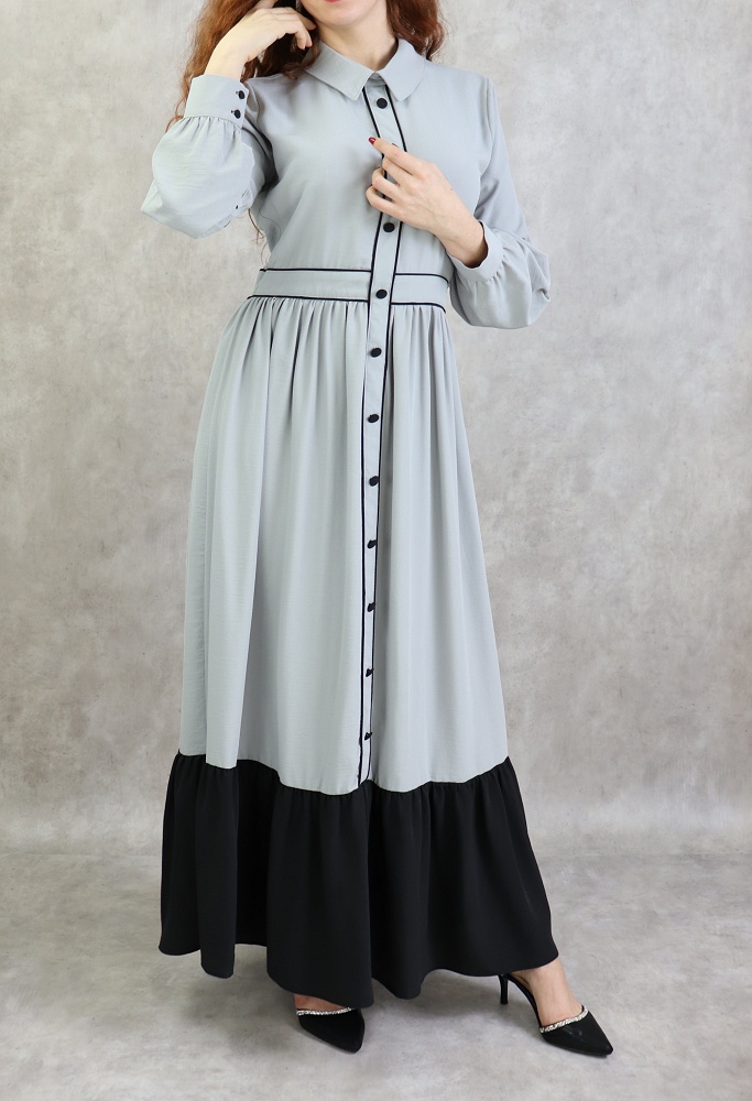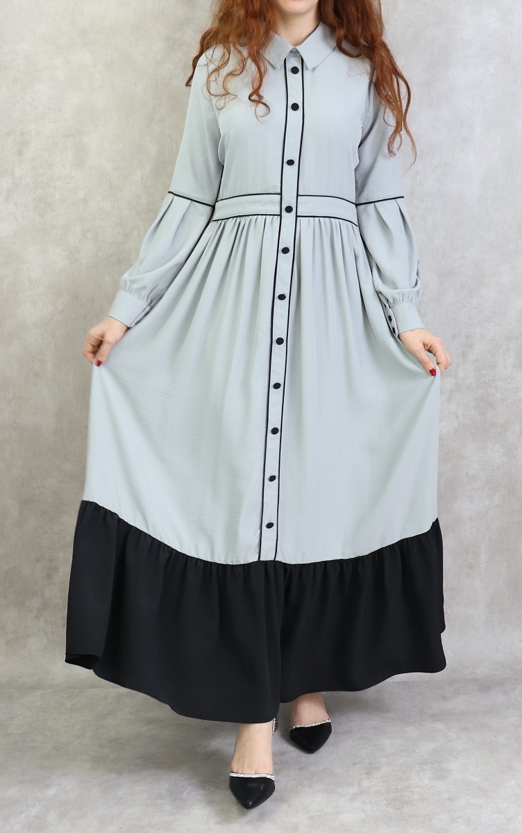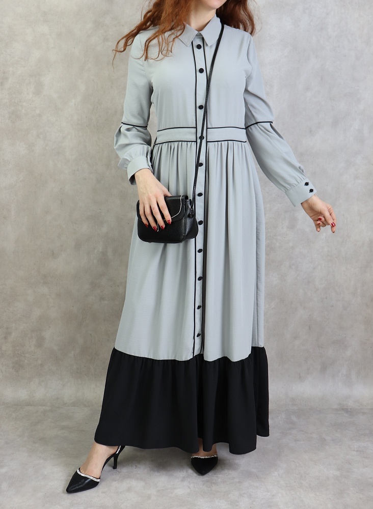 Robe longue, col chemise, fermeture éclair au dos, manches finition boutons aux poignets, boutons d'ornement sur le devant, tissu fluide et opaque, coupe cintrée à la taille et ample vers le bas.