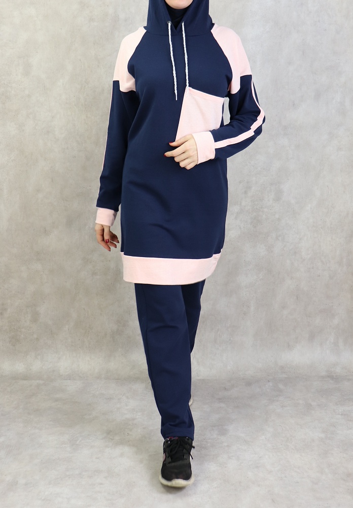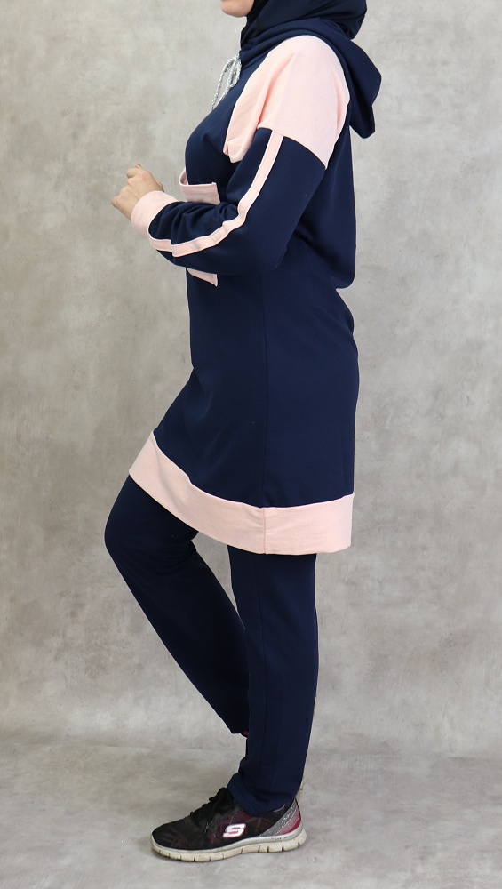 Ensemble survêtement islamique à capuche et bandes blanches pour femme voilée - Couleur bleu marine - REF. 32536 (28.00 €) - En Promotion à 20.90 €