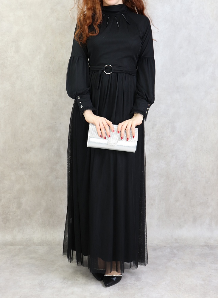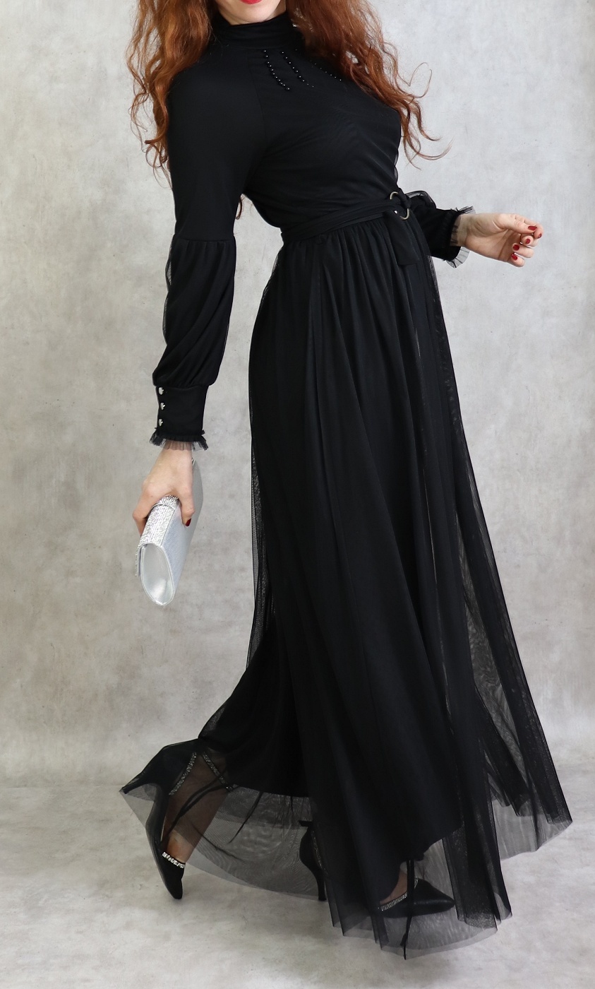 Robe longue de soirée en tulle perlée pour femme - Couleur noire Vetement & Accessoire