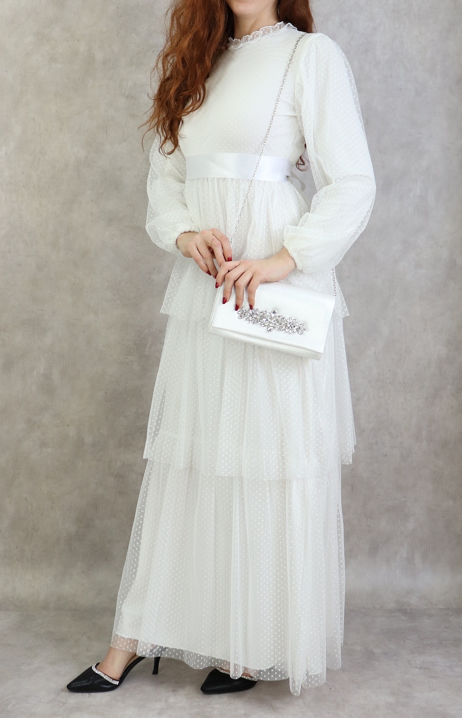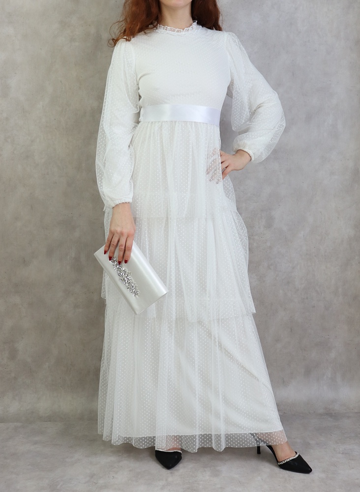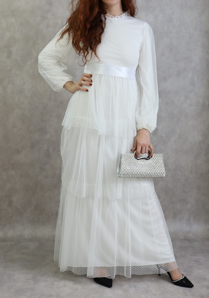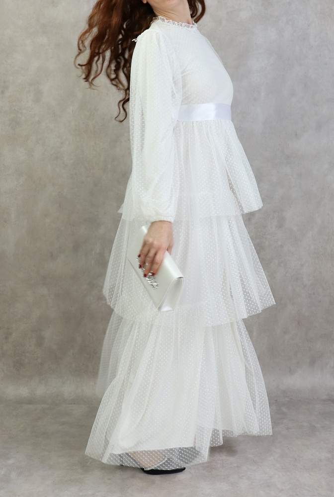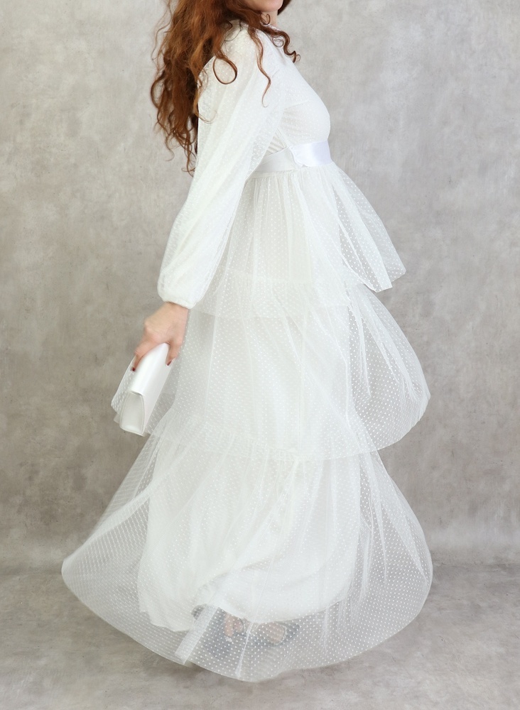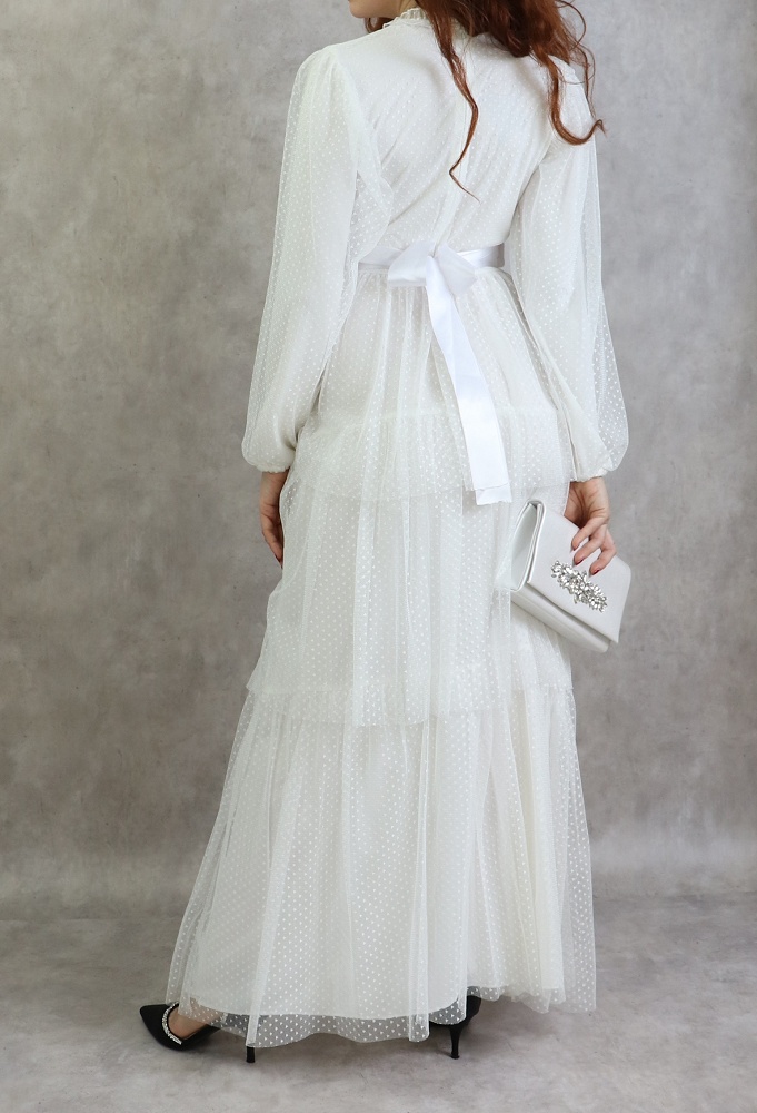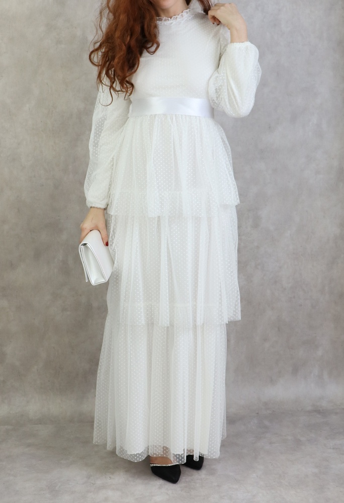 Robe longue, col rond à petite collerette, fermeture glissière au dos, manches finition élastique aux poignets, taille cintrée, ceinture satinée cousue, entièrement doublée, tissu extérieur effet tulle, volants sur la partie basse.