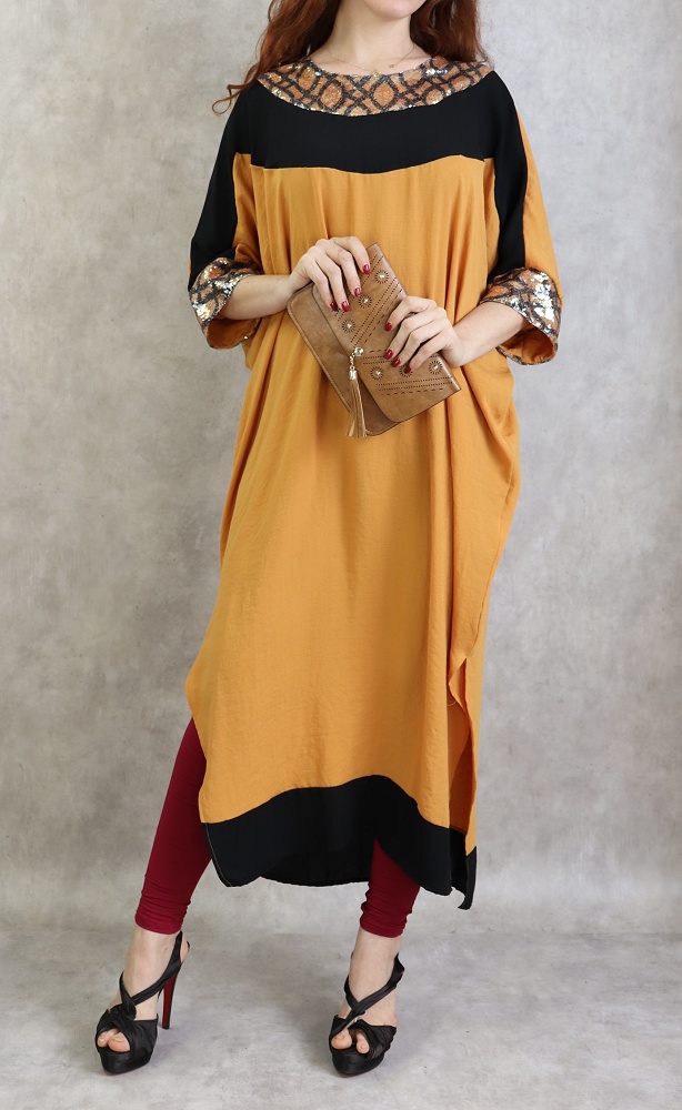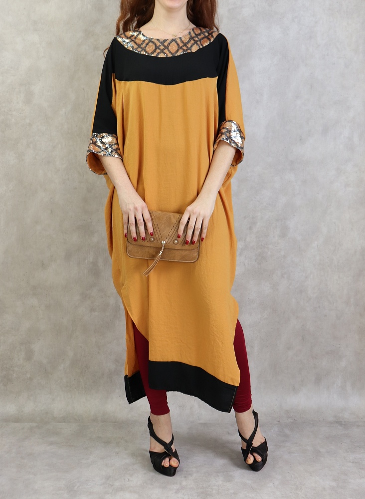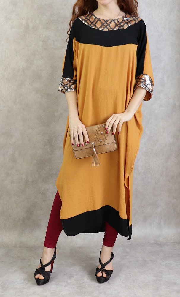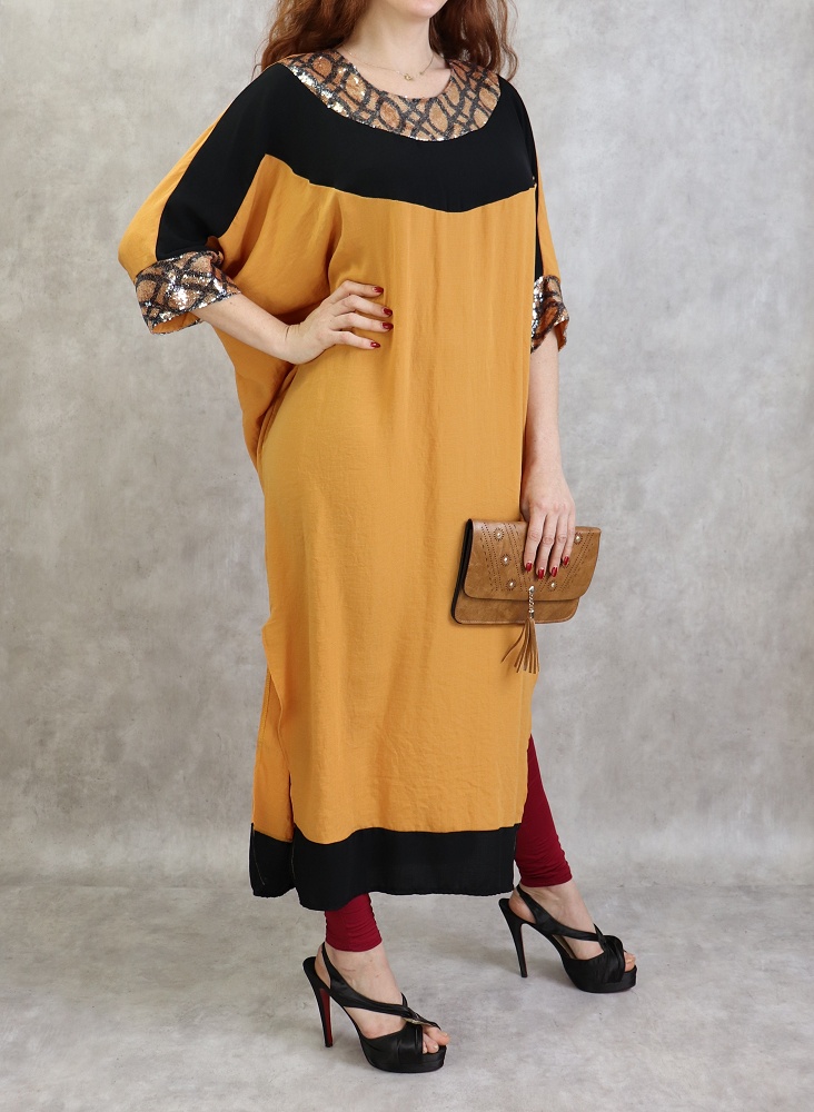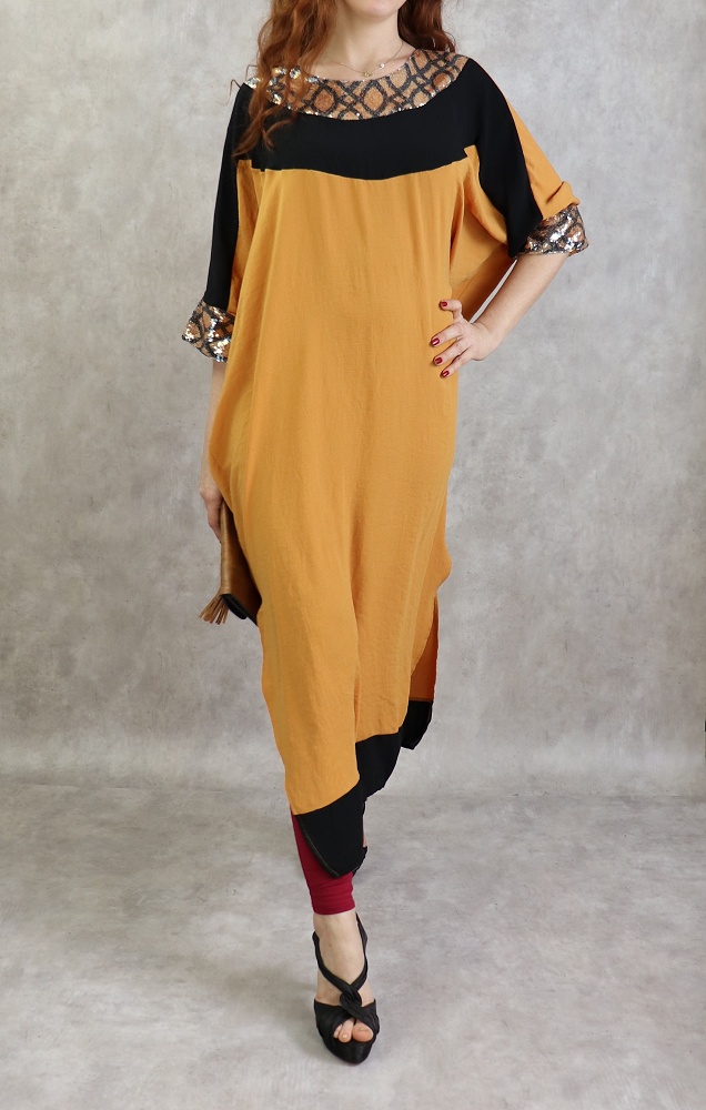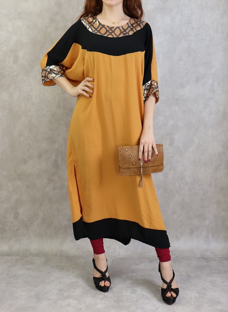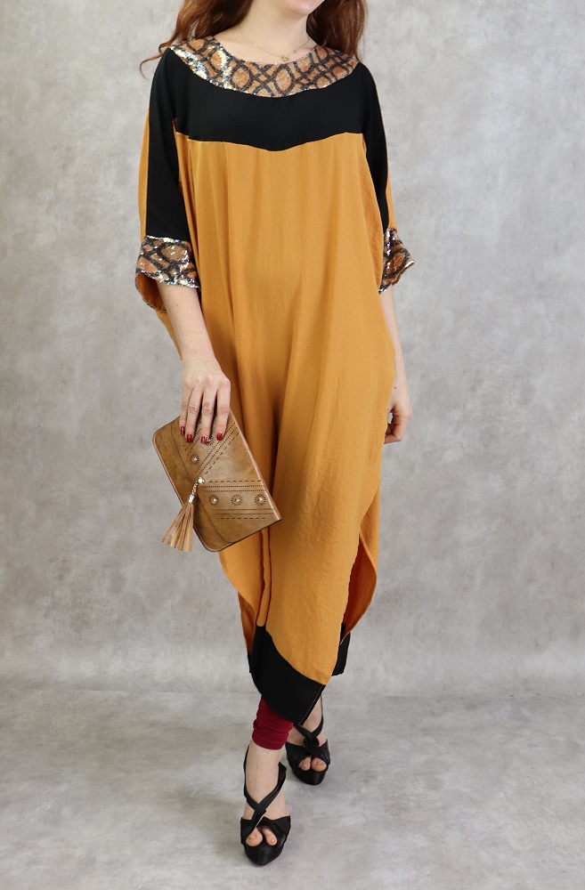 Tunique longue effet papillon a strass de couleur moutarde et noire