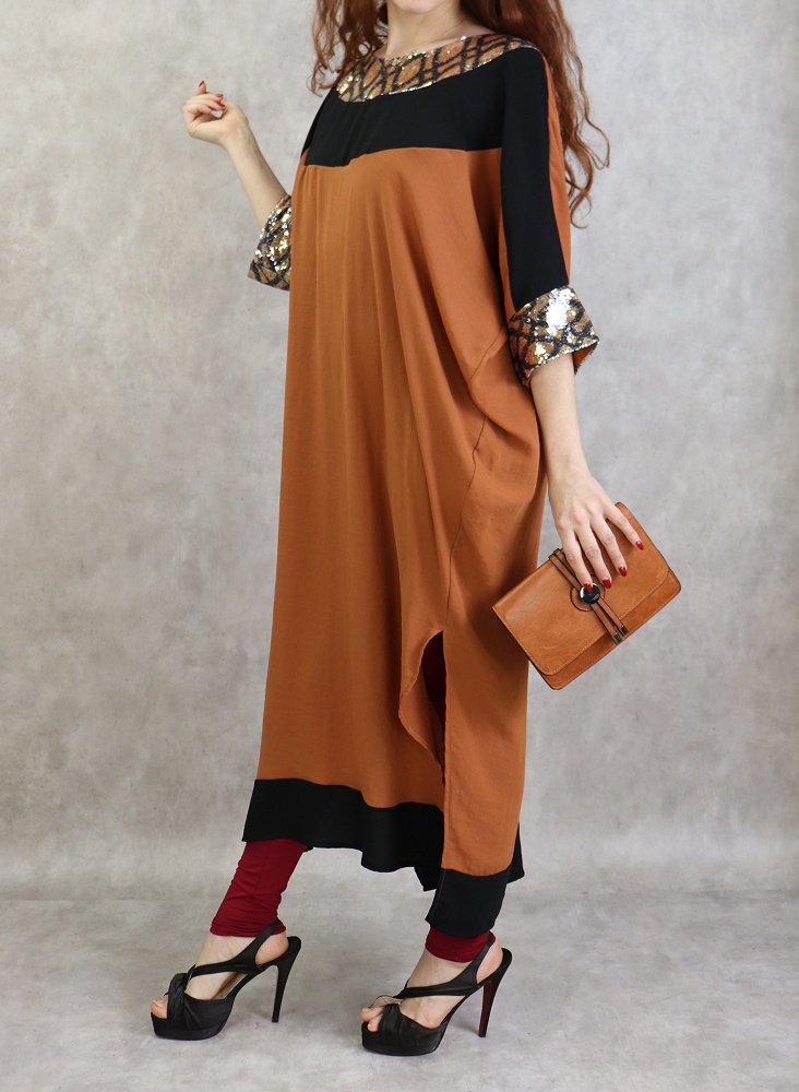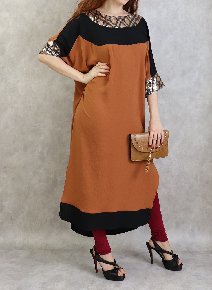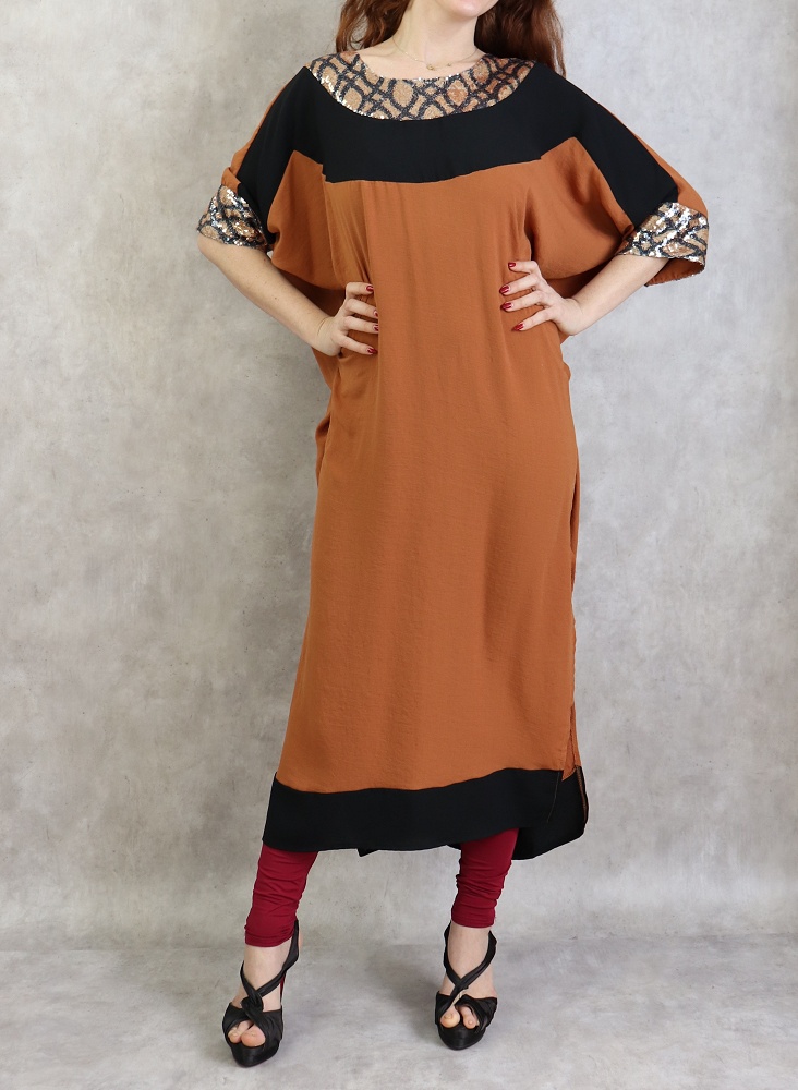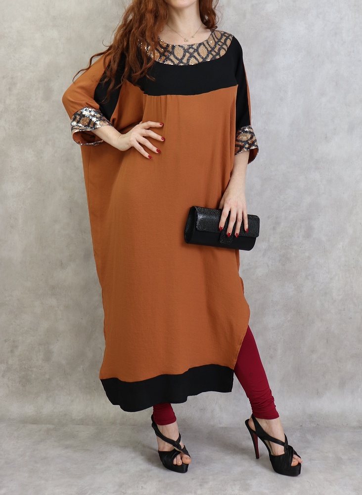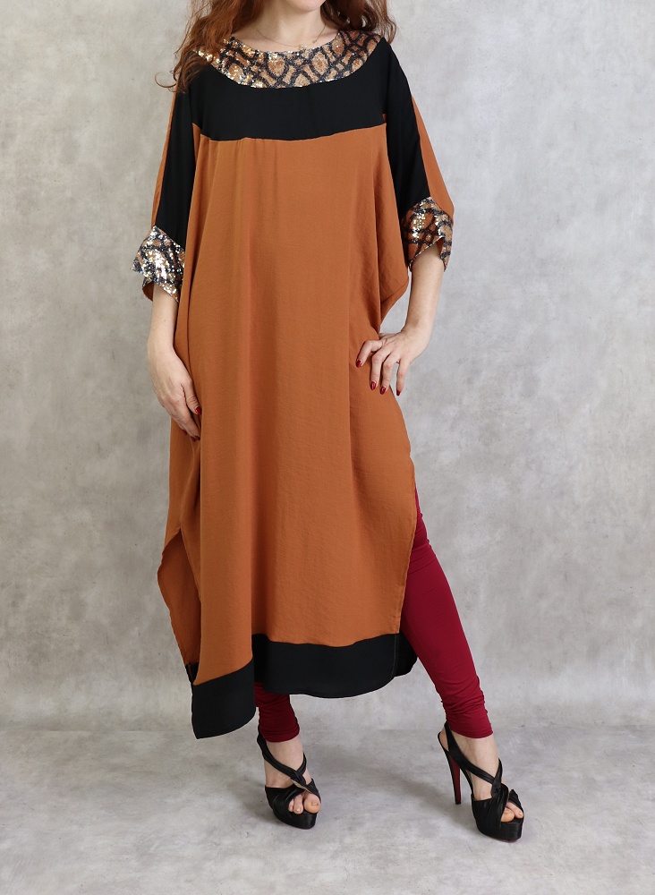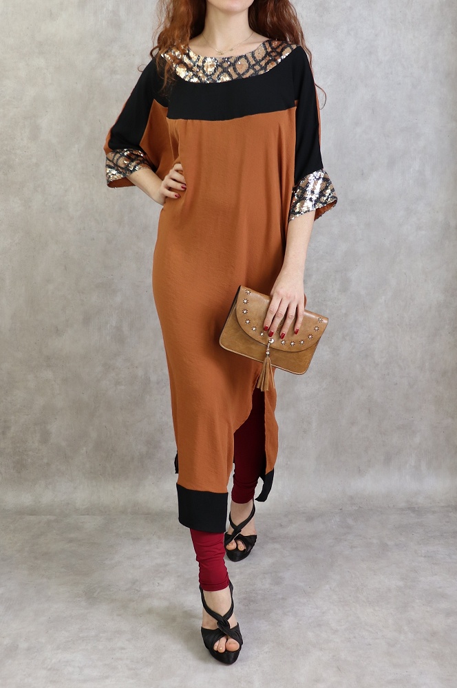 Tunique longue effet papillon a strass de couleur rouille et noire