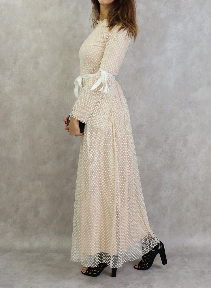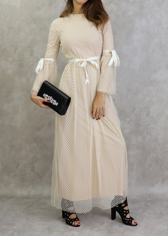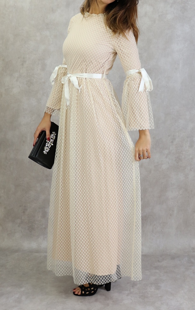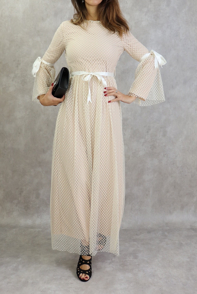 Rien de tel que ce modèle pour faire une apparition remarquée, notez les petits détails tels les rubans de satin sur les manches et la taille.