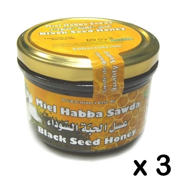 Lot de 3 Miels "Habba Sawda" (3 x 300g) : Preparation a base de Miel pur, Graine de Nigelle, Gelee Royale, Graines de Pollen, Propolis et Ginseng