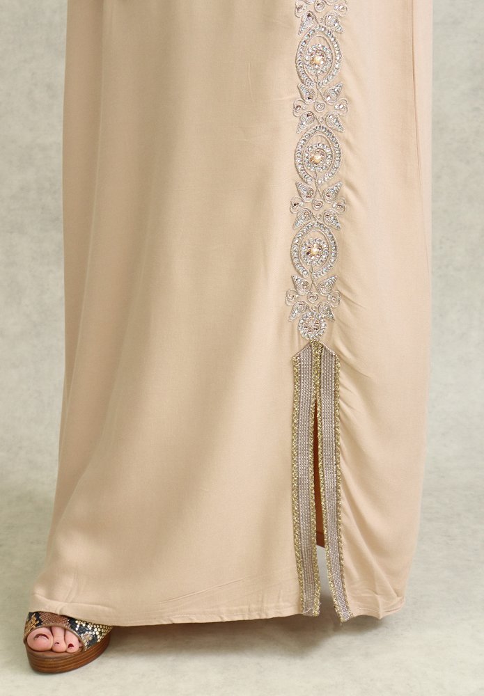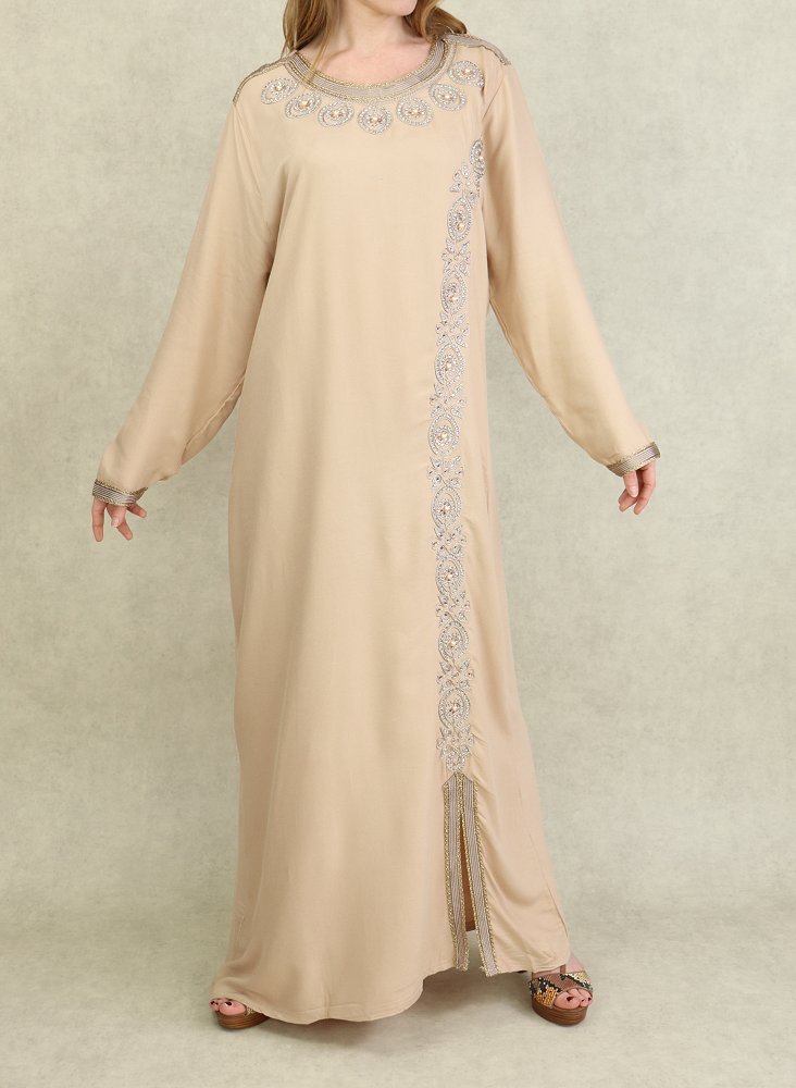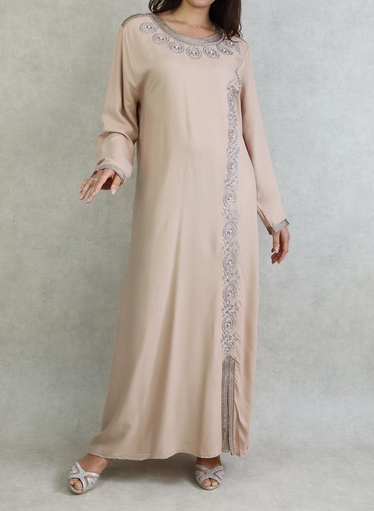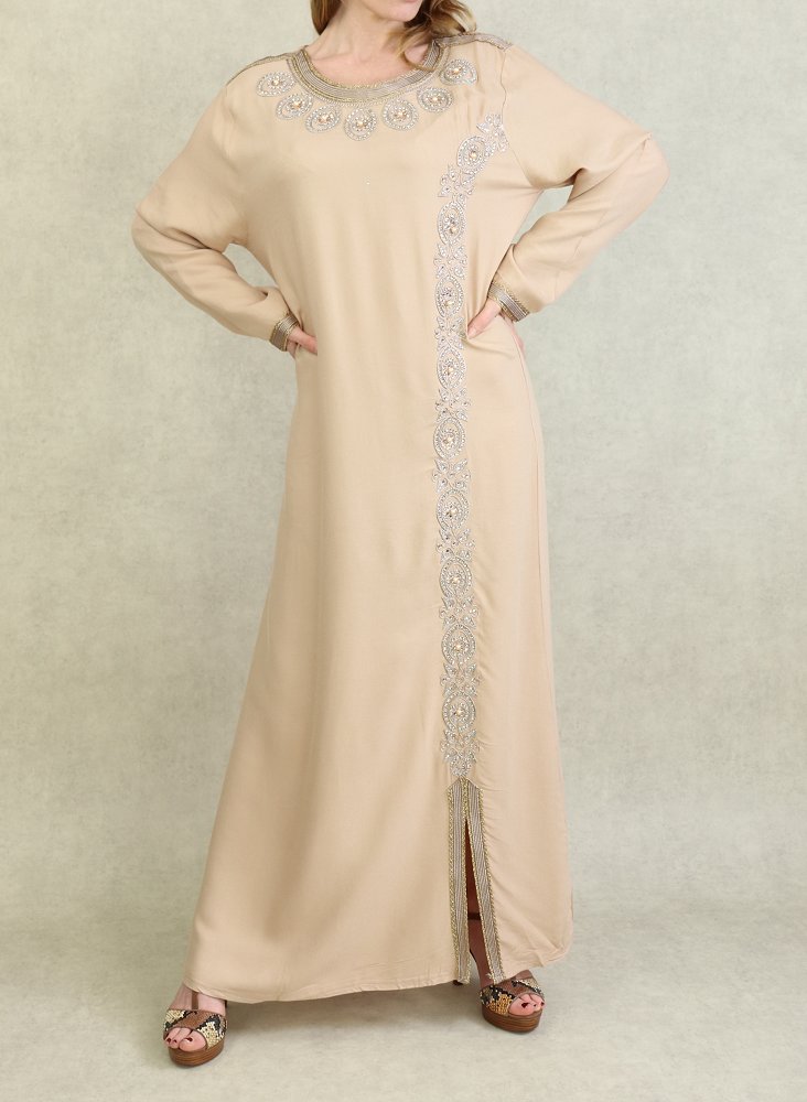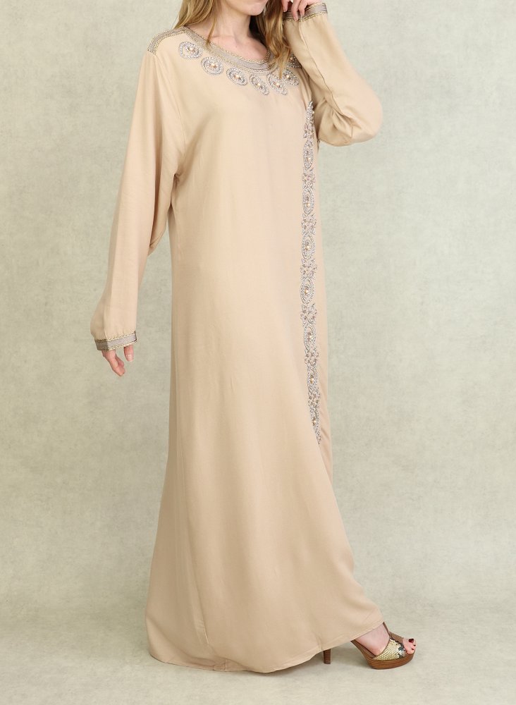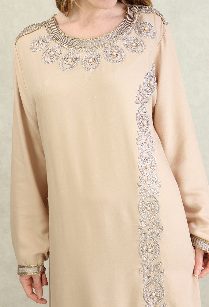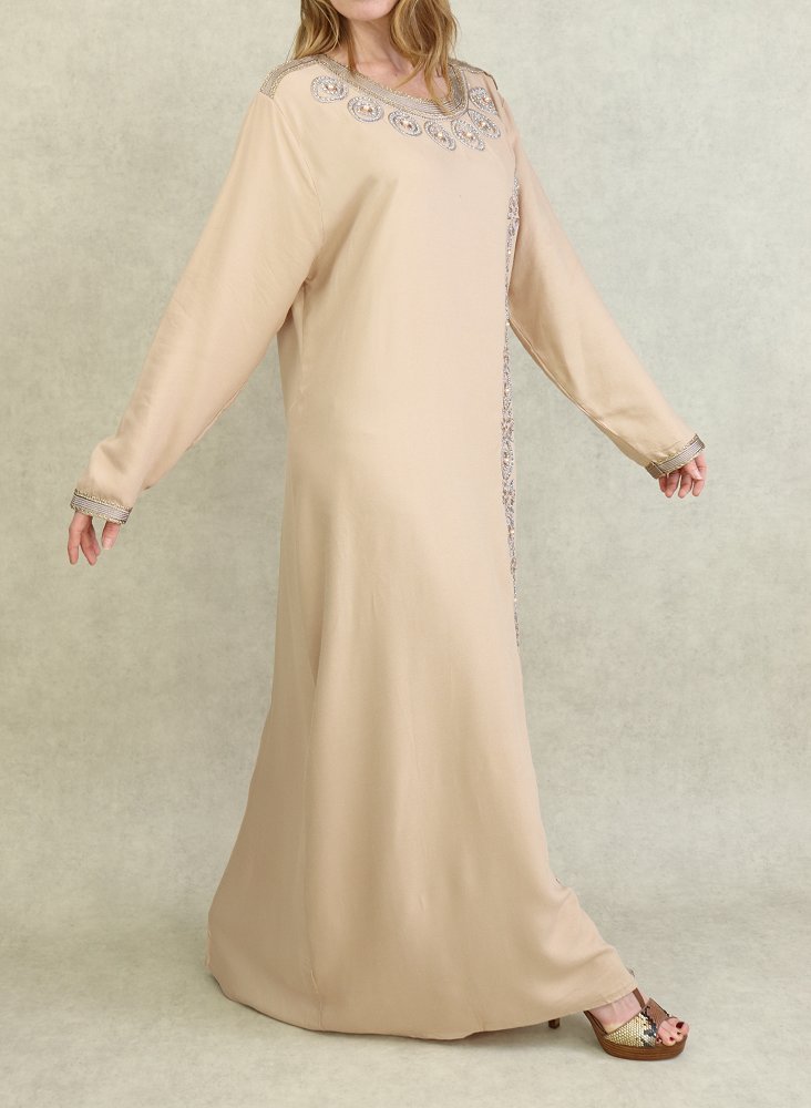 Belle robe style oriental avec broderies de qualité sur l'encolure, la longueur et finitions sur les poignets. Tenue sobre et élégante, parfaite pour occasions et événements.