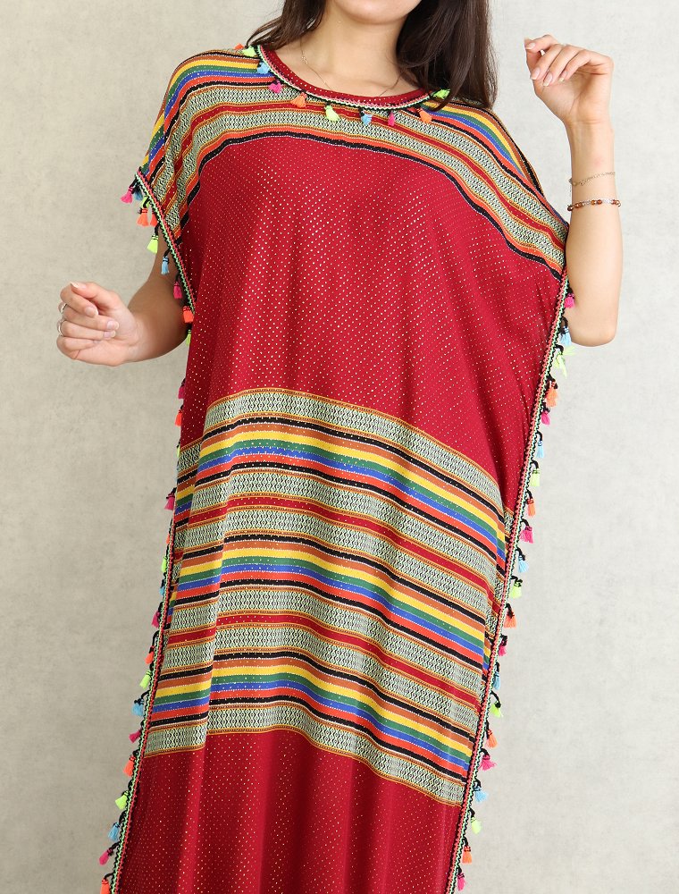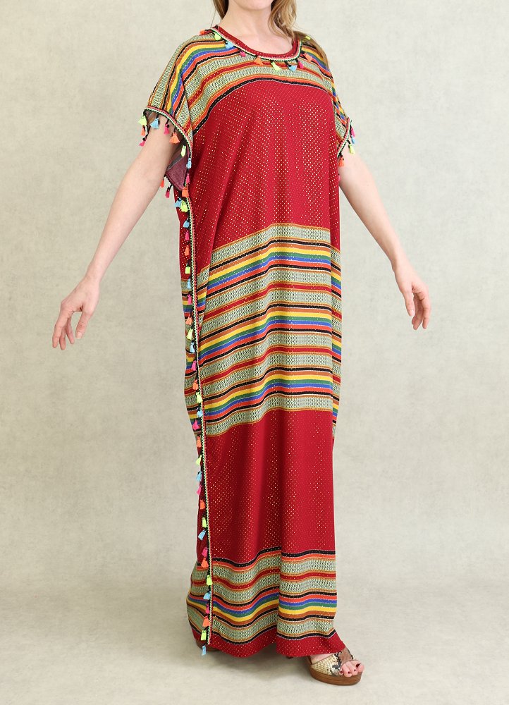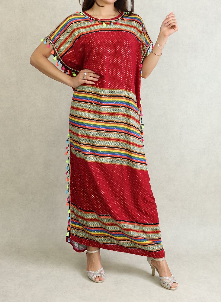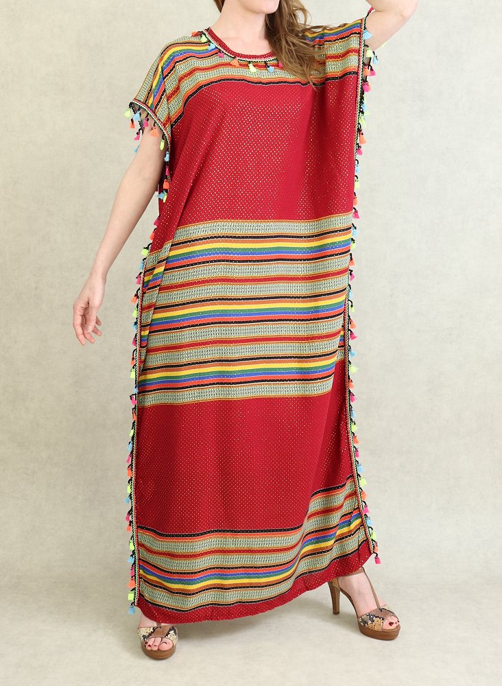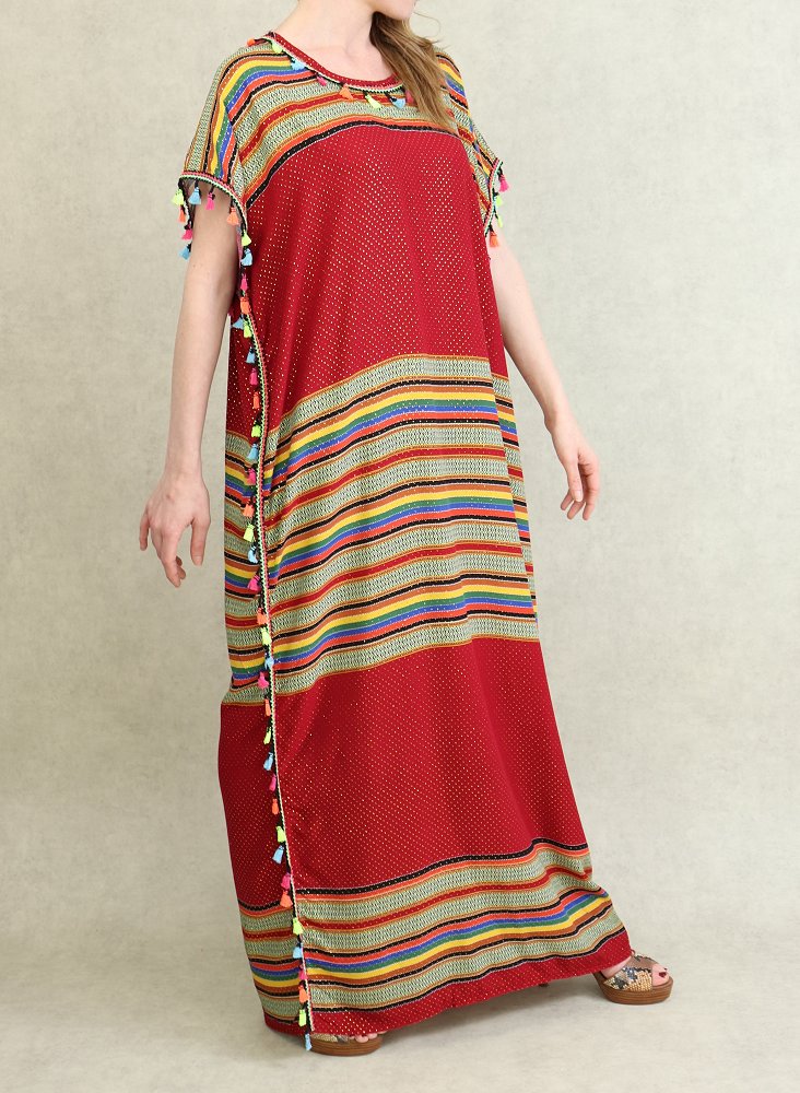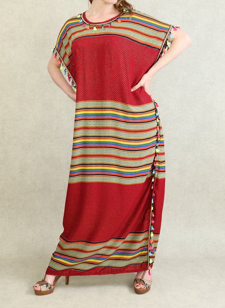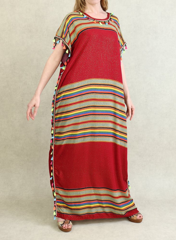 Robe orientale longue à rayures horizontales multicolores, mini-pompons sur toute la longueur et au niveau du col, paillettes brillantes sur toute la robe, coupe droite, col rond. On aime son tissu au toucher et un tombé fluide et confortable. Agréable robe d'été recommandée.