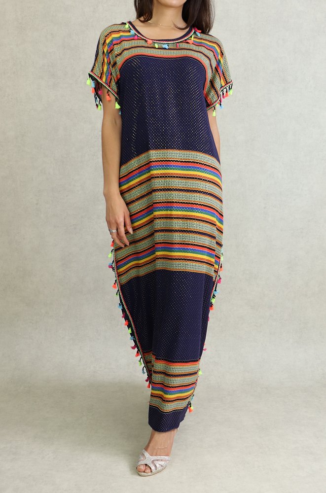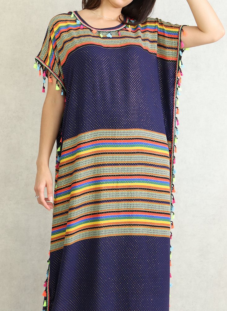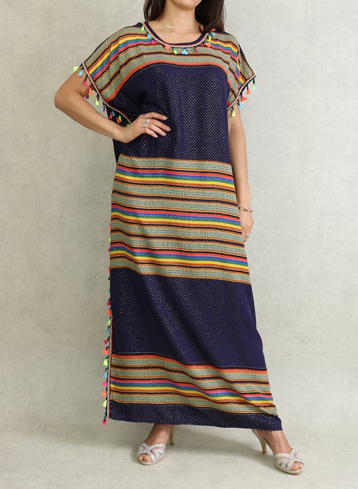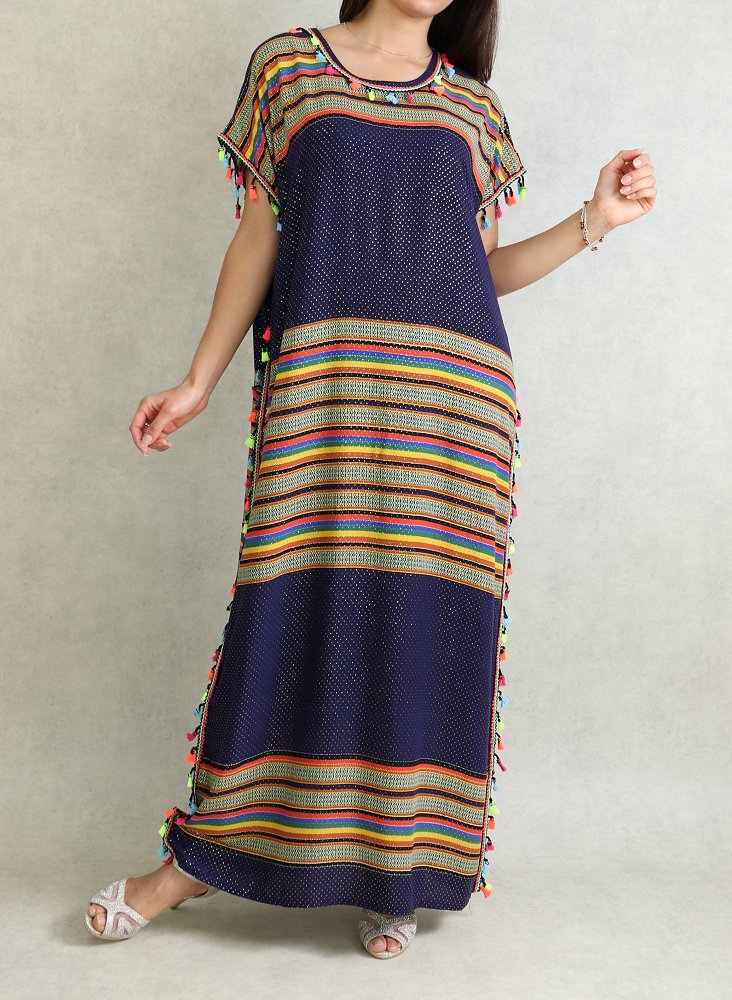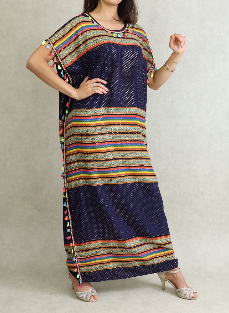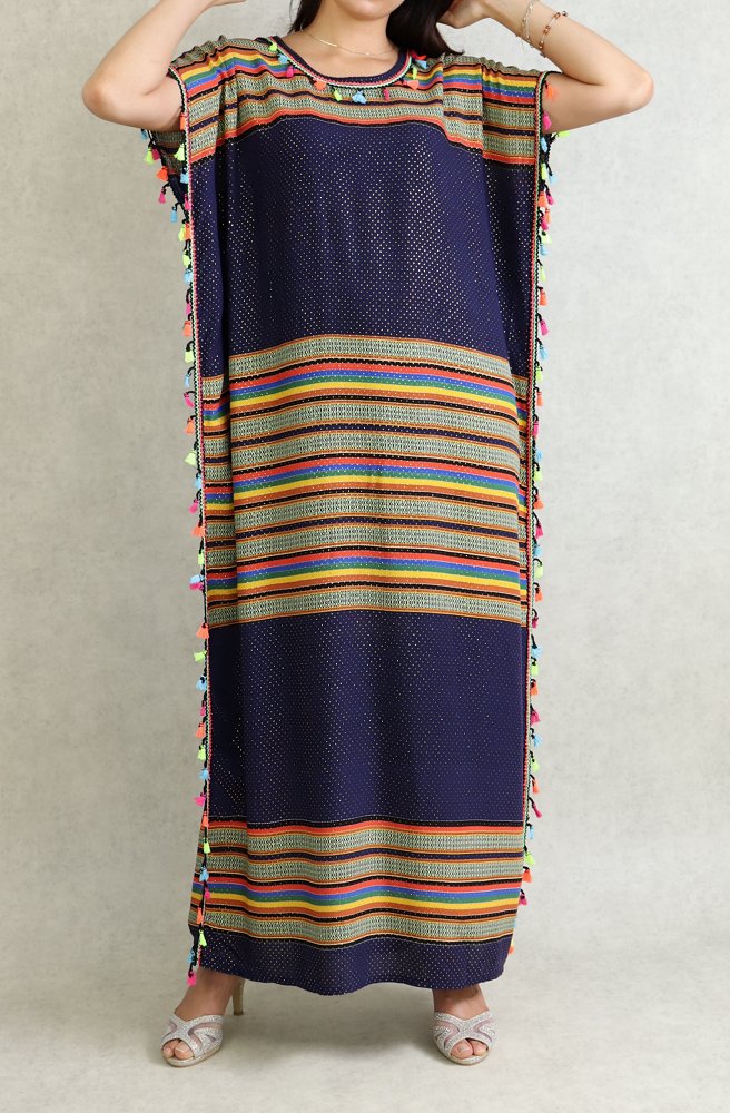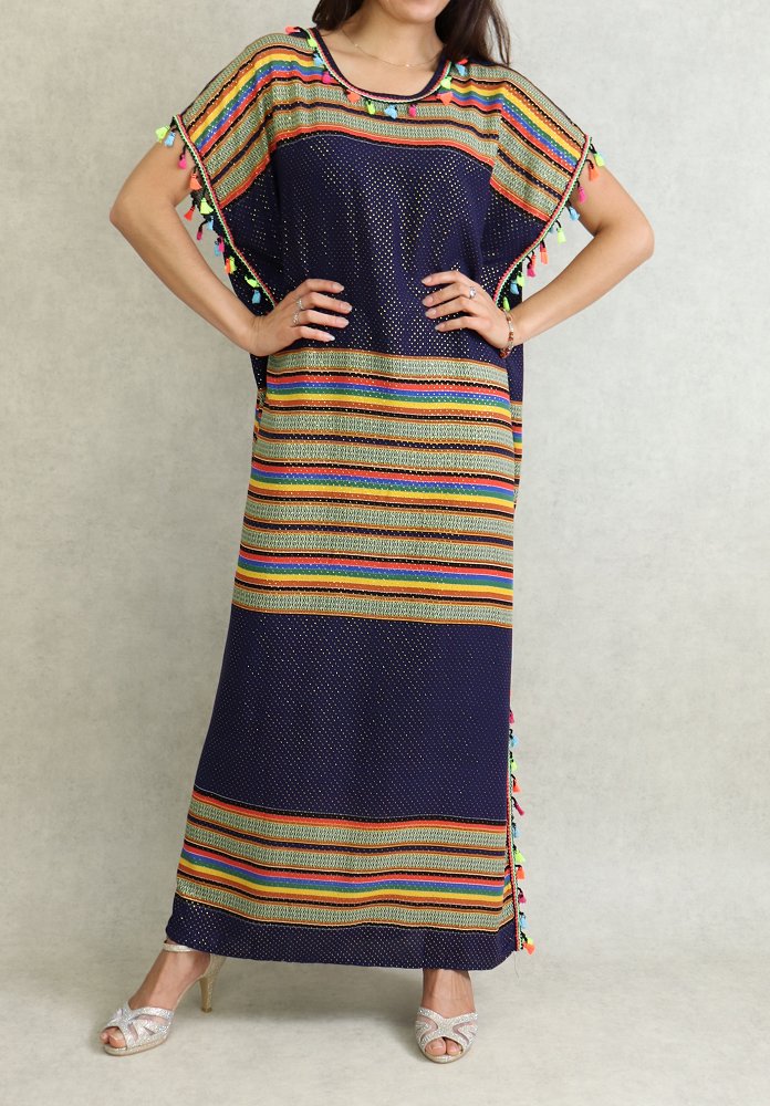 Robe orientale longue à rayures horizontales multicolores, mini pompon, paillettes brillantes sur toute la robe, coupe droite, col rond. On aime son tissu au toucher et un tombé fluide et confortable. Agréable robe d'été recommandée.