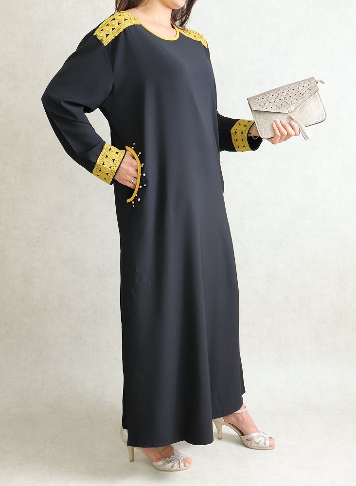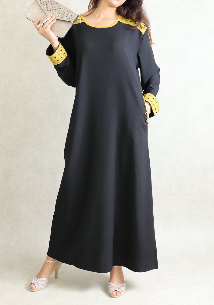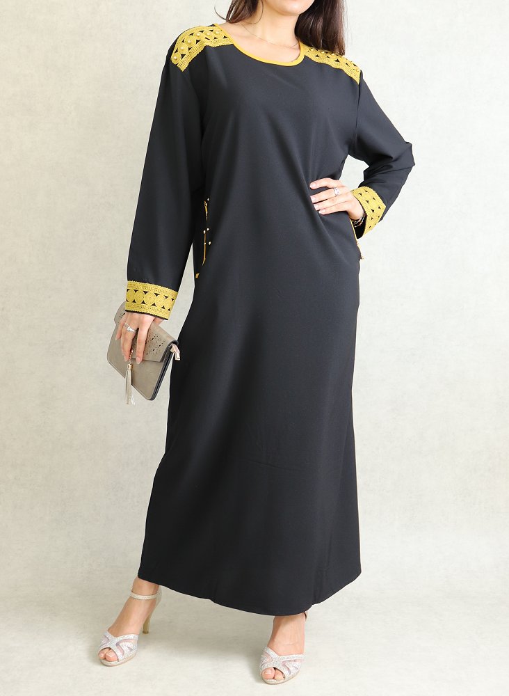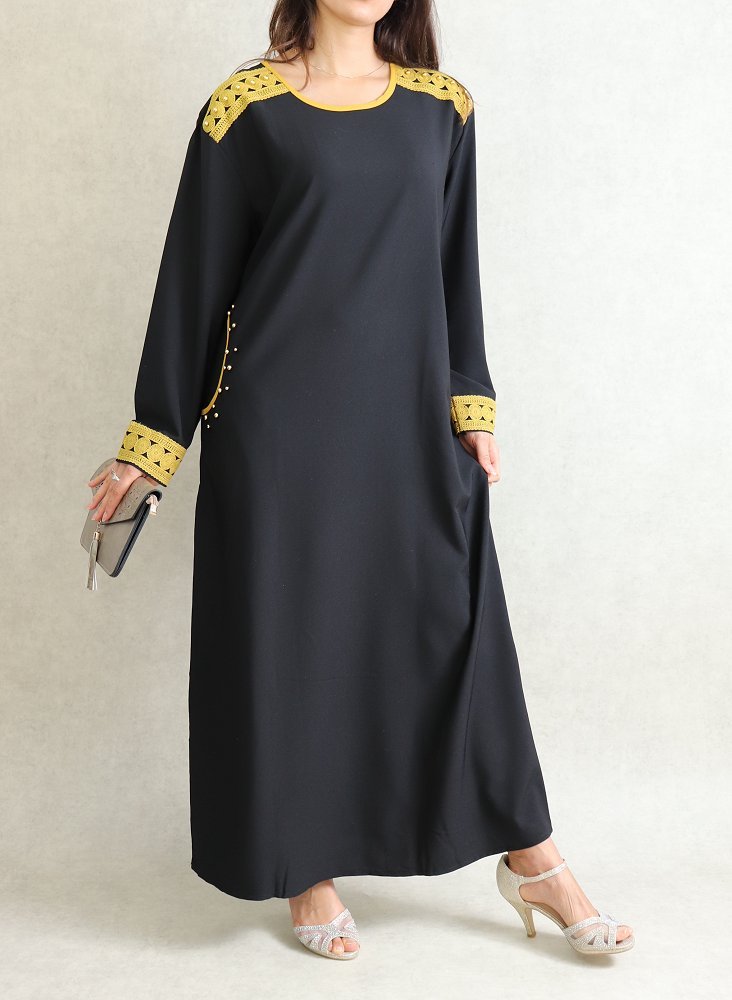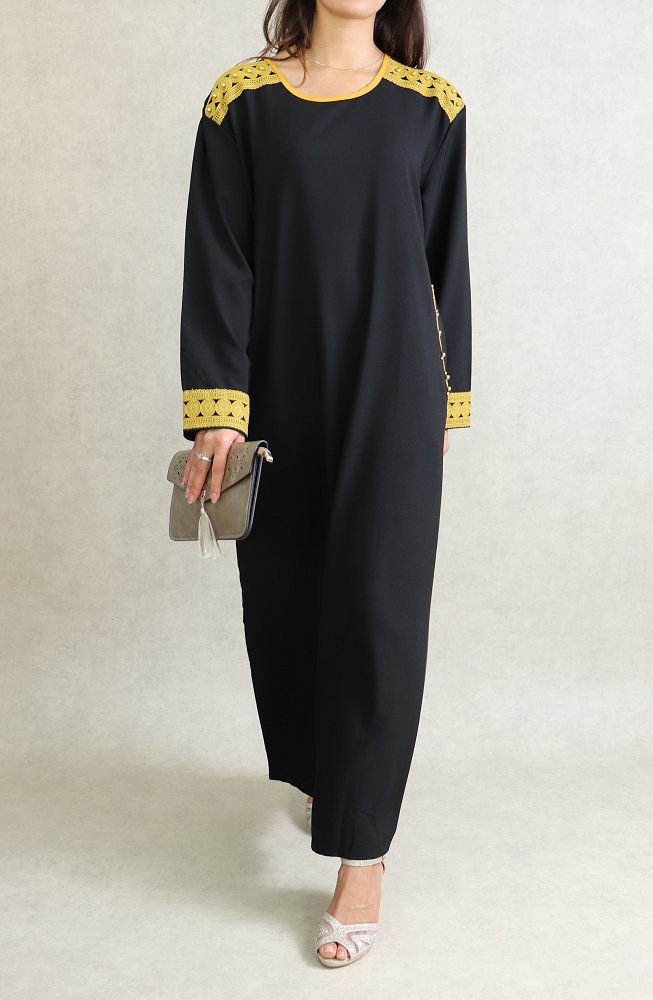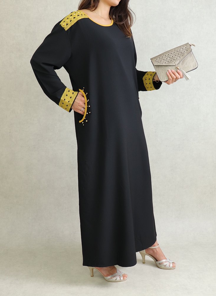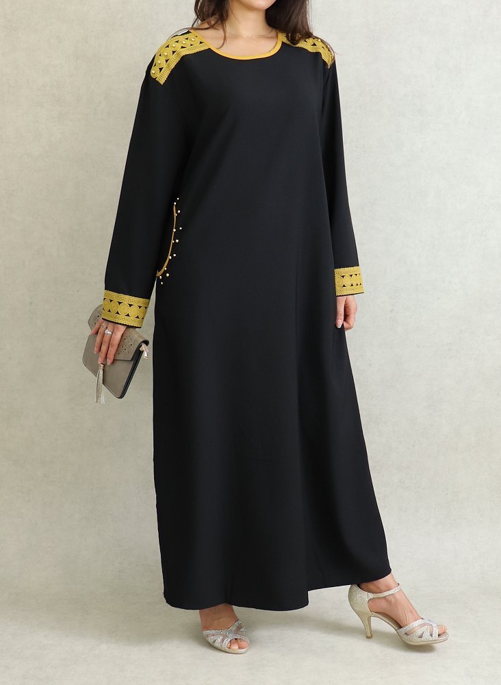 On est fan de cette robe, avec broderies jaune moutarde sur les épaules et au poignet. Ses deux poches disposées sur les côtés vous seront d'une grande utilité. Manches longues et perles au niveau des épaules et des poches...