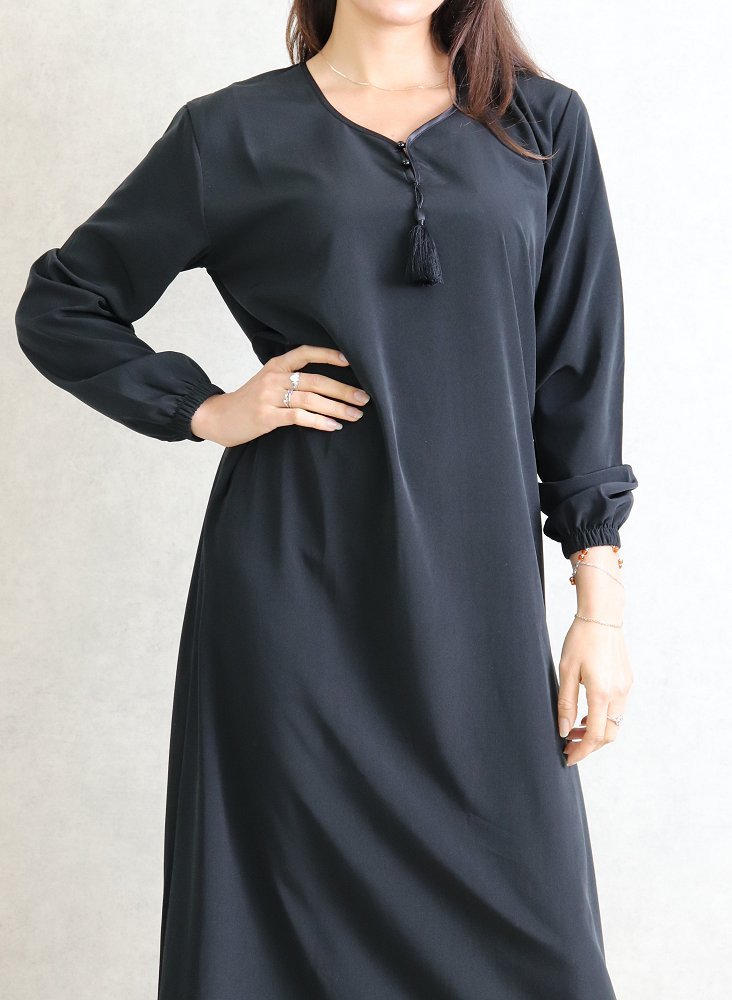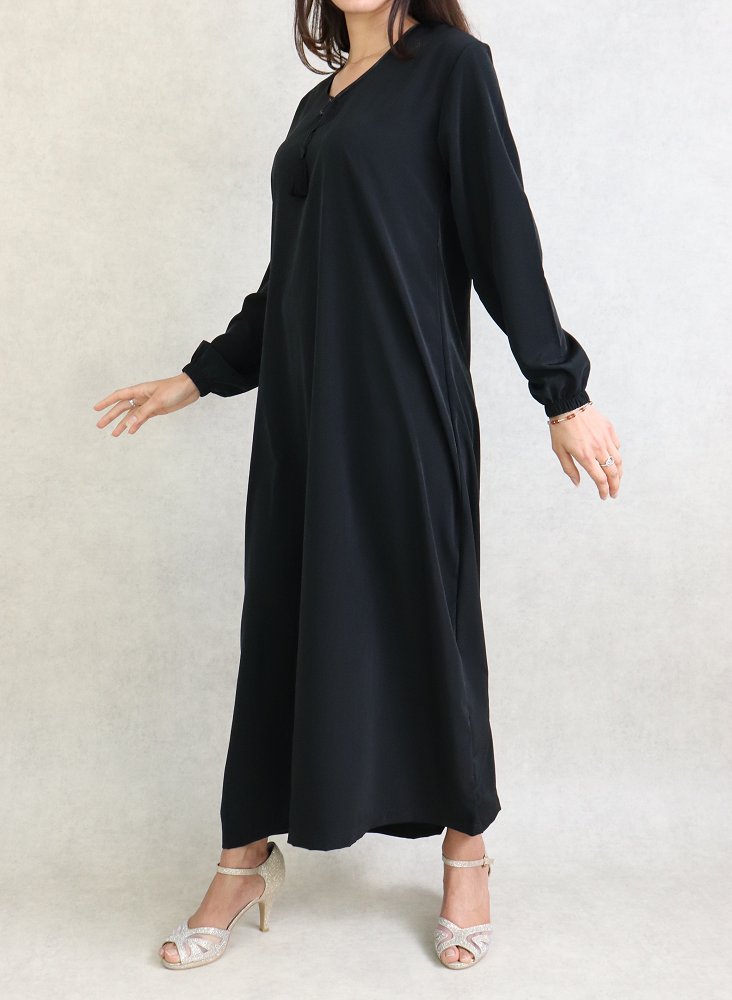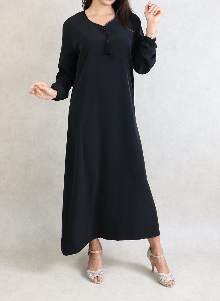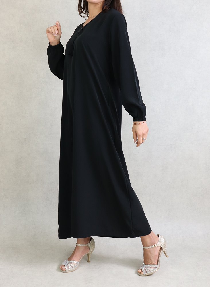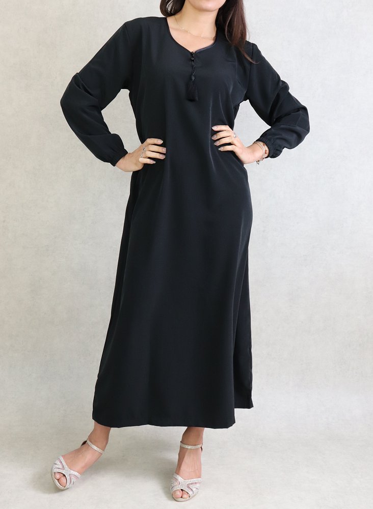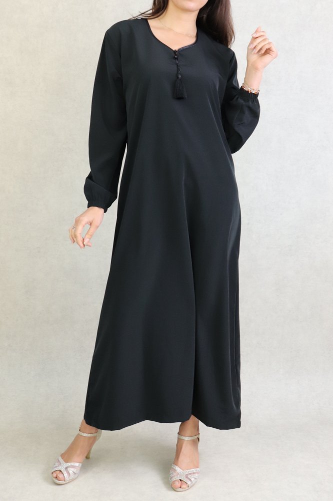 Robe orientale Abaya simple de la marque Al-Haya. Couleur unie, opaque, très beau tombé avec sa coupe évasée et sa fluidité qui lui donne de l’élégance. Belle qualité de tissu.