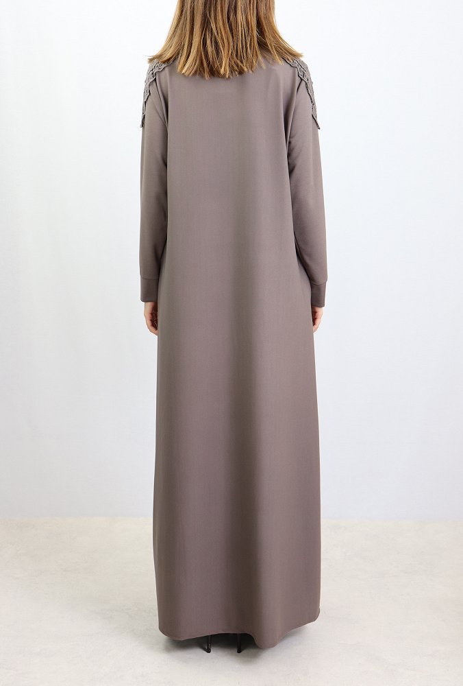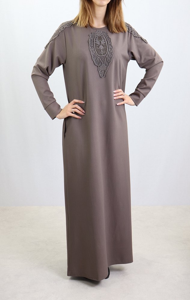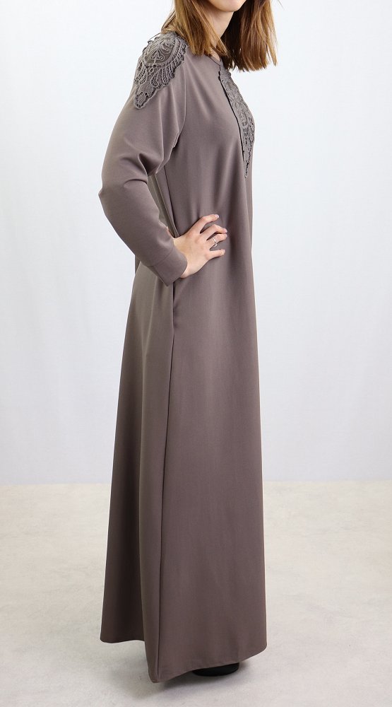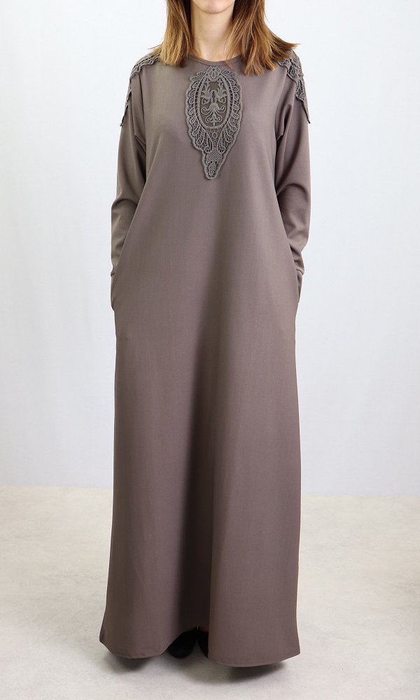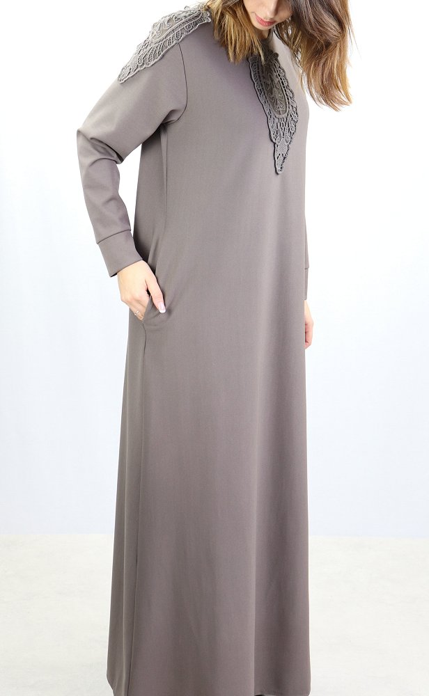 Robe très longue évasée de avec poches et broderies sur l'avant et les épaules. Tissu fluide, élastique et épais (non transparent).