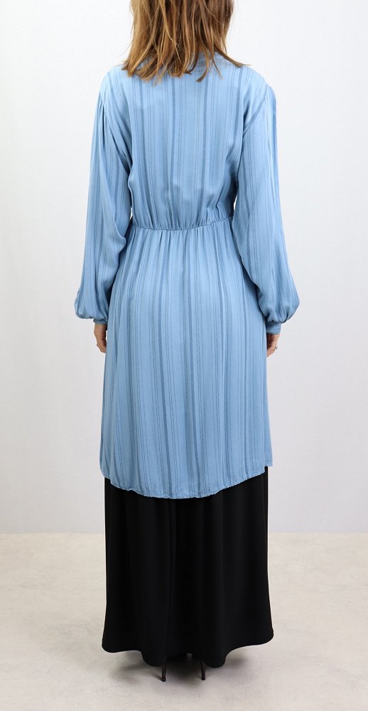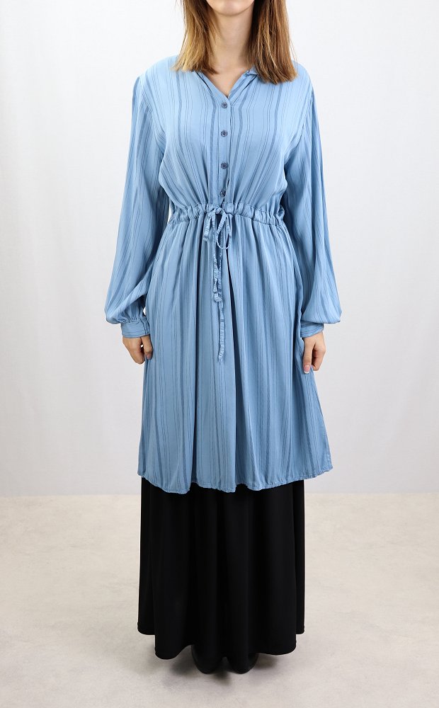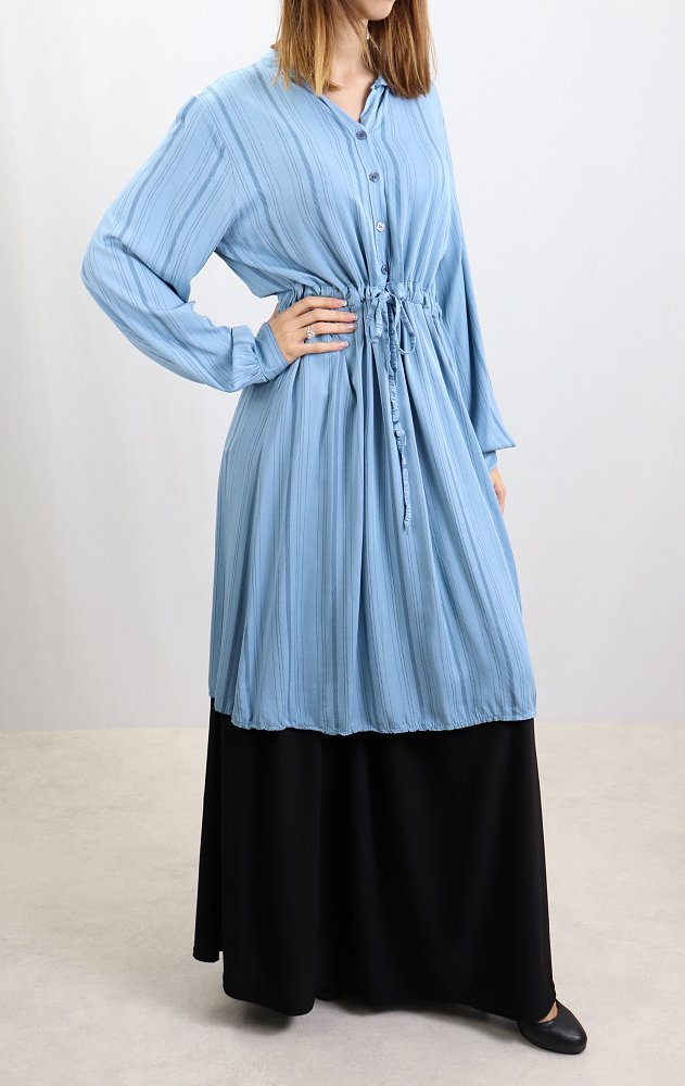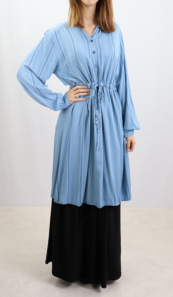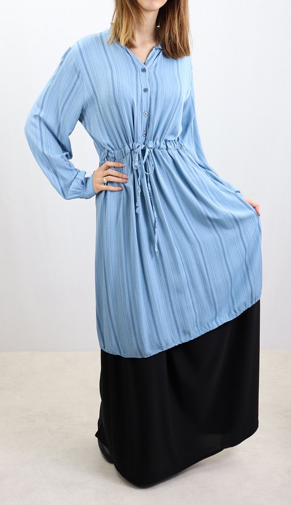 Tunique ample à manches longues, col mao, élastique au dos avec un lien de serrage à la taille, son tissu doux fluide.