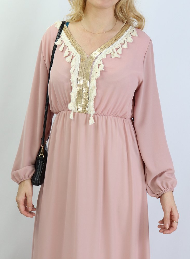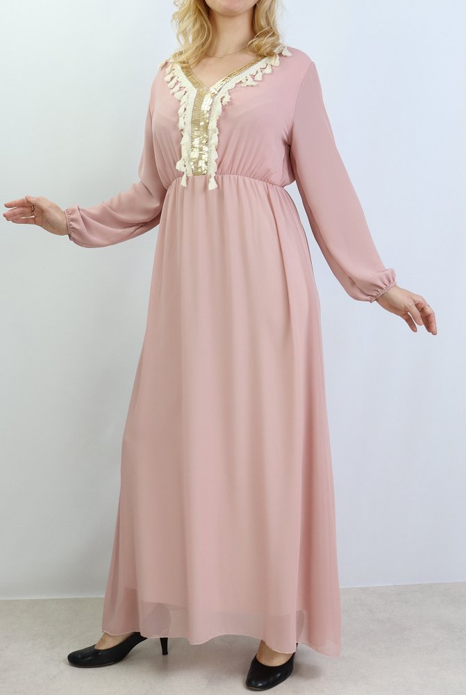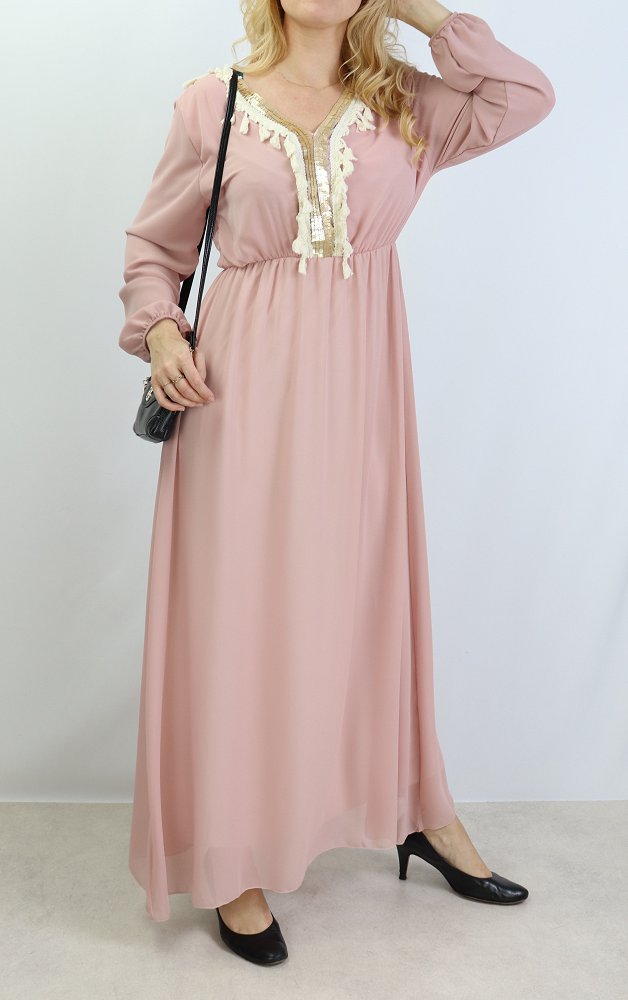 Très belle robe longue, entièrement doublée, col en V, ornée avec pompons et strass, taille élastiquée, manches longues poignets élastiques. Tissu de type mousseline.