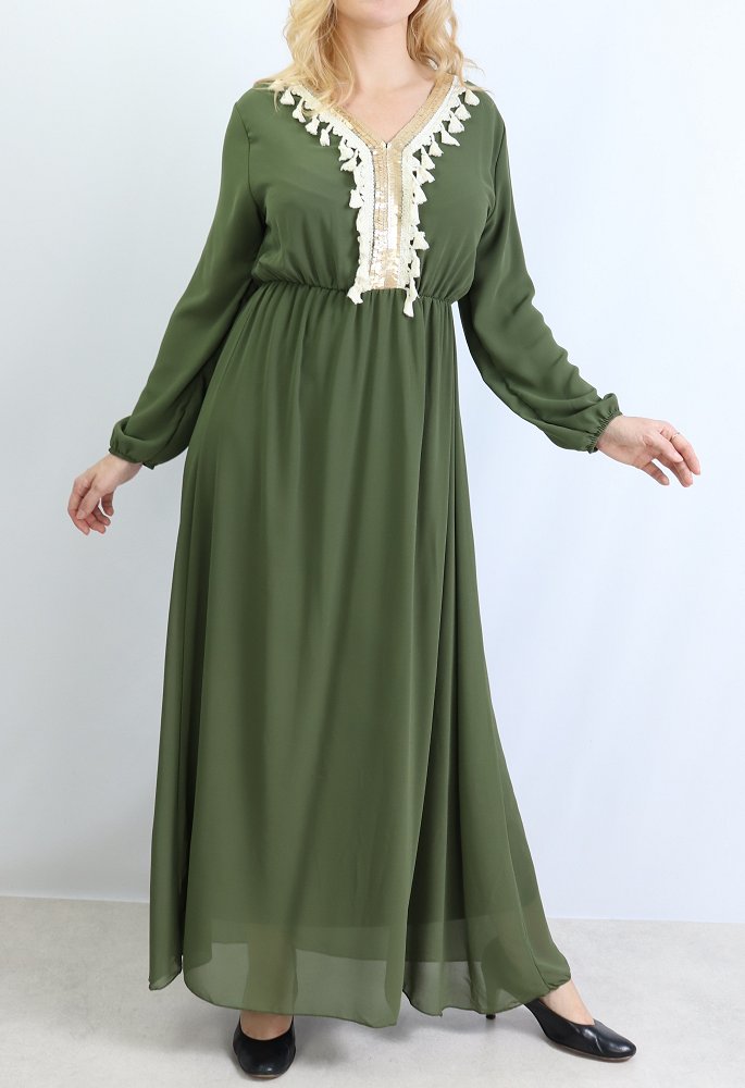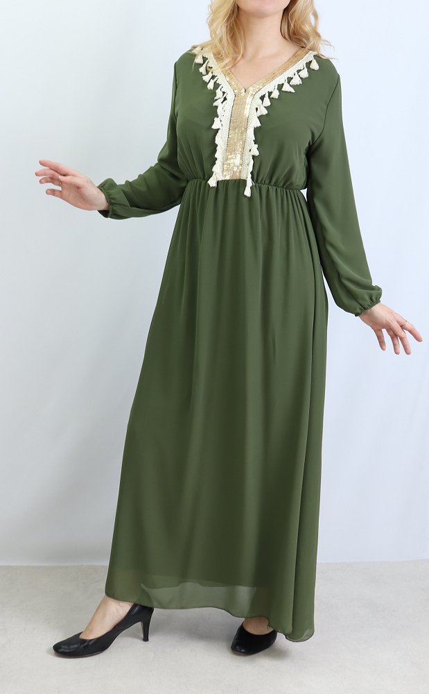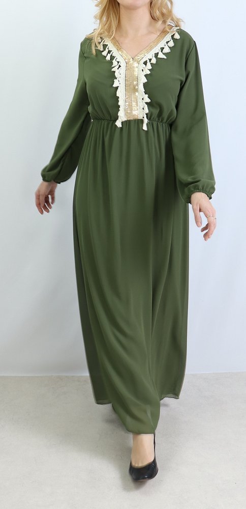 Robe longue fluide avec decorations dorees et pompons pour femme - Couleur kaki