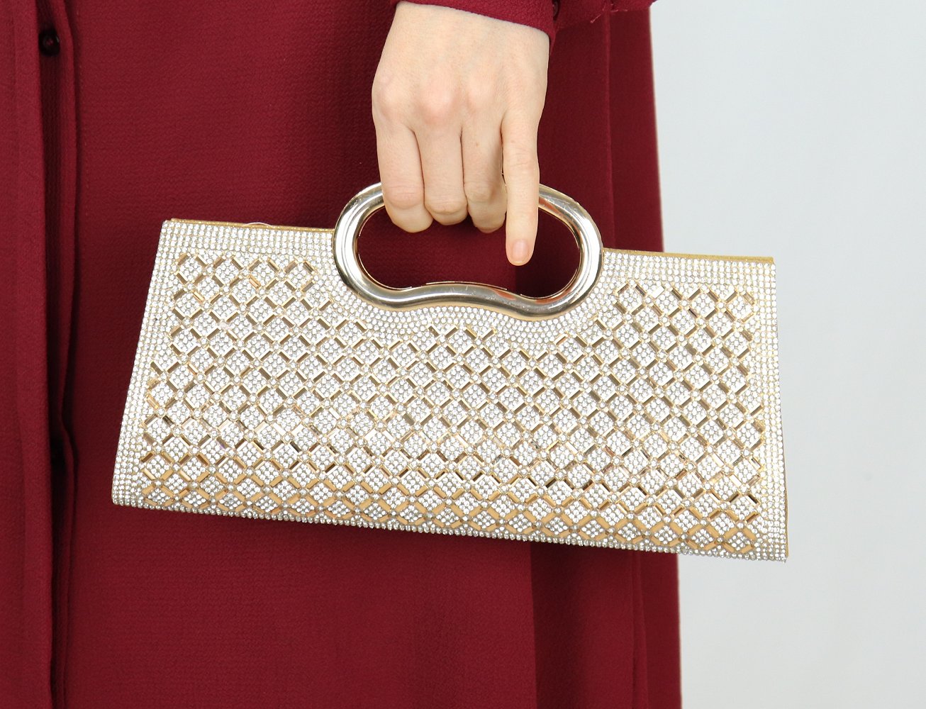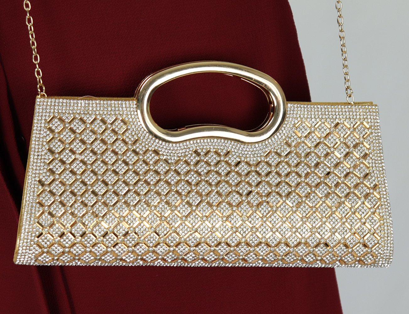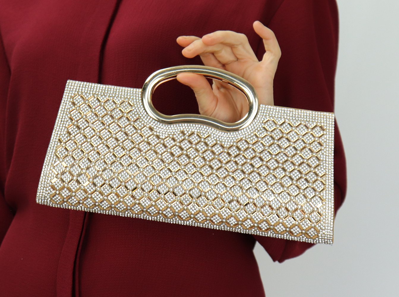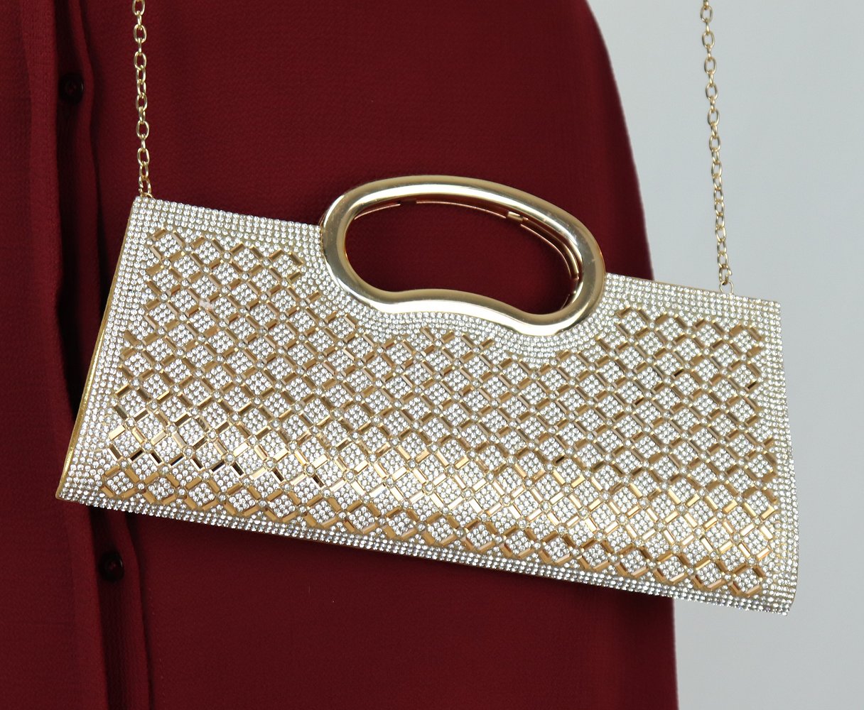 Sac à main femme entièrement recouvert de strass, anse métallique ronde pour soirée, mariage et fête - Couleur Champagne - REF. 32596 (25.00 €)